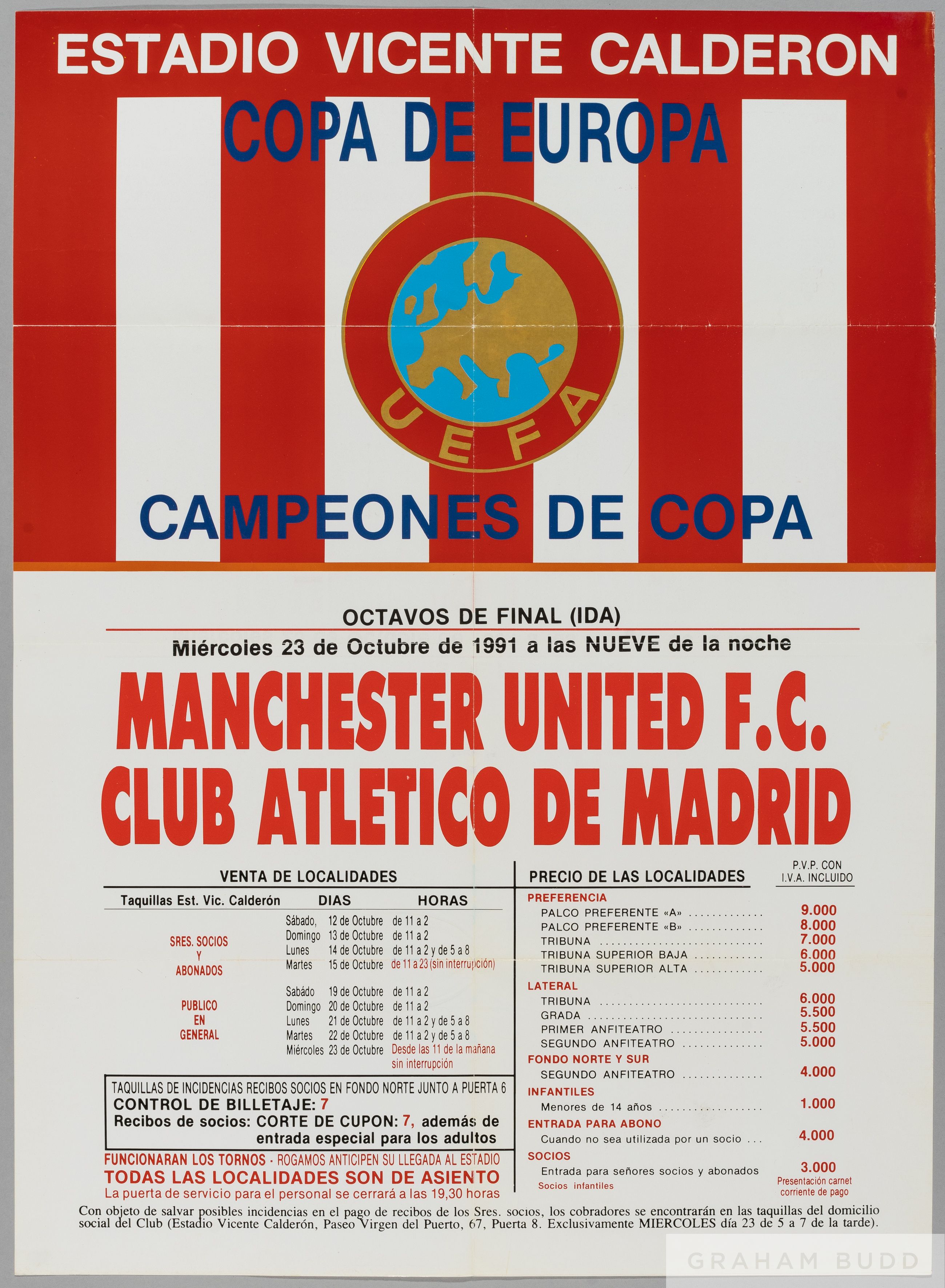 1991 Manchester United v. Atletico Madrid advertising poster from the Cup Winners Cup 2nd Round 23rd October 1991, 70 by 50cm