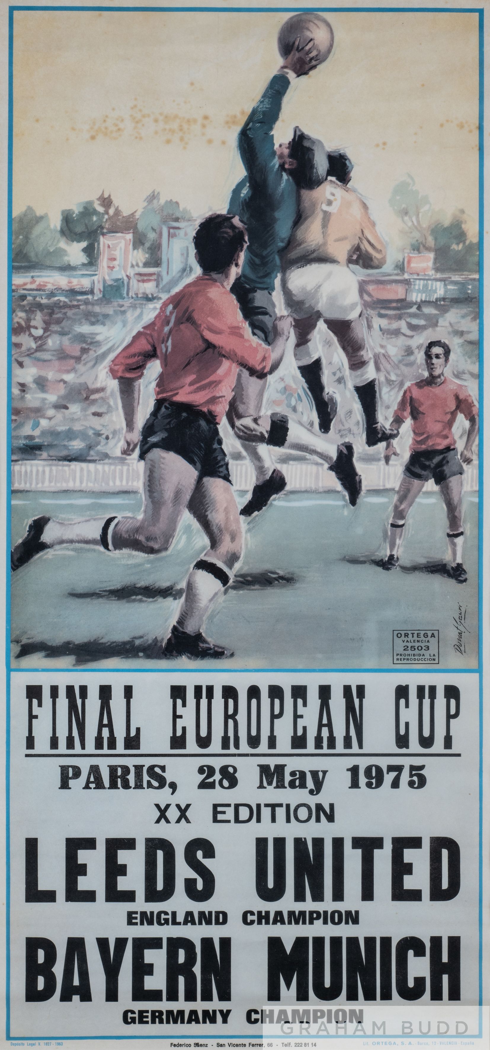 European Cup Final Leeds United v Bayern Munich, 28th May 1975 poster, large poster with pictorial football image above match details, Lit. Ortega, S.A. Barco, 12 Valencia, Espana, mounted, glazed and framed, 94 by 55cm. Overall condition is fair with foxing on print and creasing.