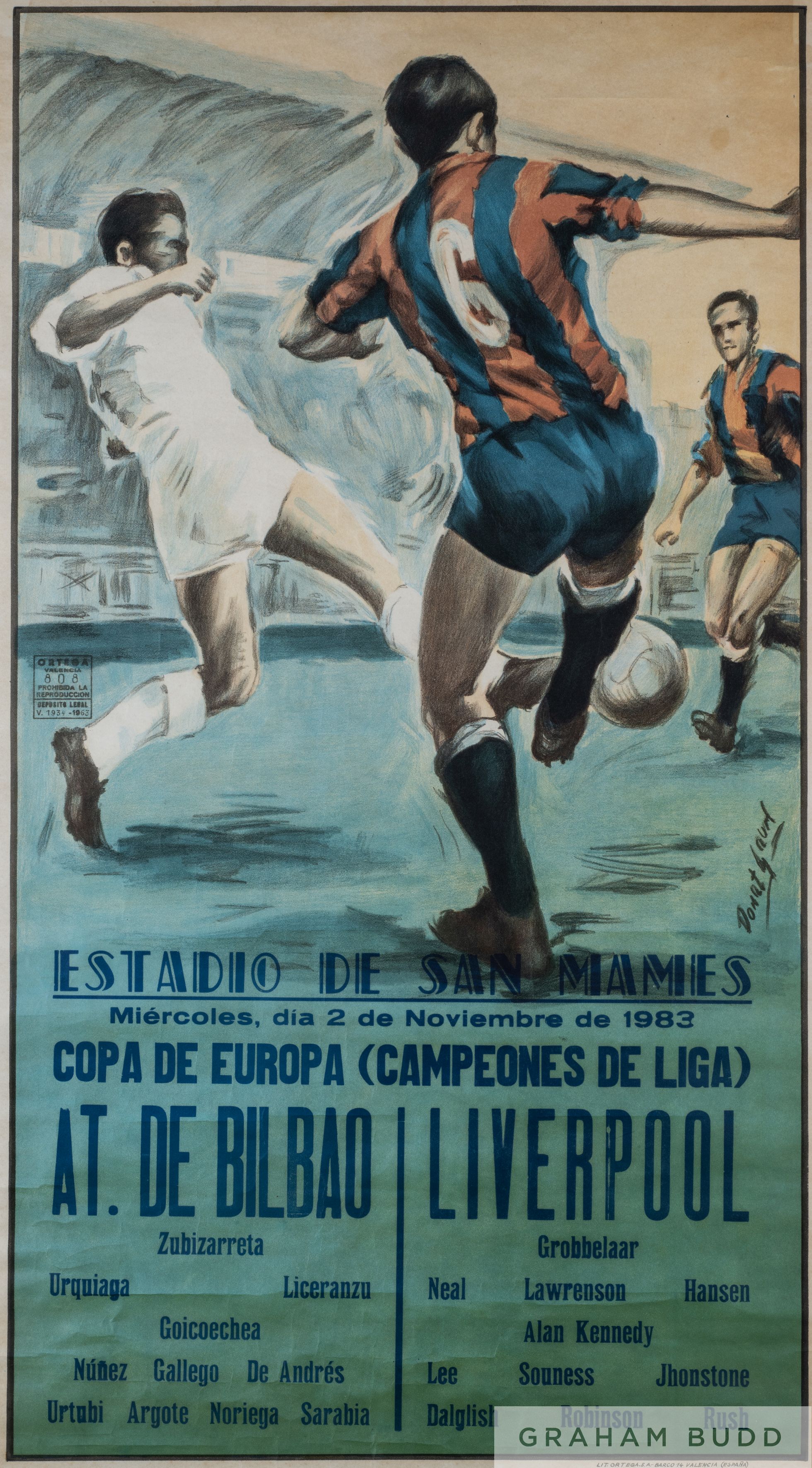 Copa De Europa Athletic Bilbao v Liverpool poster 2nd November 1983, featuring pictorial football image above match details with player names, Lit. Ortega S.A. Barco 14 Valencia (Espana), mounted, glazed and framed, 117 by 74cm. Overall condition fair with creases and folds, with foxing.