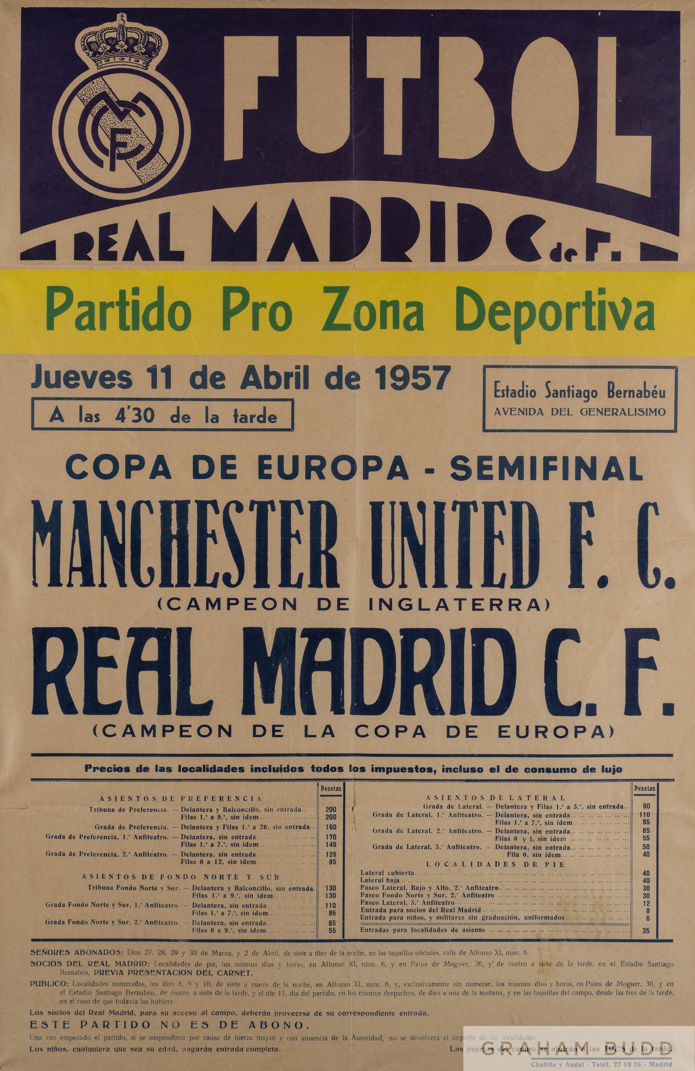 Original advertisement poster for the Real Madrid v Manchester United European Cup semi-final played at the Bernabeu 11th April 1957, three colour printing, extensive details of the the forthcoming match including ticket prices etc., mounted framed & glazed, overall 83 by 61cm., good condition Real Madrid won this match 3-1 and the tie 5-3 on aggregate, and would go on to lift the trophy. 1956-57 was the first season when an English team entered the competition.