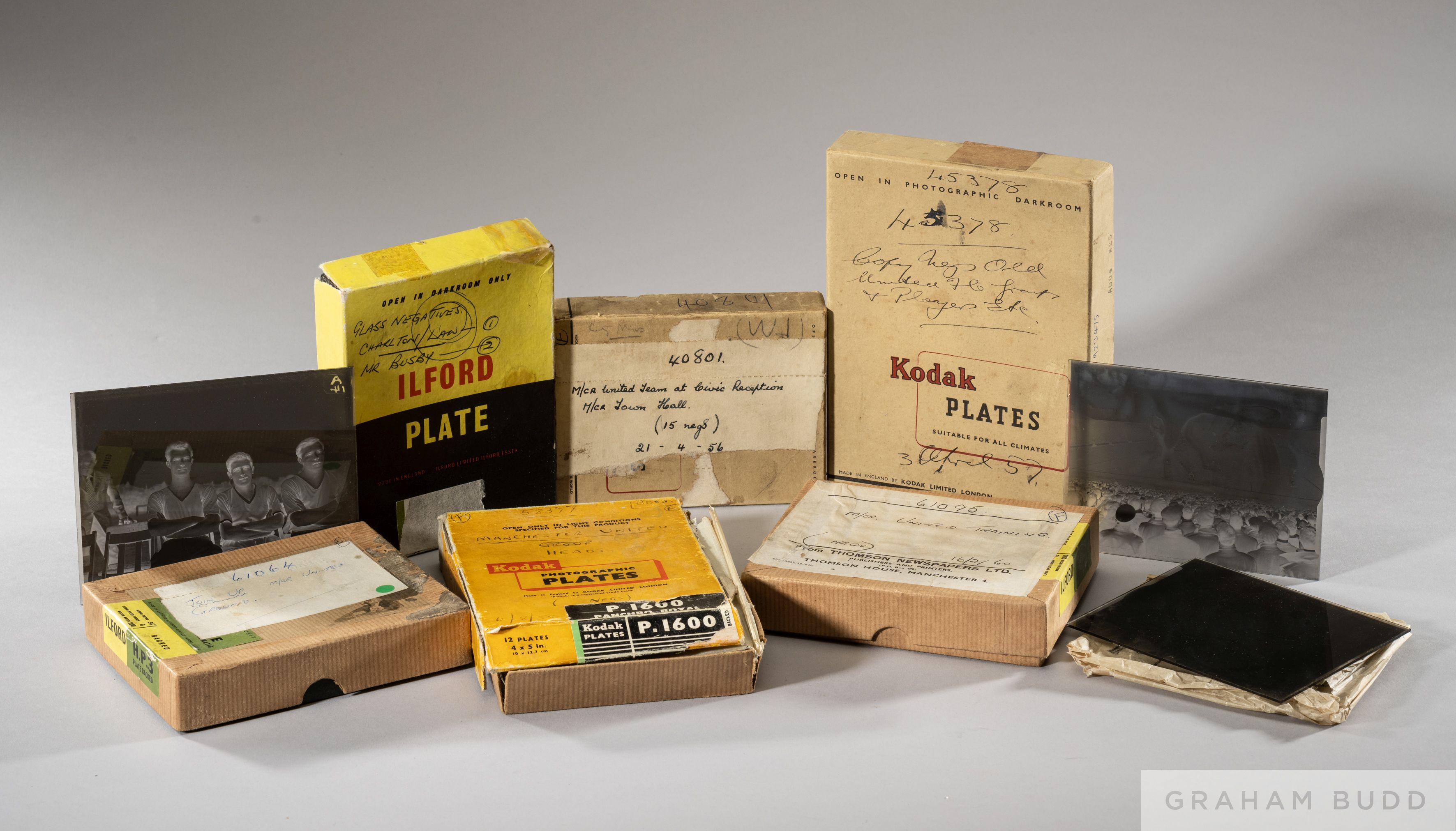 A rare collection of sixty Manchester United related glass plates, 1950-60s, Box A from Thomson Newspapers, 1960, comprising eleven glass plates, depicting eight interior and exterior training examples at Old Trafford showing Bobby Charlton, Harry Gregg, Alex Dawson, Jack Crompton etc and three in the physio room with Ted Dalton Box C, April 1957 comprising eleven glass plates including Billy Meredith press library images and other vintage examples and some player profiles Box D, comprising eight glass plates match day at Old Trafford with crown scenes and match play, 1950s Box F, May 1956 comprising thirteen player profile glass plates each plate depicting three players including Stiles, Viollet, Charlton, Cope, Gergg, Heron, Bolton Spratt, Moragn, Goodwin, Smith, Lawton etc Box G, comprising fifteen glass plates including Manchester United Civic Reception Manchester Town Hall, 21st April 1956, to celebrate the 1955-56 Division 1 League Championship including trophy lift, Open Top Bus, Group Speeches etc Box J, comprising two glass plates of Matt Busby, one seated at his desk the other taken on the pitch (60)