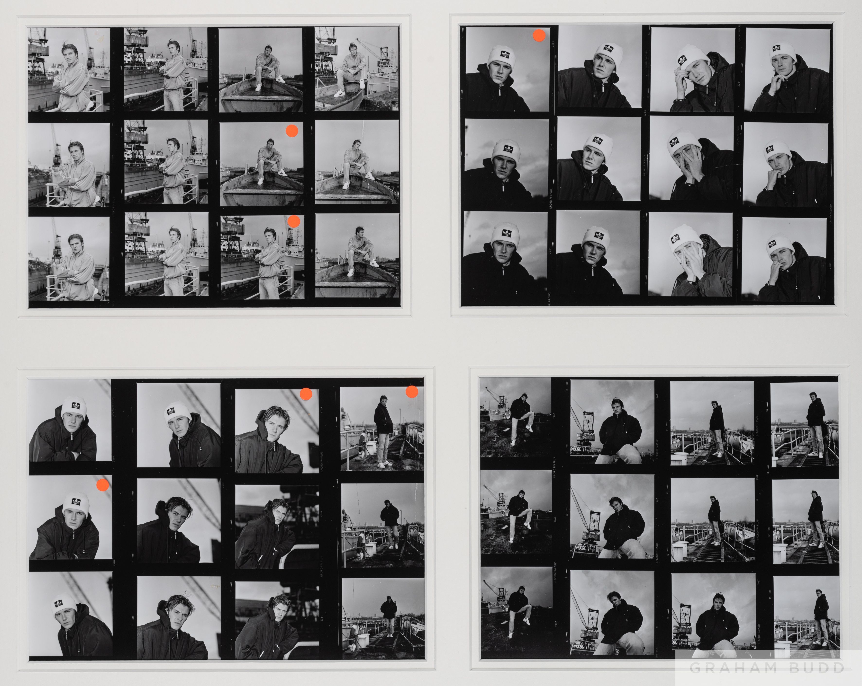 A framed display of black and white negatives of David Beckham from a Adidas ad campaign, in common mouth, 58 by 68cm framed and glazed