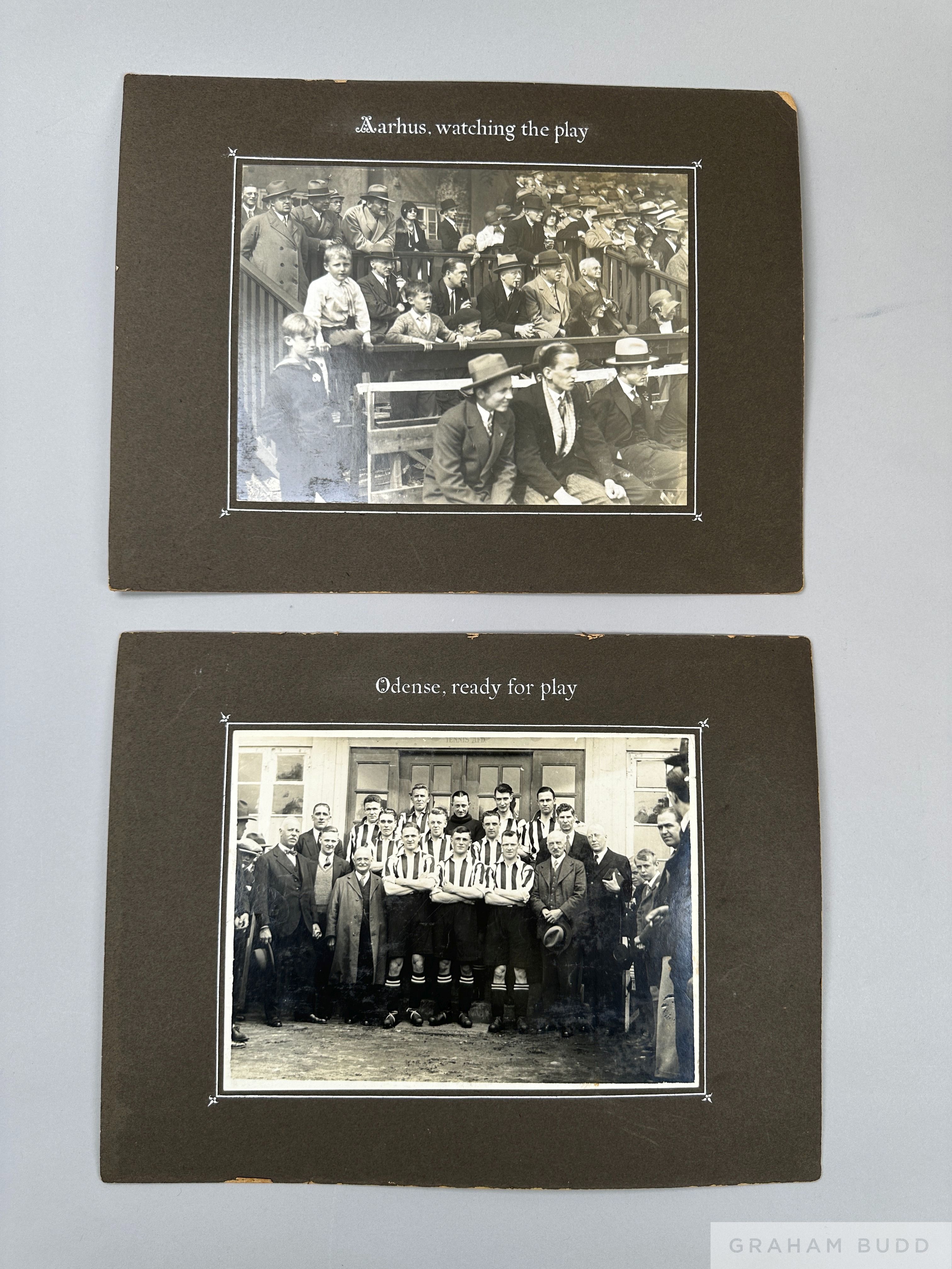 Southampton FC 1930-31 tour to Denmark, large album pages neatly laid out and annotated of original photographs from tour laid down to large mount, some back to back, include team and officials at Odense before match on rear, team leaving dressing room to play Aarhus, both excellent. Images of players 9 x 7in., also directors box Aarhus showing VIP's watching match 9 x 7in.. on rear six images of team at Aalborg and at Leisure Bokhns Sands, rare images of tour, (approx. 21)
