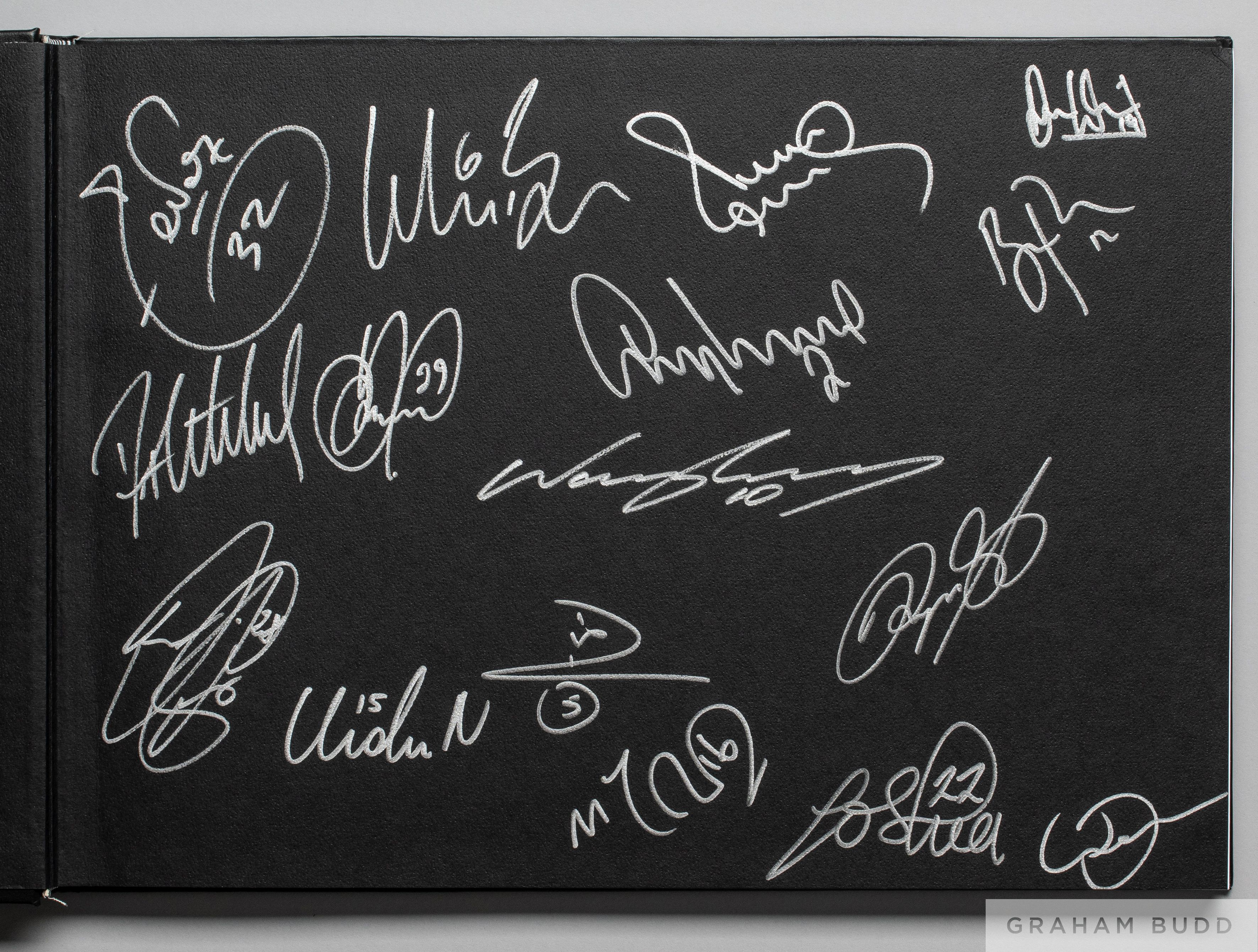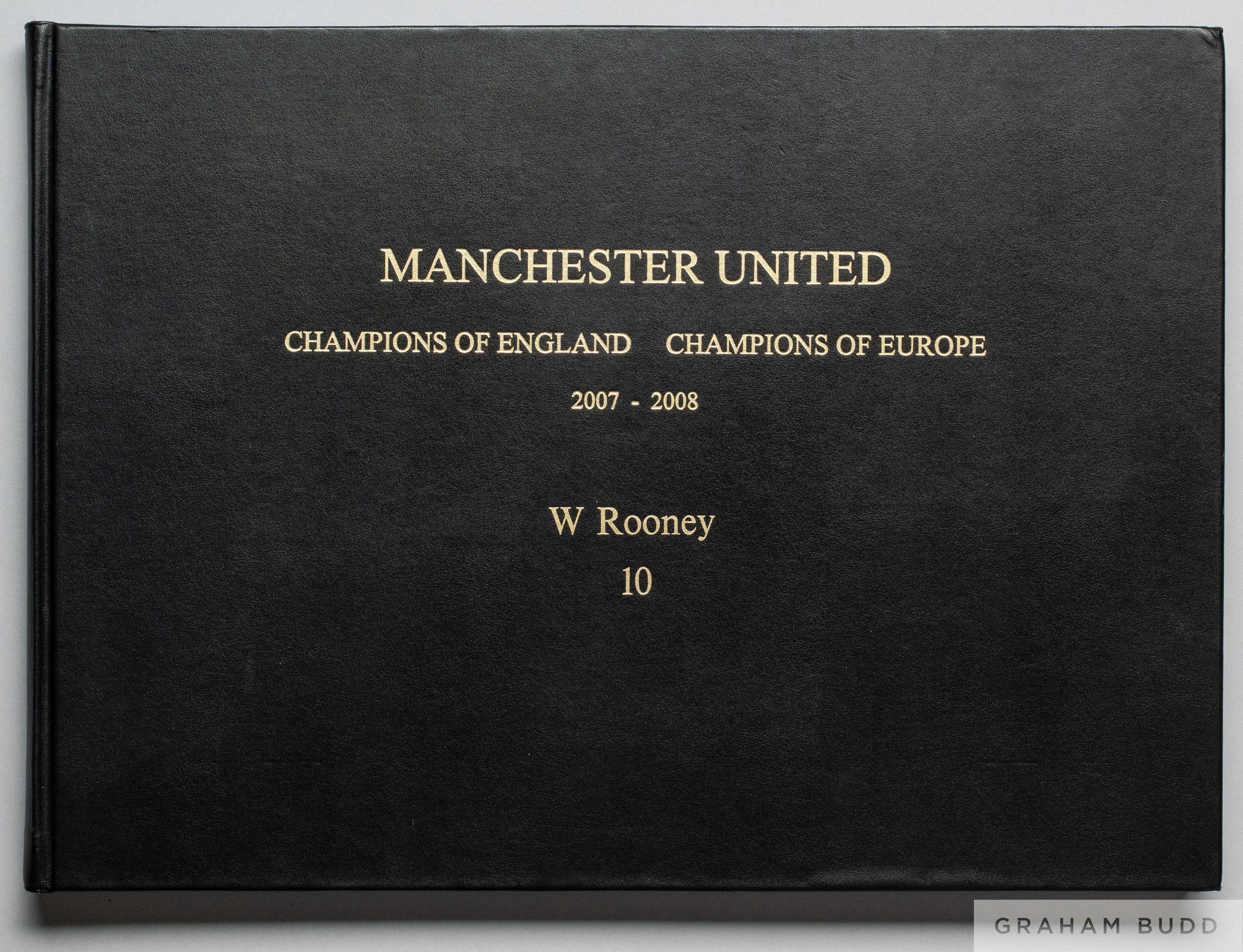 Manchester United Champions of England Champions of Europe 2007-2008 limited edition souvenir photograph album this example with personalised cover stamp for Wayne Rooney, numbered 110/142, front paper bearing facsimile autographs, 128 pages, coffee-table style publication with a photographic review of the 2007-08 season, black cloth cover with gilt titling, 31 by 43cm.