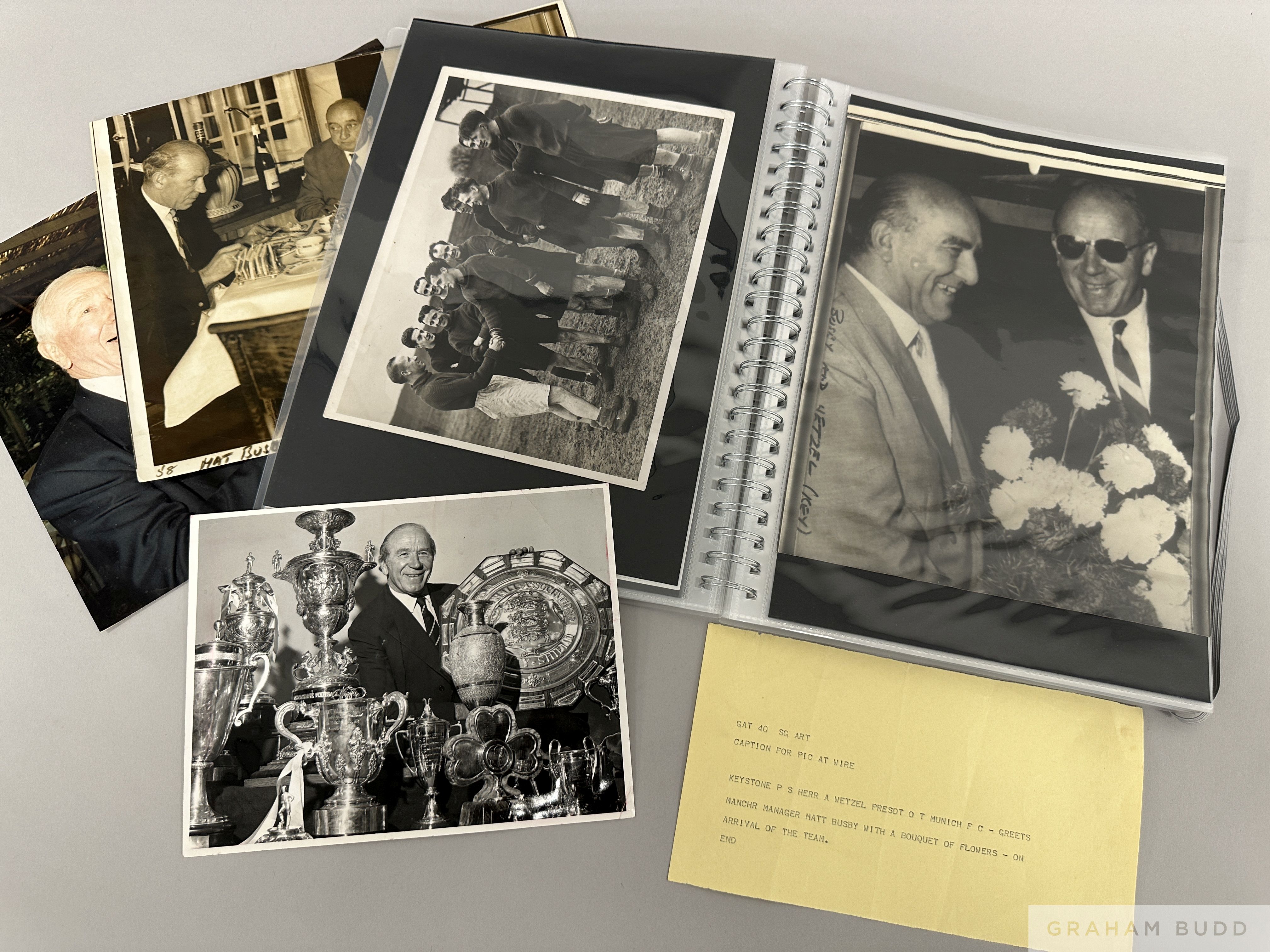 A file of 28 press photographs relating to Manchester United's legendary manager Sir Matt Busby, mostly b&w, various sizes, subjects including Busby together with George Best, Bobby Charlton, Denis Law, Lady Busby, club directors, the occasion of his Knighthood, on the training ground, in hospital in Munich, in the Old Trafford trophy room, celebration events, meeting Prime Minister Harold Wilson etc.