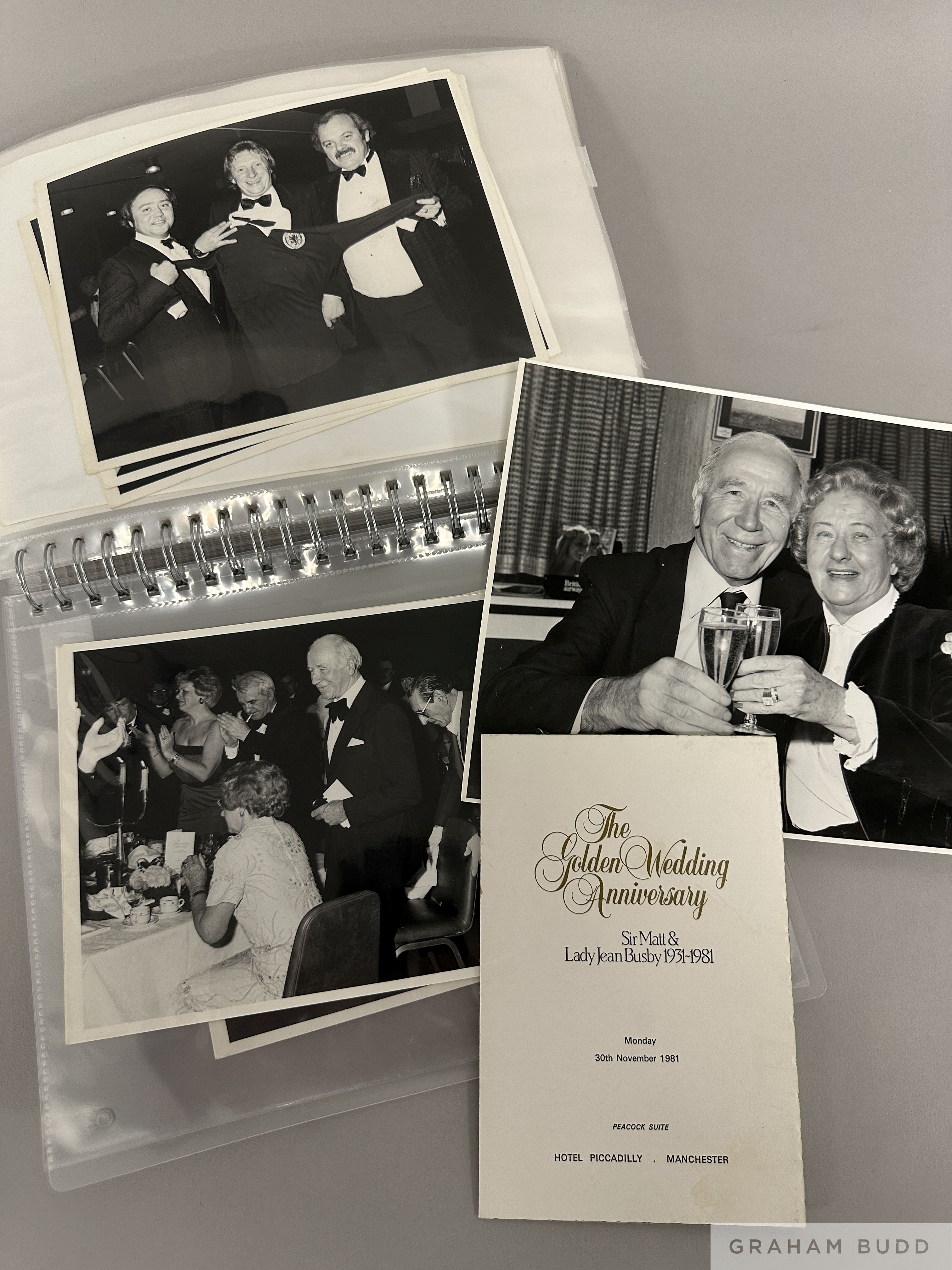 Photograph album from the occasion of the Golden Wedding Anniversary of Sir Matt & Lady Jean Busby 1931-1981, over 50 photos, b&w and colour, some duplication, many guests featured including family members, the players Law, Charlton, Crerand, also Ron Atkinson, Jimmy Tarbuck and others also containing a printed menu
