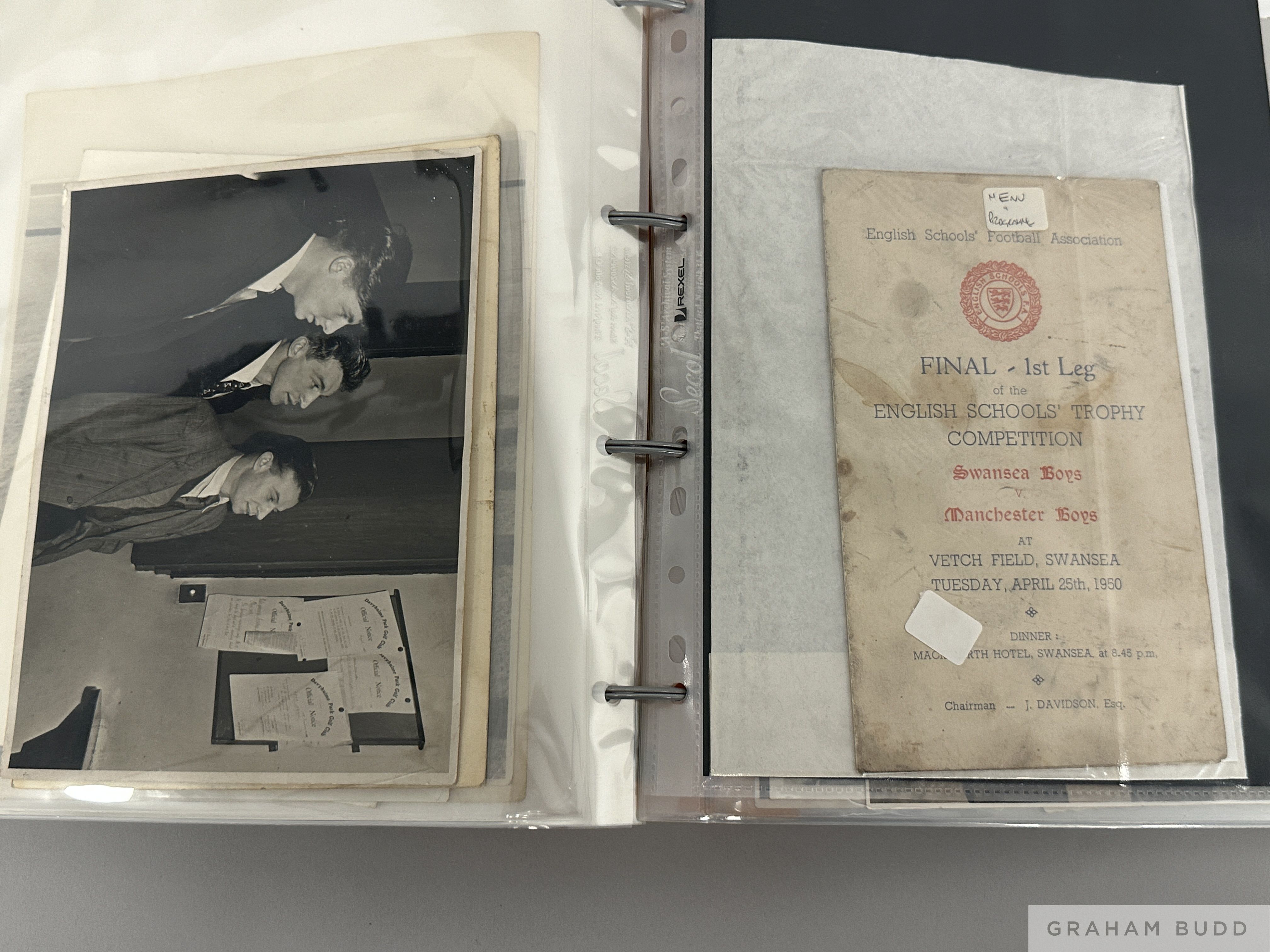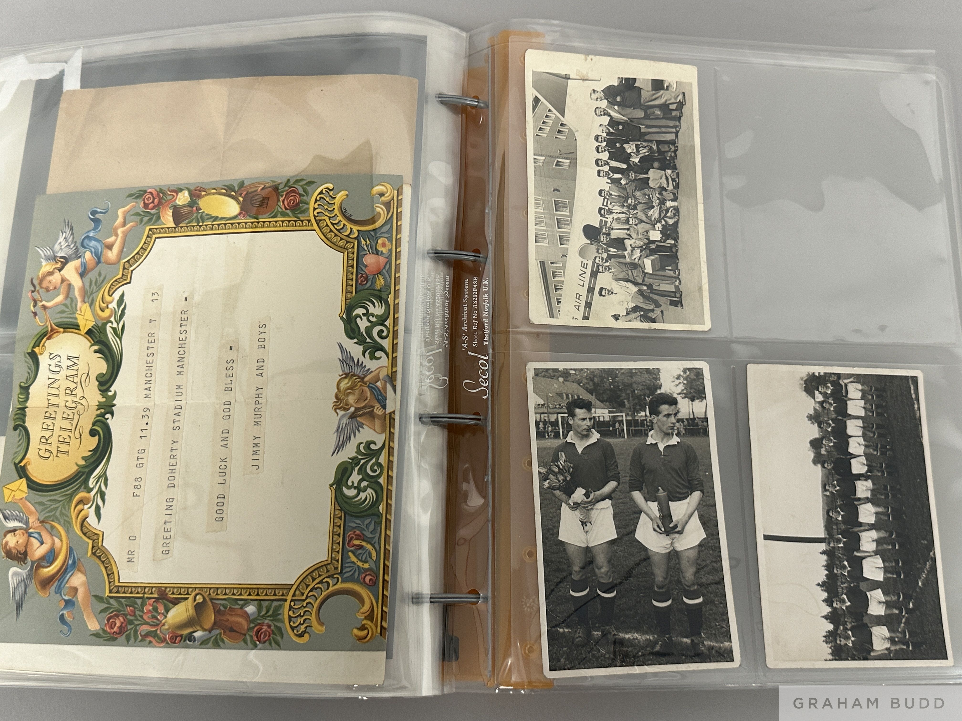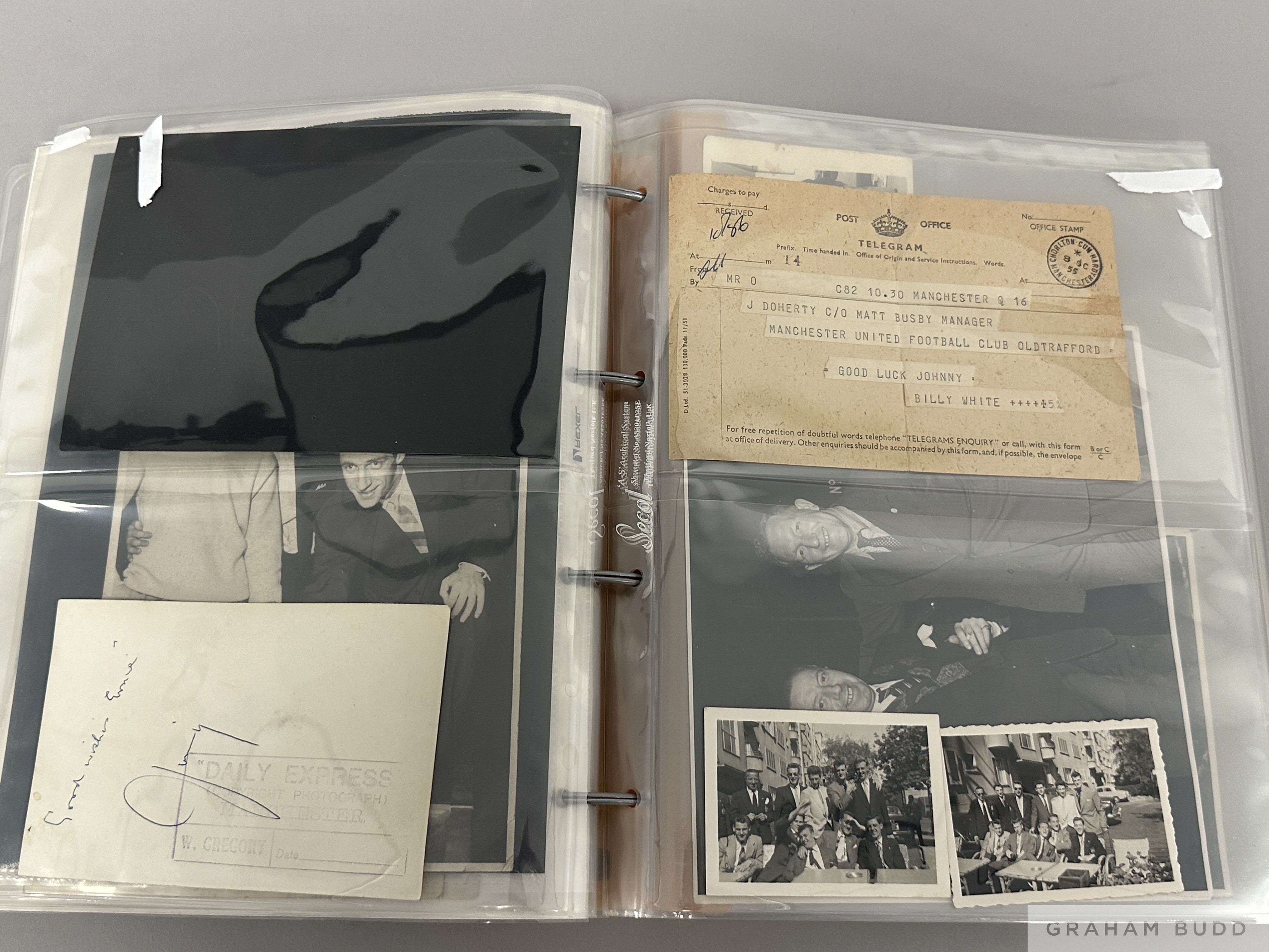 Photographs and ephemera originally owned by the Manchester United 'Busby Babe' John Doherty, 12 b&w photographs, some privately taken, and 3 postcards, various sizes and subjects including team-groups, scenes Old Trafford, training, leisure time with players etc.; the collection also including an autographed menu for the English Schools' Trophy Final (1st Leg) Swansea Boys v Manchester Boys played at the Vetch Field 25.4.1950 (Doherty played), a telegram sent by Jimmy Murphy on the occasion of Doherty signing for United, and a further telegram sent to Doherty c/o the club in 1955 (18 items)