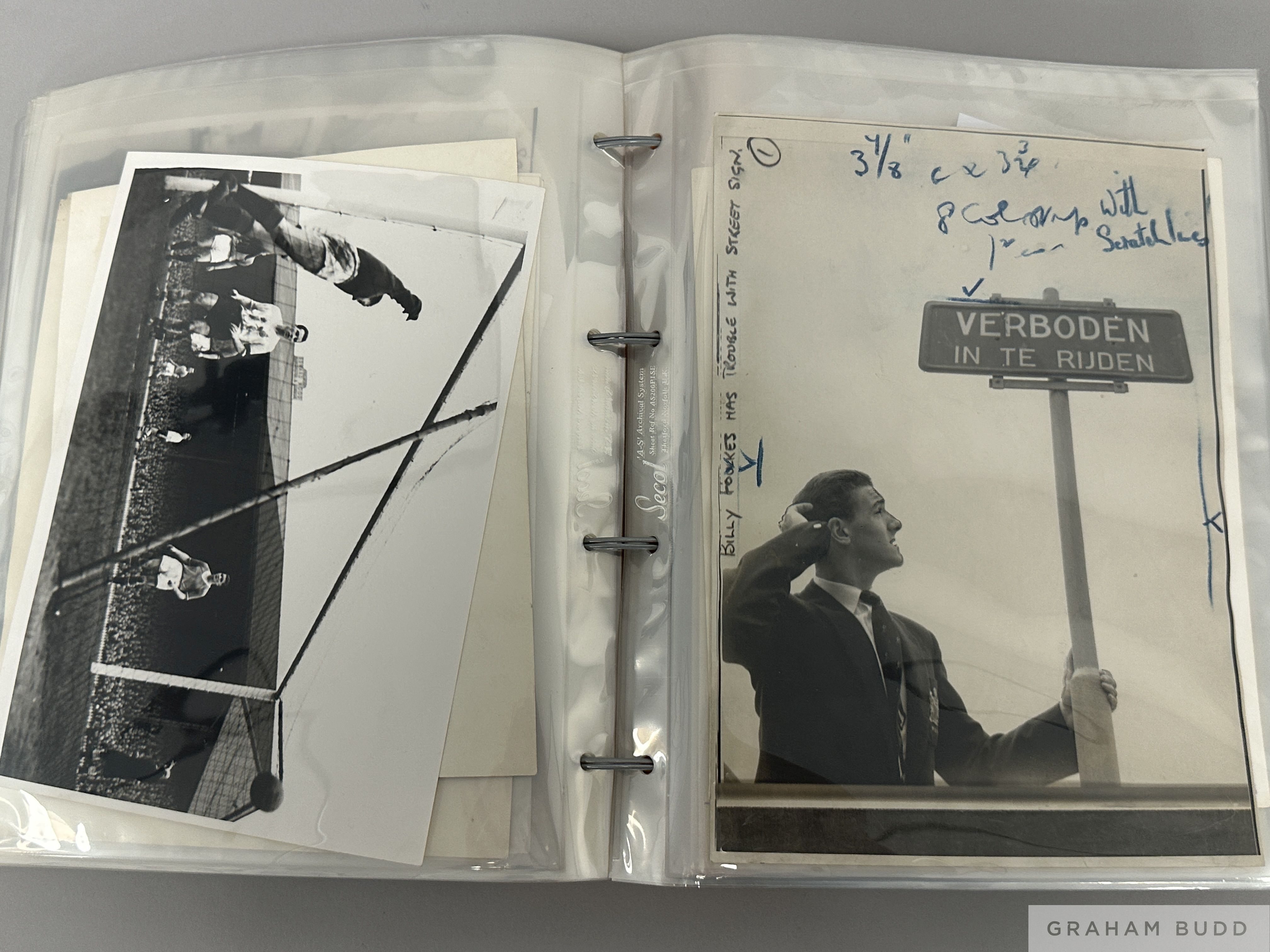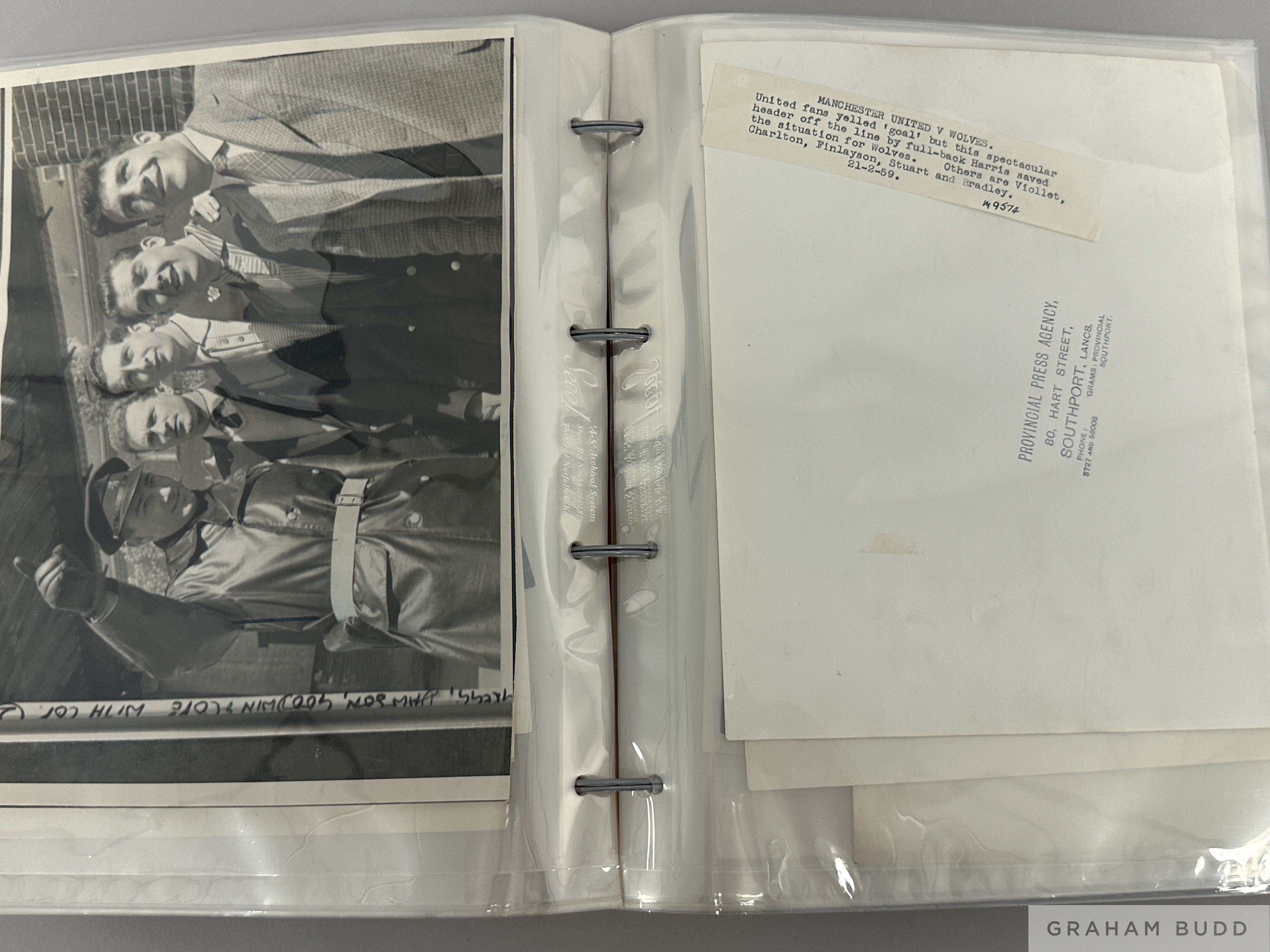 Collection of 38 Manchester United 1950s press photographs, b&w, various sizes, mostly match action, some player portraits and other subjects, more unusual examples including United playing friendlies in Europe v Feyenoord and Hamburg, a dog on the pitch at Old Trafford interrupting a match v Fulham, (38)