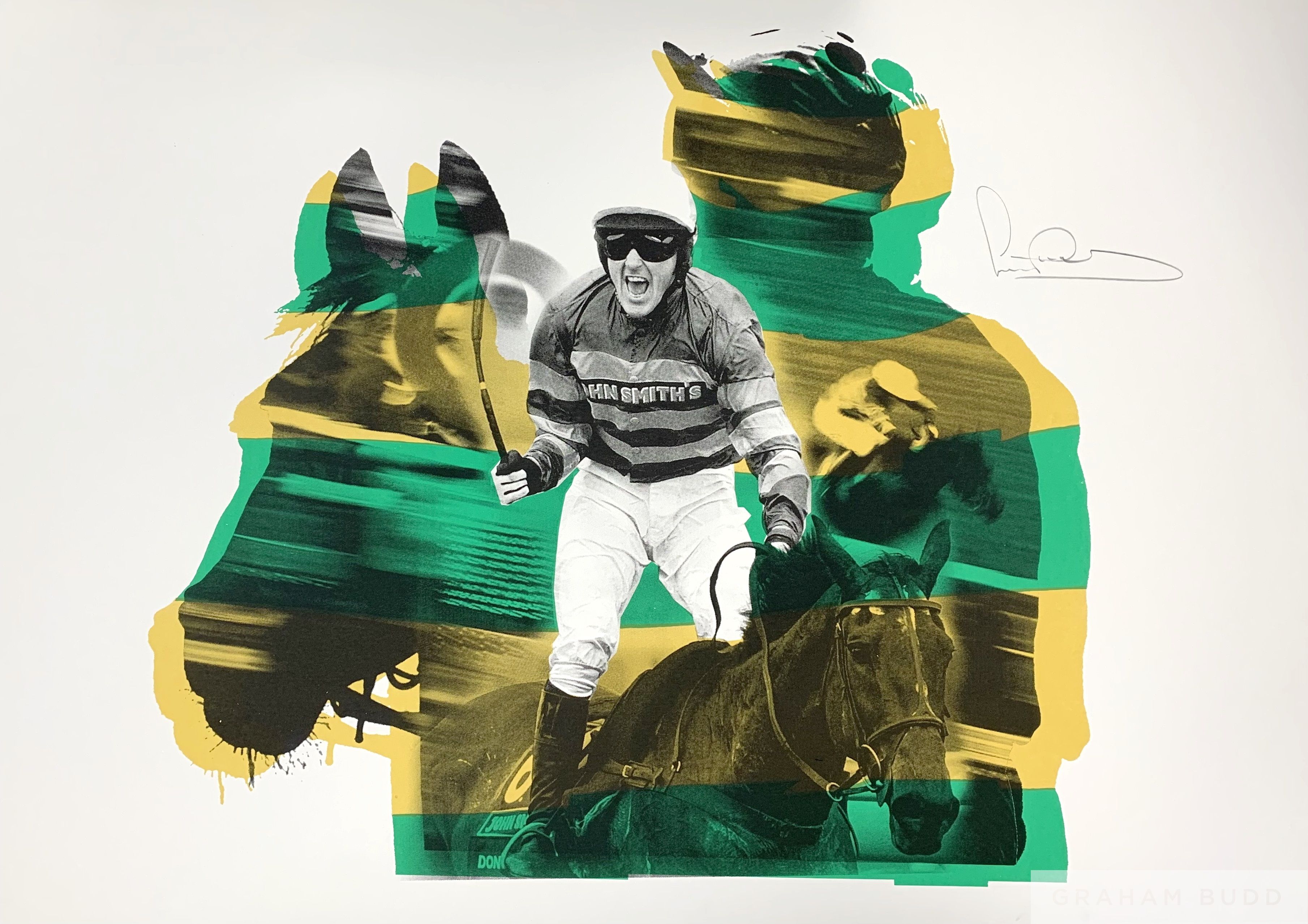 Sir AP McCoy Collection: Grand National Win signed by Sir A.P. McCoy, No.2 of 5, original screen print, 75 by 105cm paper size, mounted and framed, with COA Aintree 2010 saw the great Sir AP McCoy saddle up on Don’t Push It, where on his 15th attempt, he finally won the biggest race of them all, the Grand National. The artwork features the famous green and yellow stripes of owner JP McManus and colours Sir AP rode to victory in. Sir AP McCoy is the most successful jump jockey to have ever graced the sport. He achieved everything there is in the sport, owning many records from most victories to most Champion Jockey titles, and winning the largest and most celebrated races from the Gold Cup to the Grand National. He has now created, in partnership with Icons Art a series of 5 unique artworks celebrating his great career. Produced in the studio by Sir AP himself, the paints used to create the originals were infused with the DNA of Cheltenham and Aintree, the turf from both racecourses and needles from the hedge rows of Aintree. Provenance: Icon Arts - Sir A.P. McCoy Collection