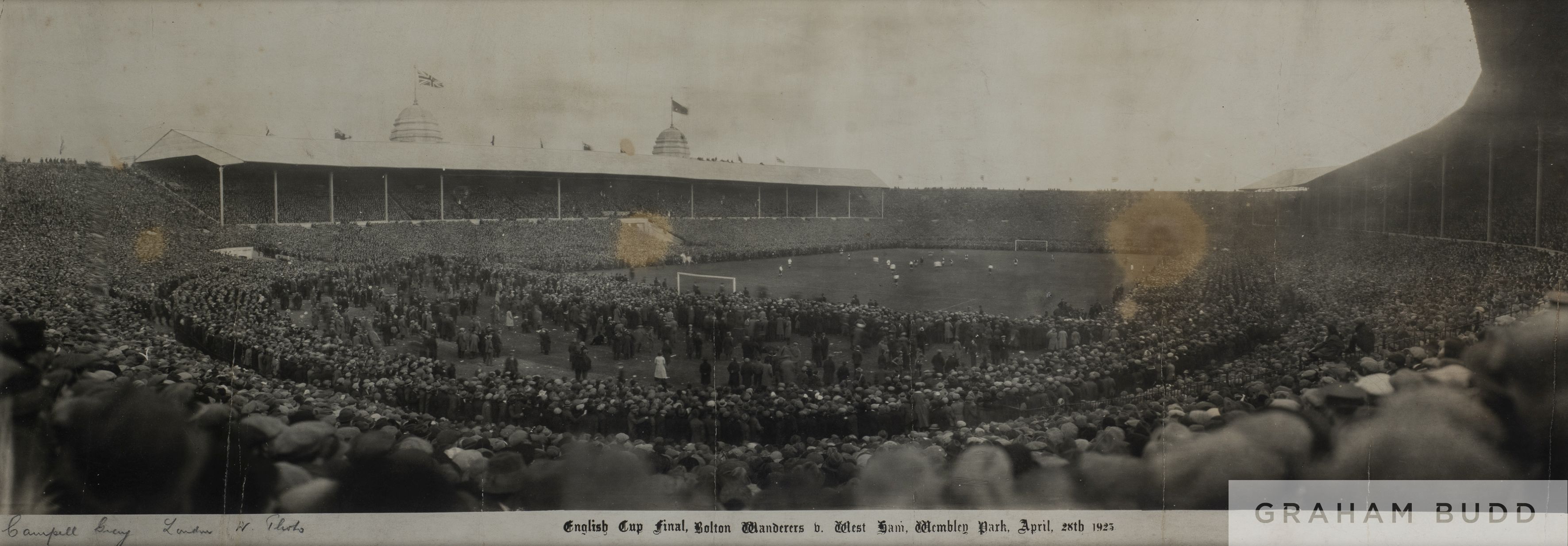 English Cup Final Bolton Wanderers v West Ham b&w photography, at Wembley, 28th April 1923, featuring a full crowded stadium, signed lower left in pencil by the photographer Campbell Grey of West London, the famous white horse can be seen on the far touchline, mounted, glazed and framed, 43 by 84cm.