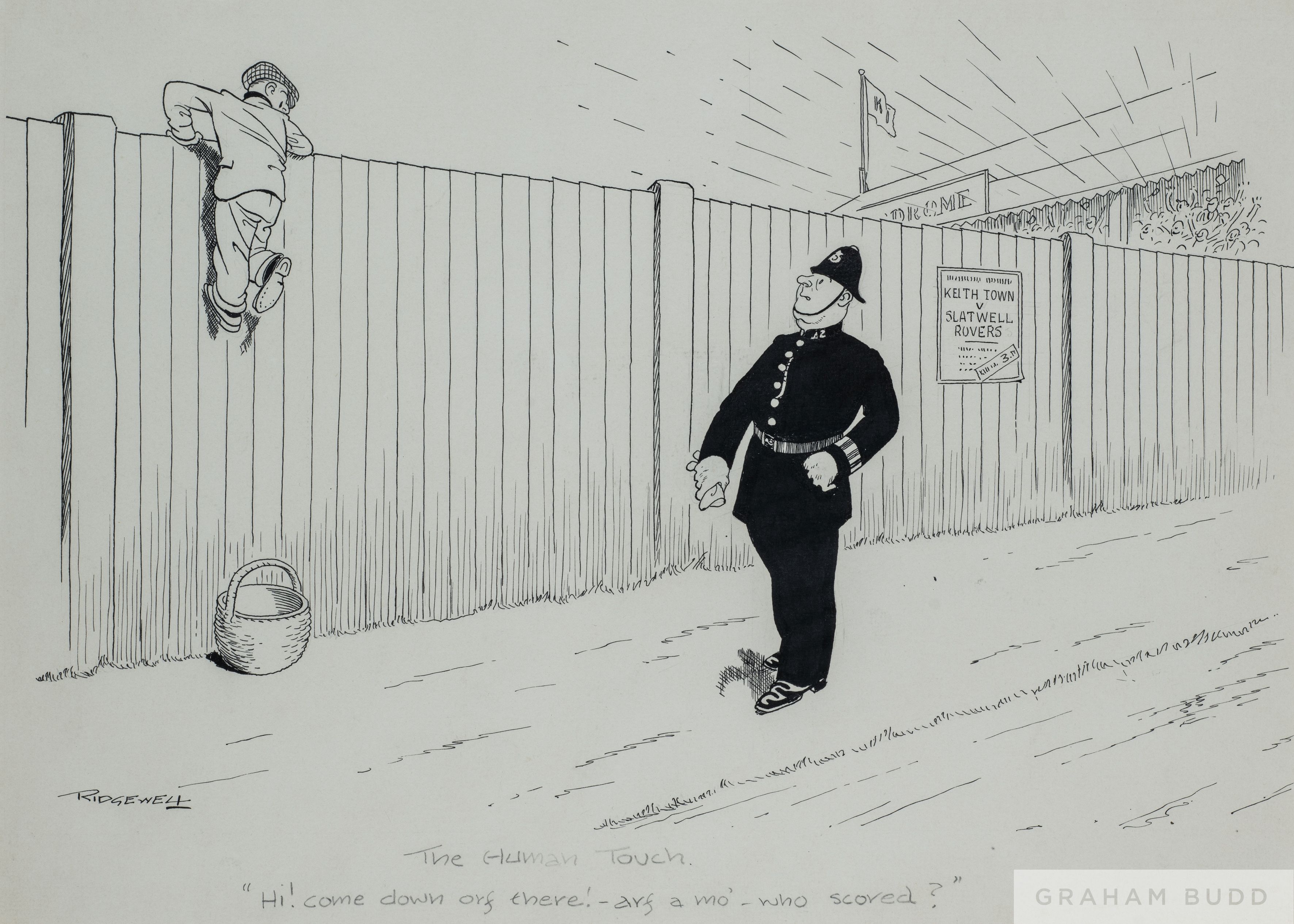 William Leigh Ridgewell (1881-1937), 'The Human Touch' football drawing, featuring a policeman and a boy climbing a football stadium fence, titled "The Human Touch, Hi! come down orf there! - arf a mo' - who scored?" in pencil lower margin, signed lower left, mounted, glazed and framed, 42 by 51cm.
