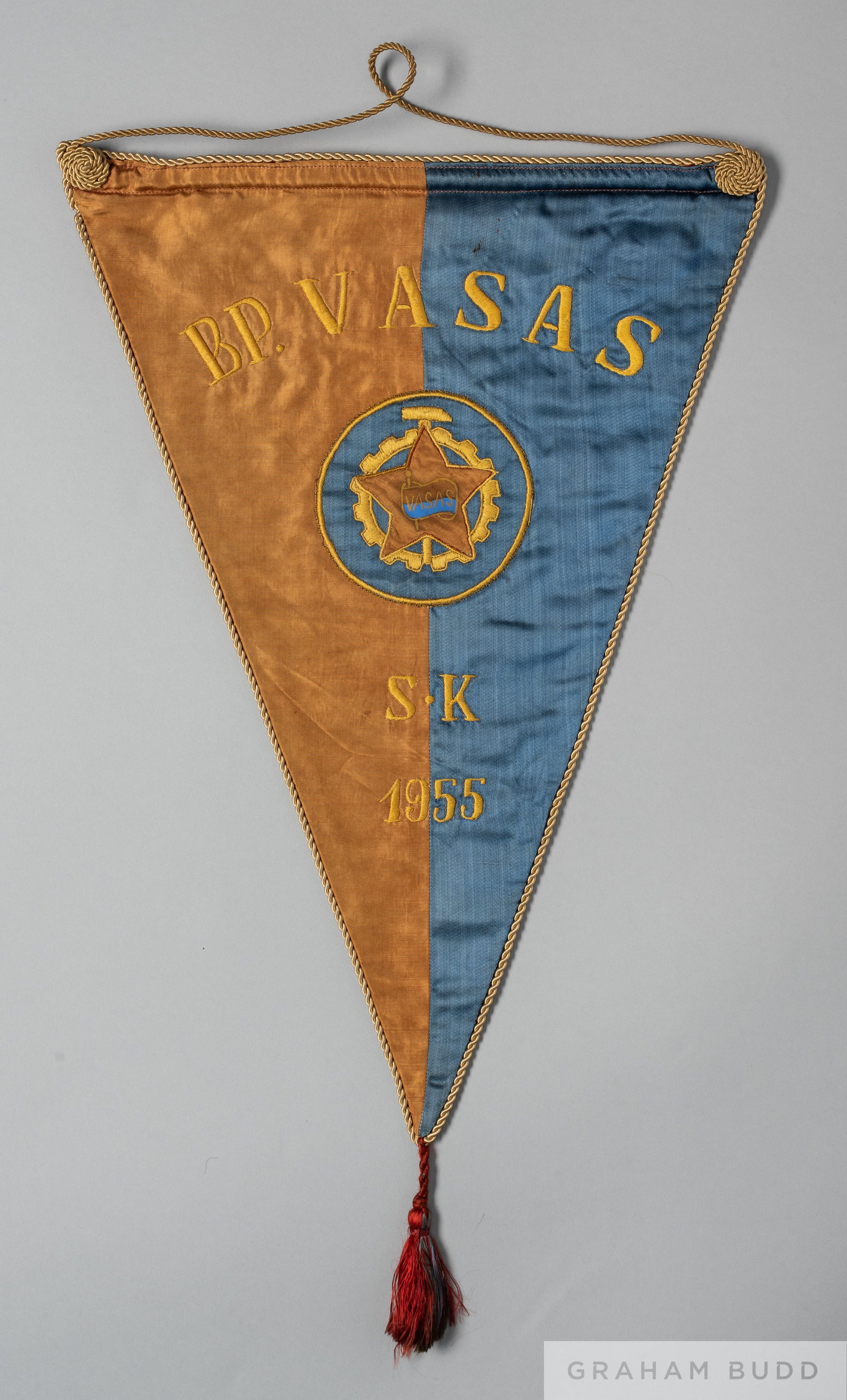 Official red and blue Budapesti Vasas Friendly match pennant, 1955 of triangular design, inscribed B.P. VASAS, S.K, 1955, hanging thread and tassel PROVENANCE: Dr Brian Curtin - Tottenham Hotspur doctor. Dr Curtin known as 'Doc' joined Tottenham Hotspur in 1962, before taking over as medical officer ahead of the 1965-66 season, a post he kept until 1994