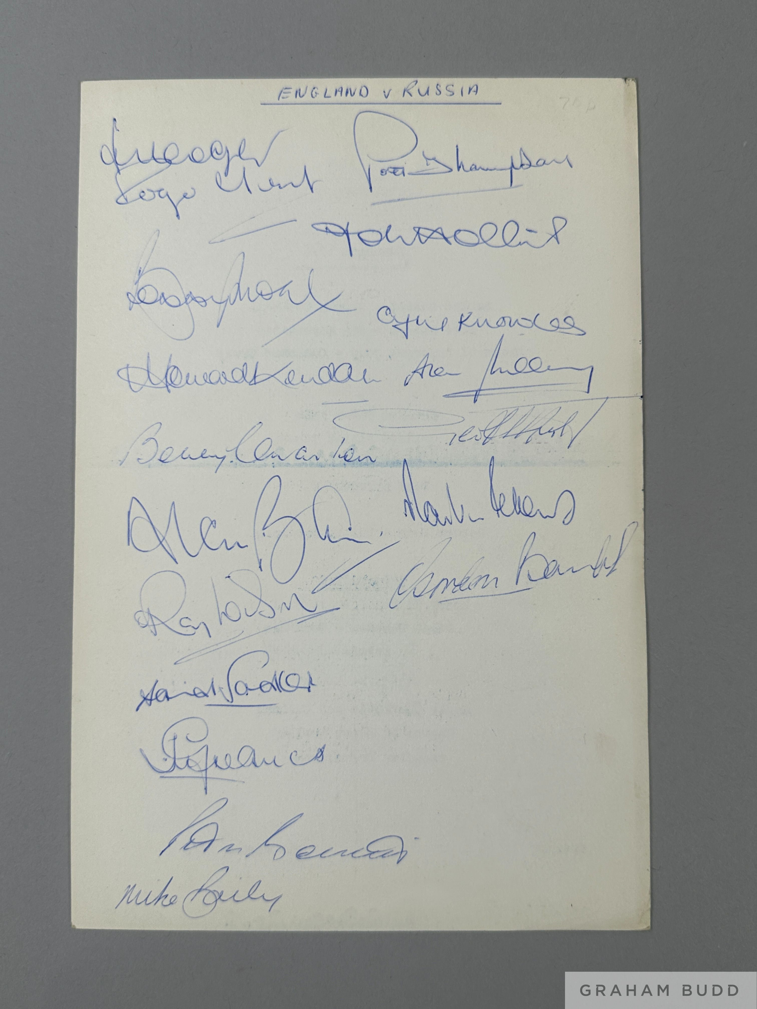 England v Russia signed menu for luncheon at the Hendon Hall Hotel on 6th December 1967, on the day before the match, England stayed at this hotel prior to internationals at the time. The menu has been signed to rear by full squad, includes eight of World Cup winning side, Moore, Hunt, Charlton, Ball, Wilson, Hurst, Peters, Banks, others include Mullery, Greaves, Hollins, etc.