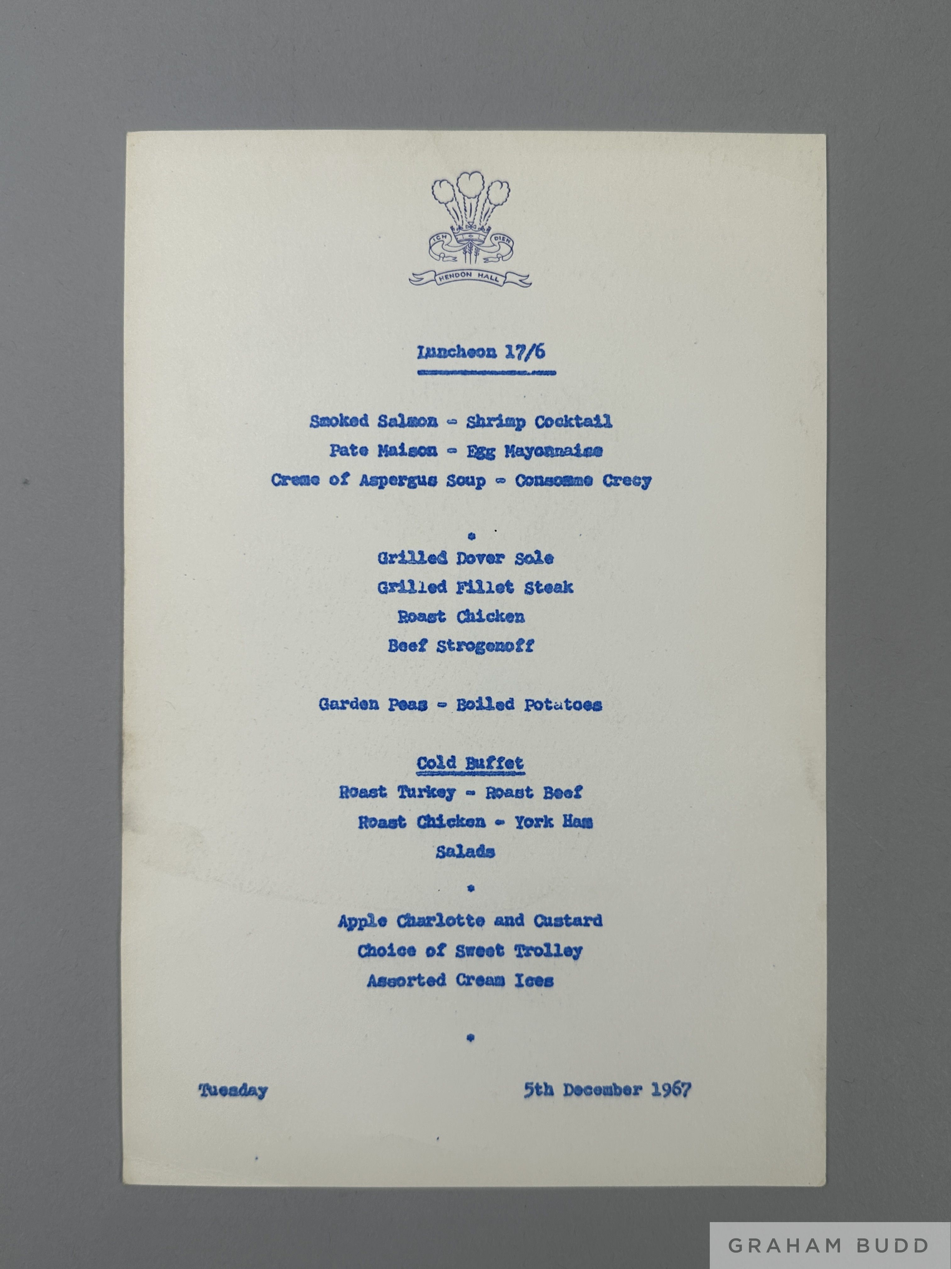England v Russia signed menu for luncheon at the Hendon Hall Hotel on 6th December 1967, on the day before the match, England stayed at this hotel p