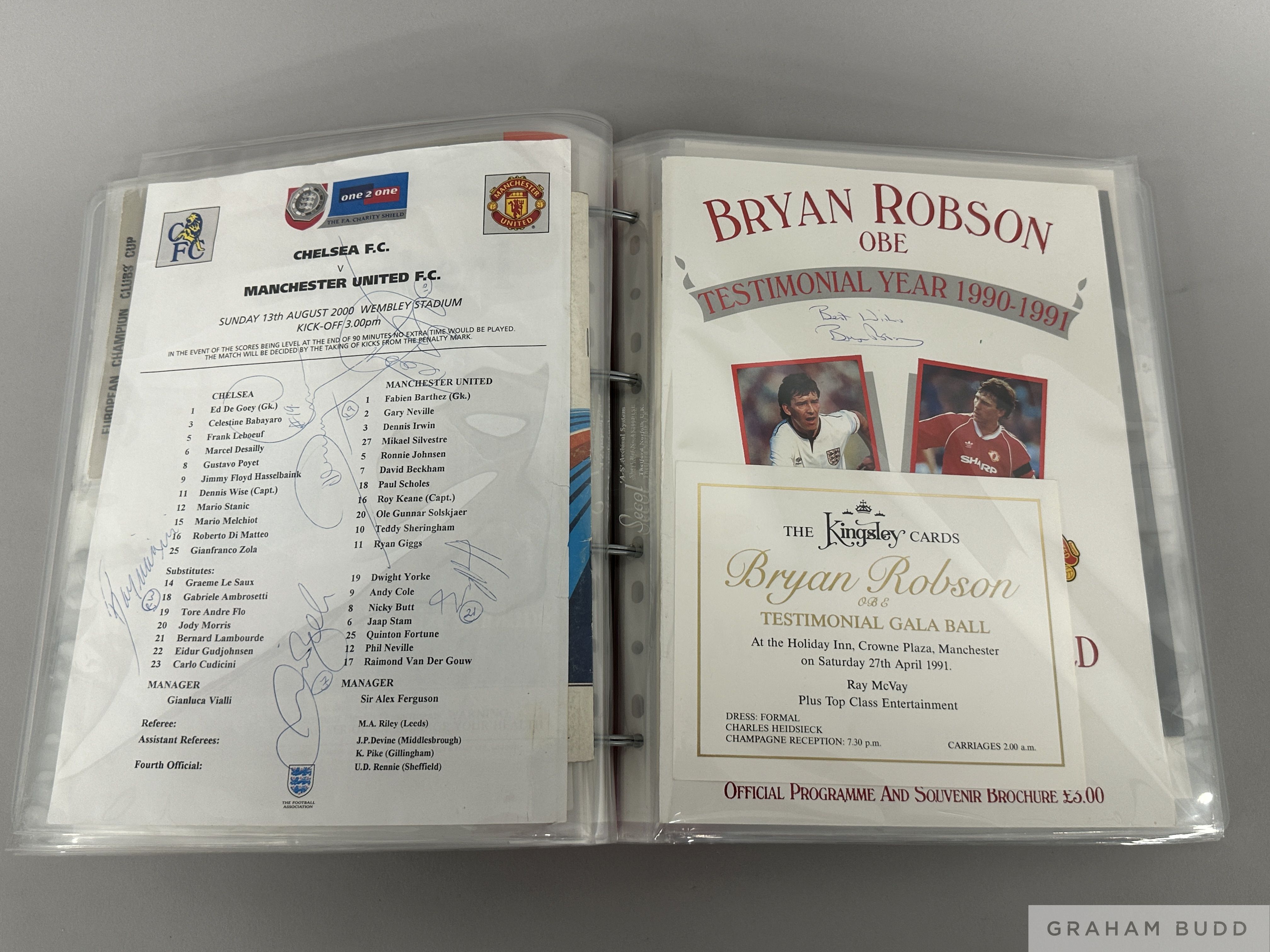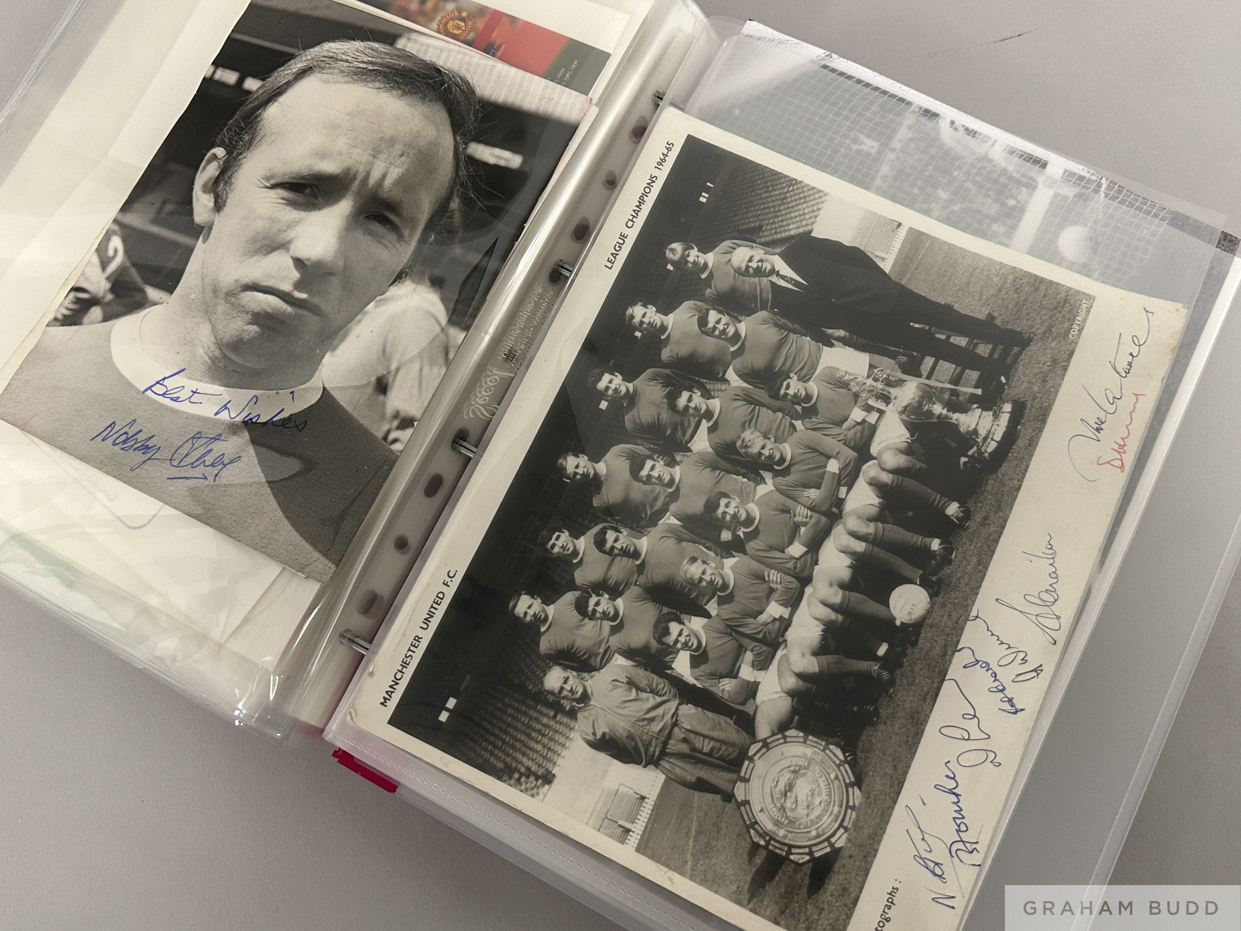 Collection of Manchester United autographs, older vintage items including Tommy Taylor, Ian Graves, Freddie Goodwin, Jack Crompton, Walter Whitehurst, Geoff Bent, Jack Irons (club mascot), David Pegg, John Hall, Johnny Morris, Jimmy Murphy, Johnny Carey, Allenby Chilton, Stan Pearson, John Rowley, Jimmy Delaney, some 50s Youth Team players plus a 1997 Champions League ticket signed by a group of former players in attendance including Henry Cockburn, Charlie Mitten, John Anderson, Johnny Morris and others; players from later eras including Bill Foules, Noel Cantwell, David Sadler, Pat Crerand, John Aston jnr., Tony Dunne, Nobby Stiles, Denis Law, Bobby Charlton, Lou Macari, Jimmy Greenhoff, Bryan Robson, David Beckham, Dwight Yorke and many others, (qty)