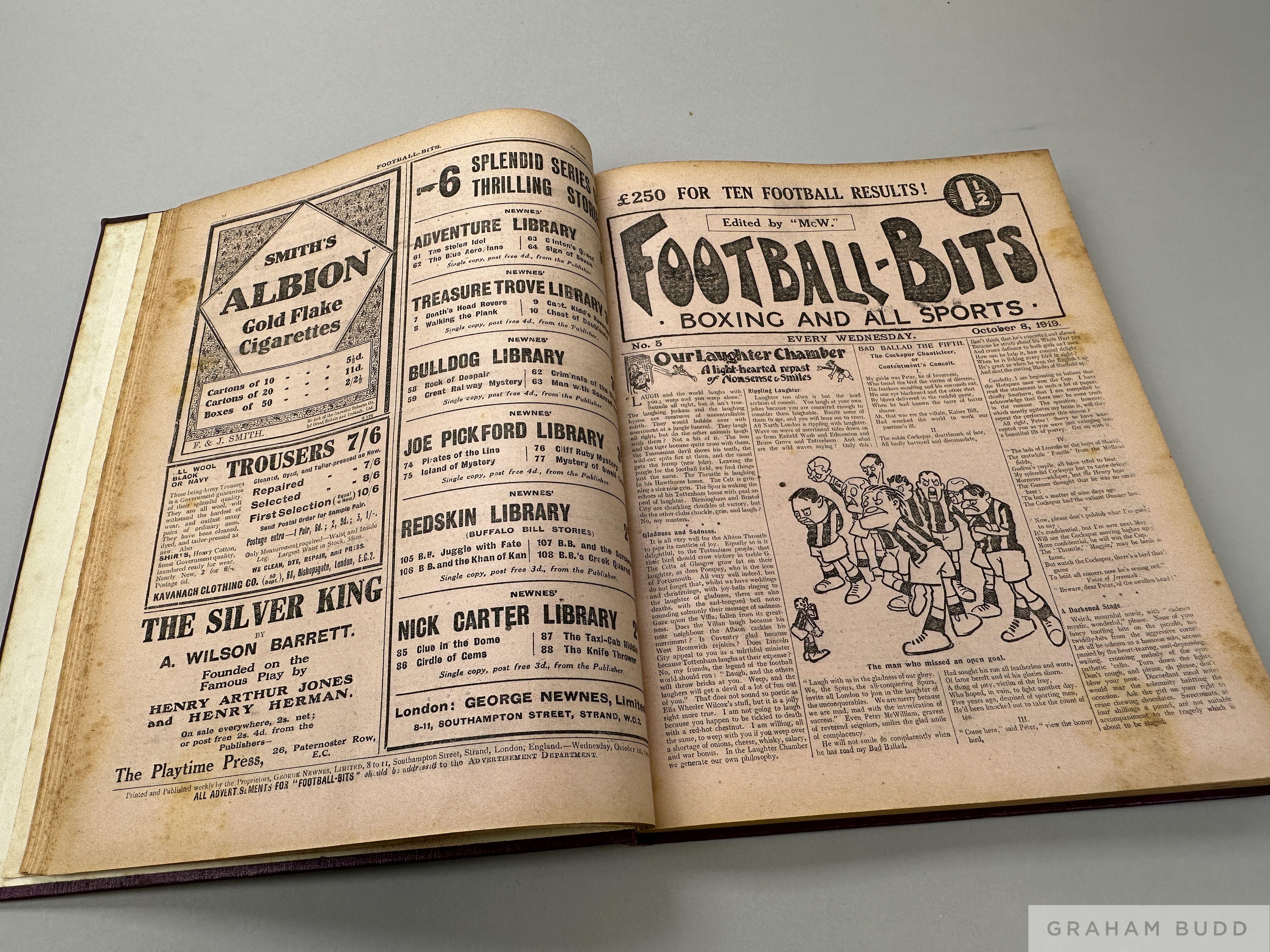 Nicely bound volume of Football newspapers called 'Football Bits', issued weekly, this bound volume starts with no.1 to no.25, from 10th September 1919 to 11th February 1920, 16 pages of football with some boxing and other sports, bound with mauve boards and gold lettering to spine Sept 1919 Feb 1920