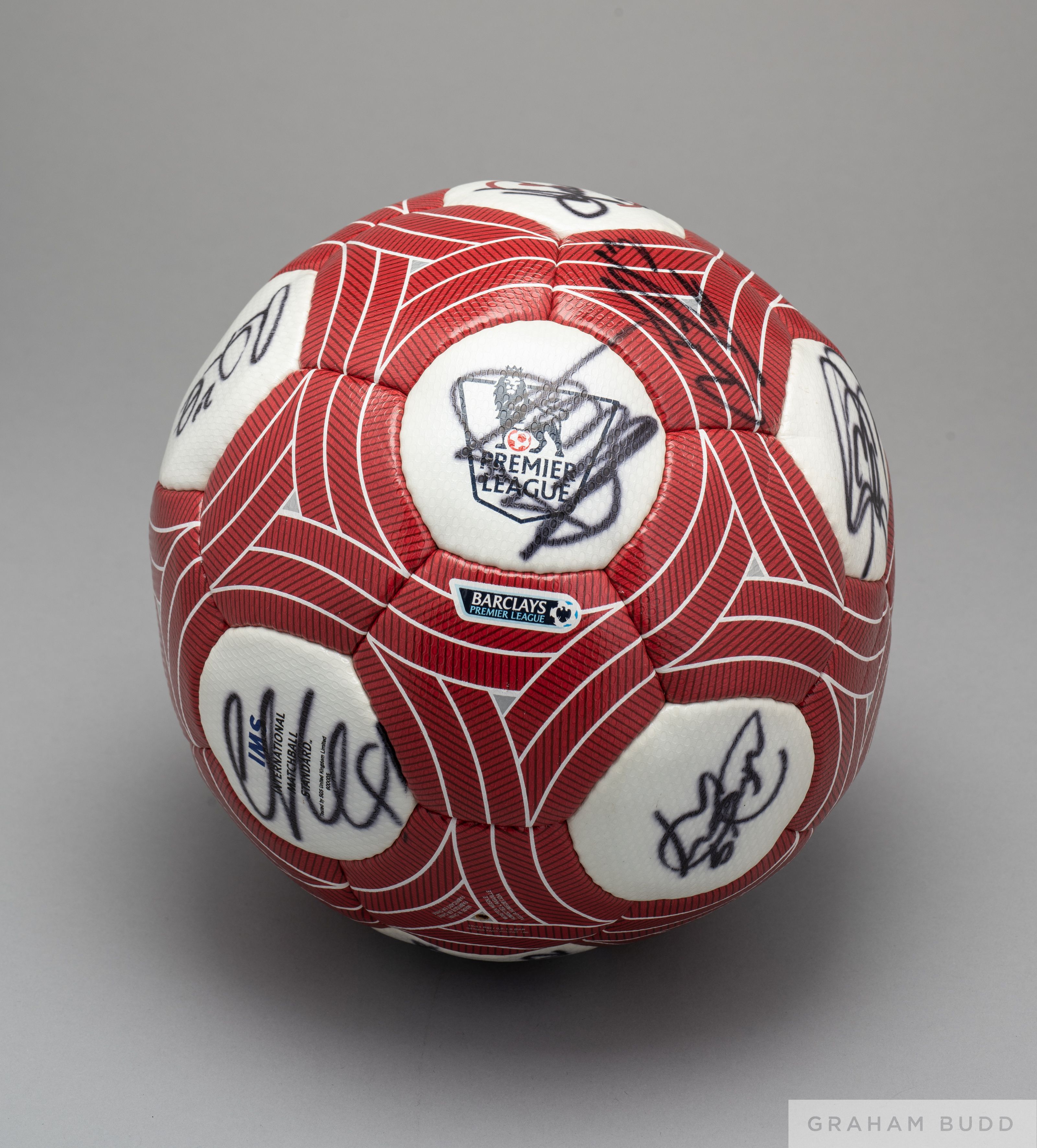 Signed red and white Barclays Premier League football, Nike IMS International standard signed in black marker pen on all white panels with some on the red. The signatures and team it relates to are unidentified. There is no evidence of match wear visible.