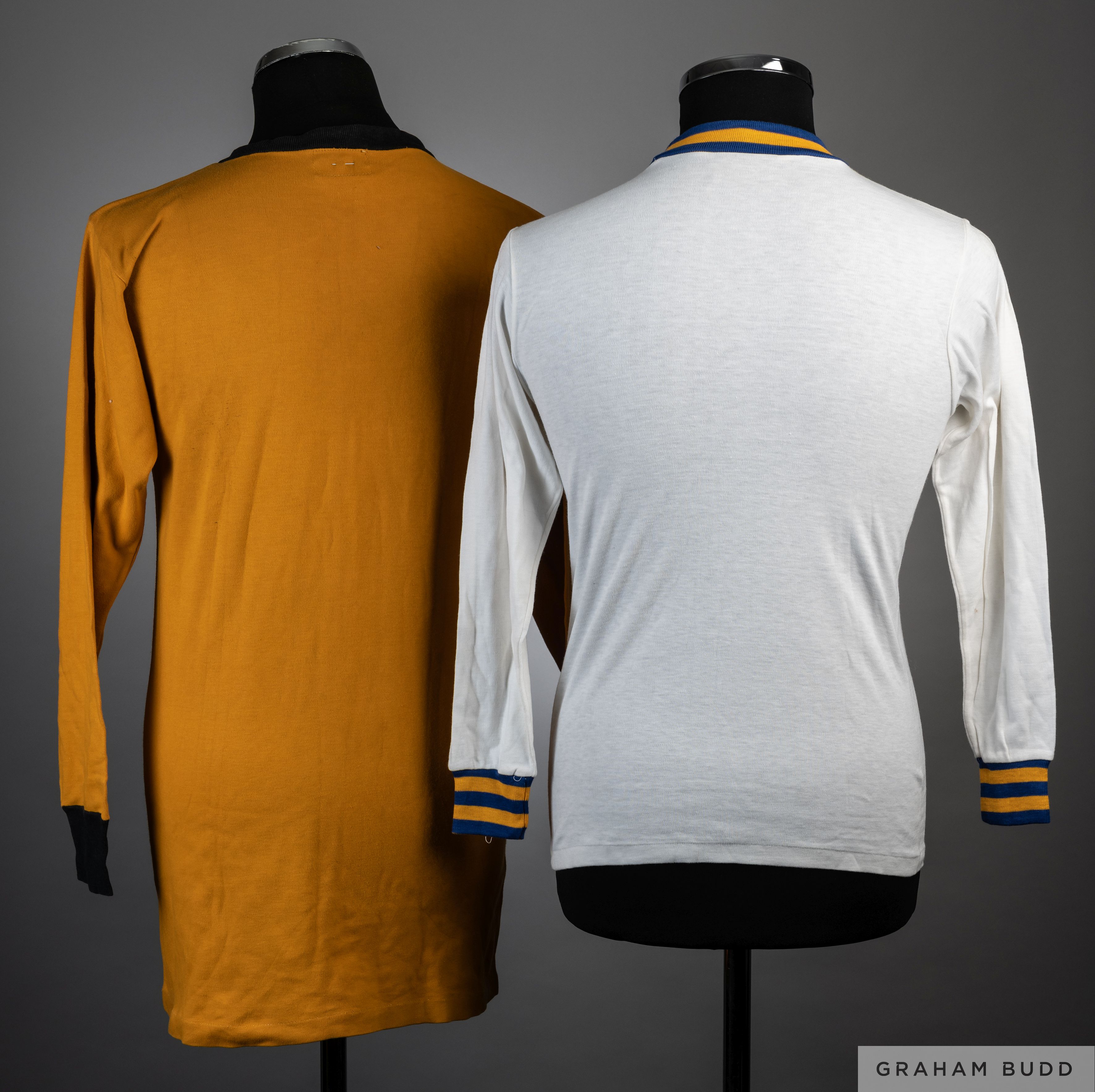Two vintage football jerseys, comprising an amber Burton Albion un-numbered jersey, by Dynamo, mid 1960s, long-sleeved, size 40; together with white Mansfield Town jersey by Bukta, early 1970s, blue and amber hooped crew collar and cuffs, long-sleeved, paper badge, size 34, (2) Overall condition fair to good