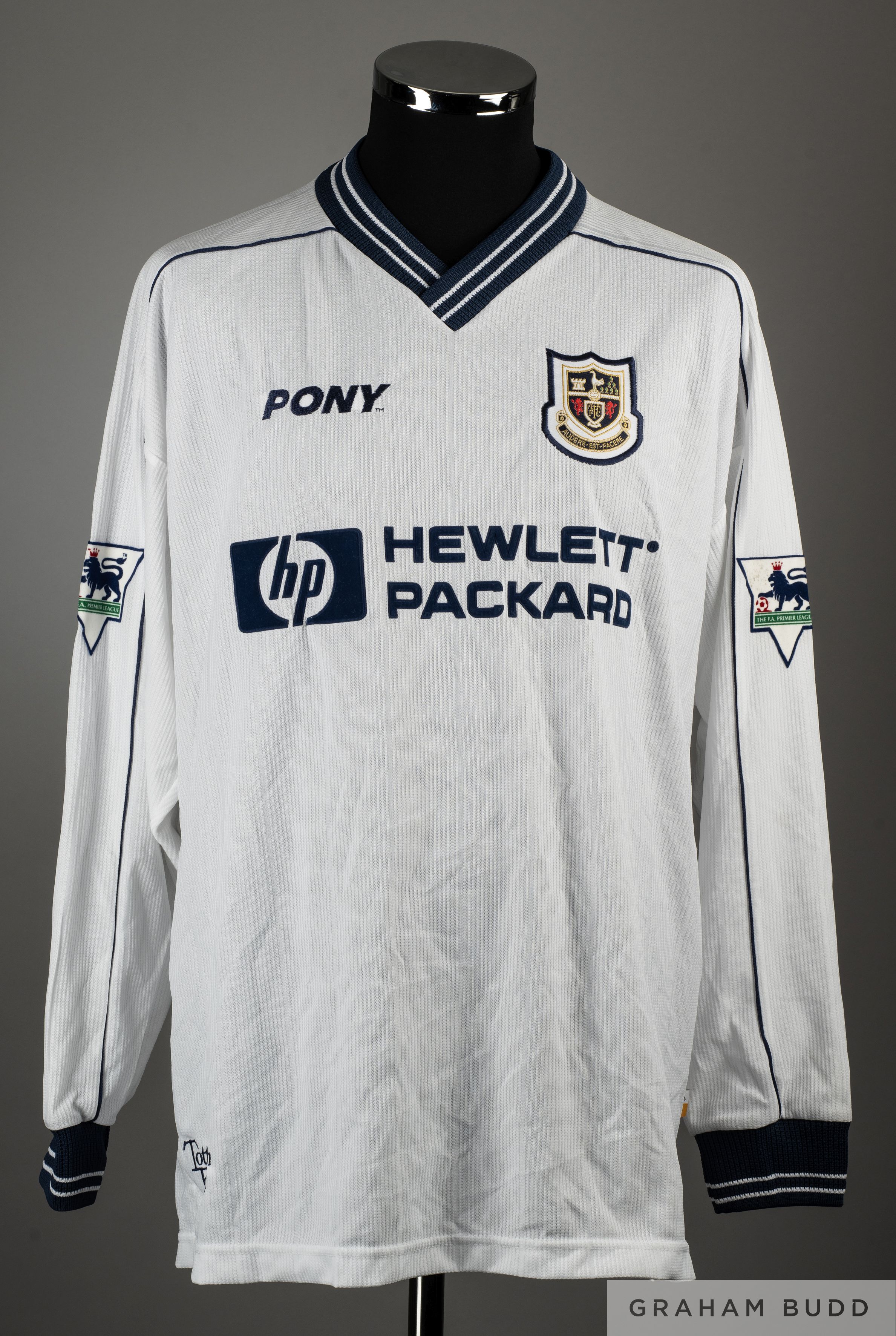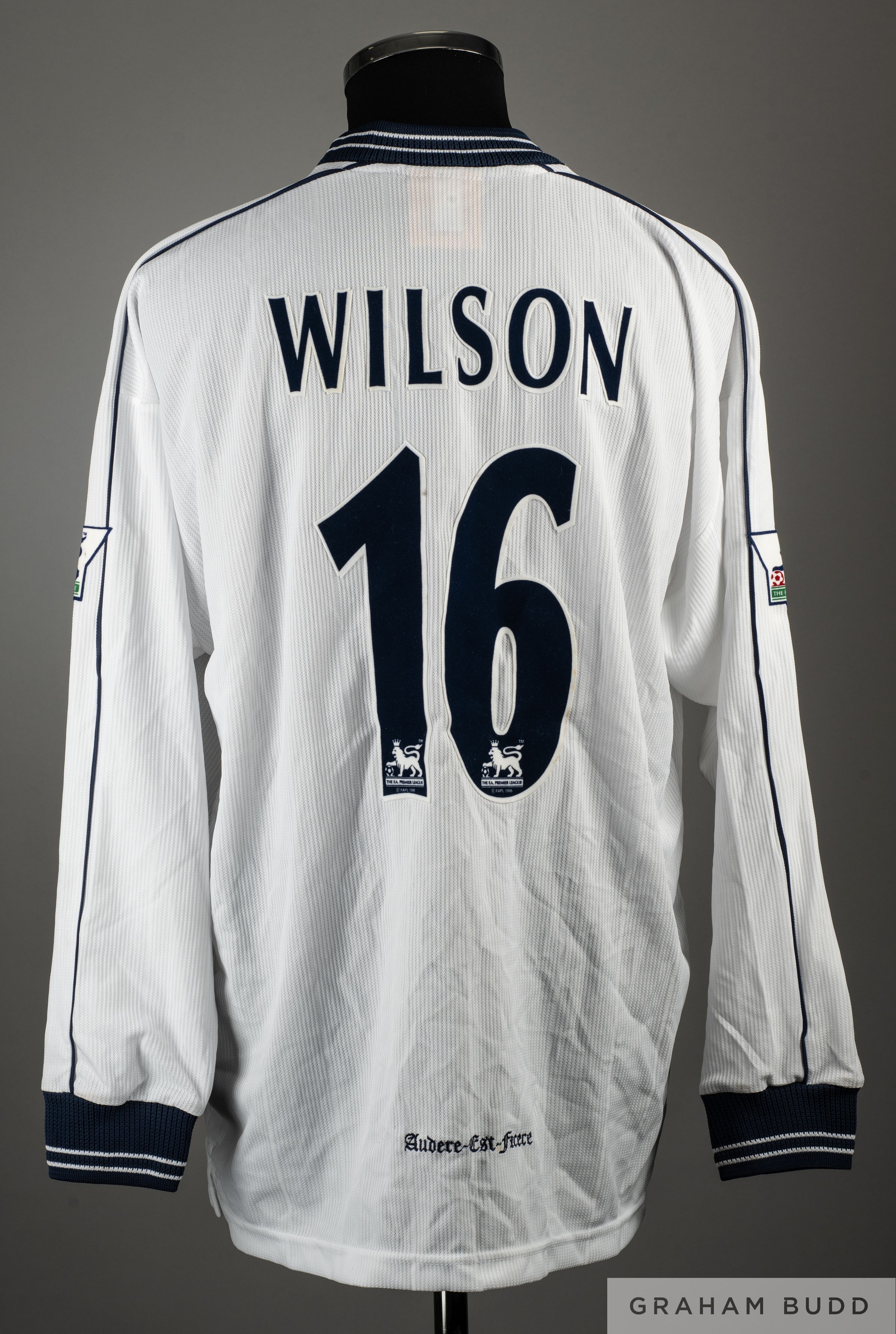 Clive Wilson white and blue No.16 Tottenham Hotspur match worn long-sleeved shirt, 1997-98, Pony, XL, with v-neck collar and embroidered cloth badge inscribed THFC, AUDERE-EST-FACERE, the reverse lettered WILSON, the sleeves with The F.A. Premier League flashes