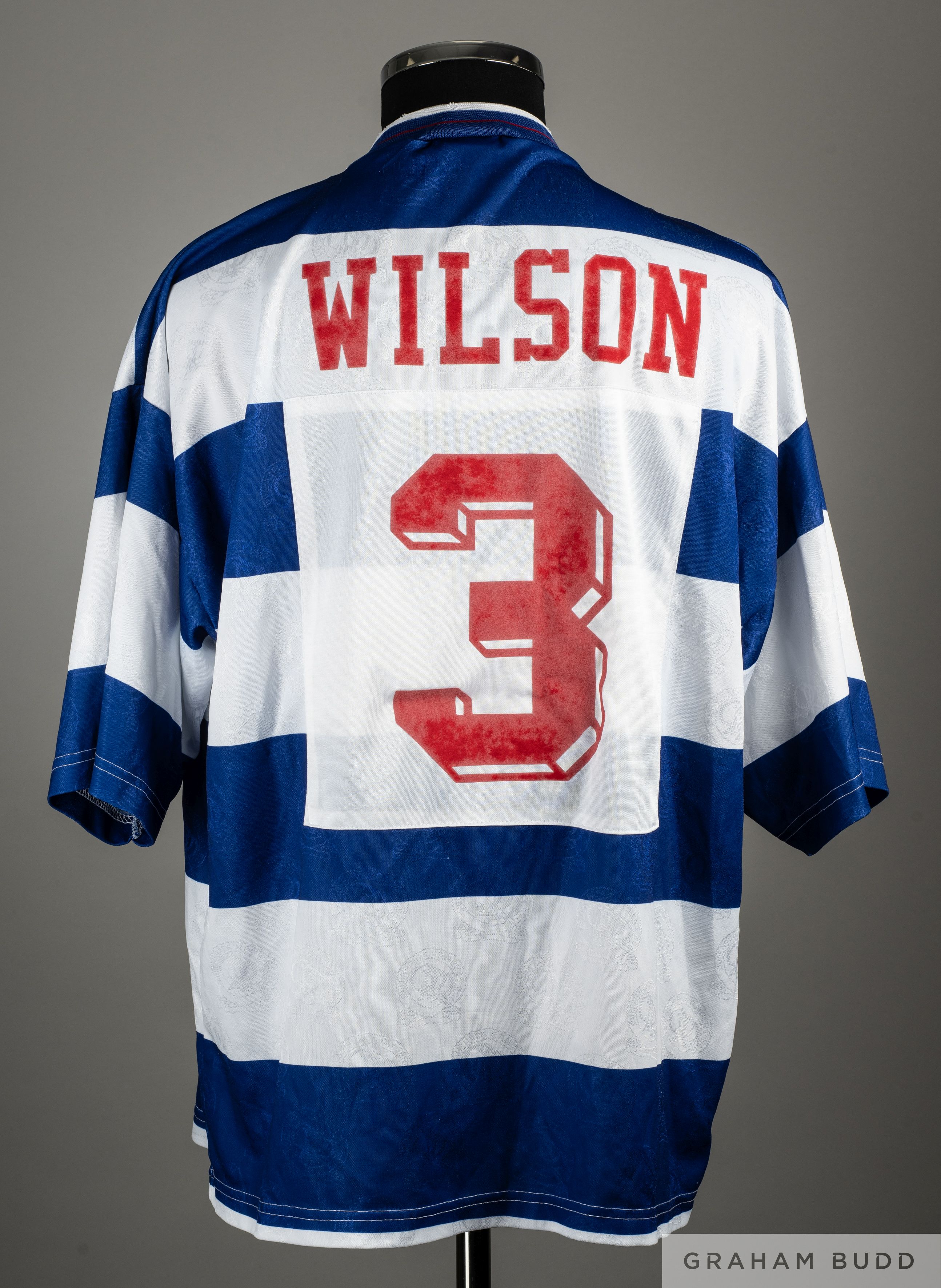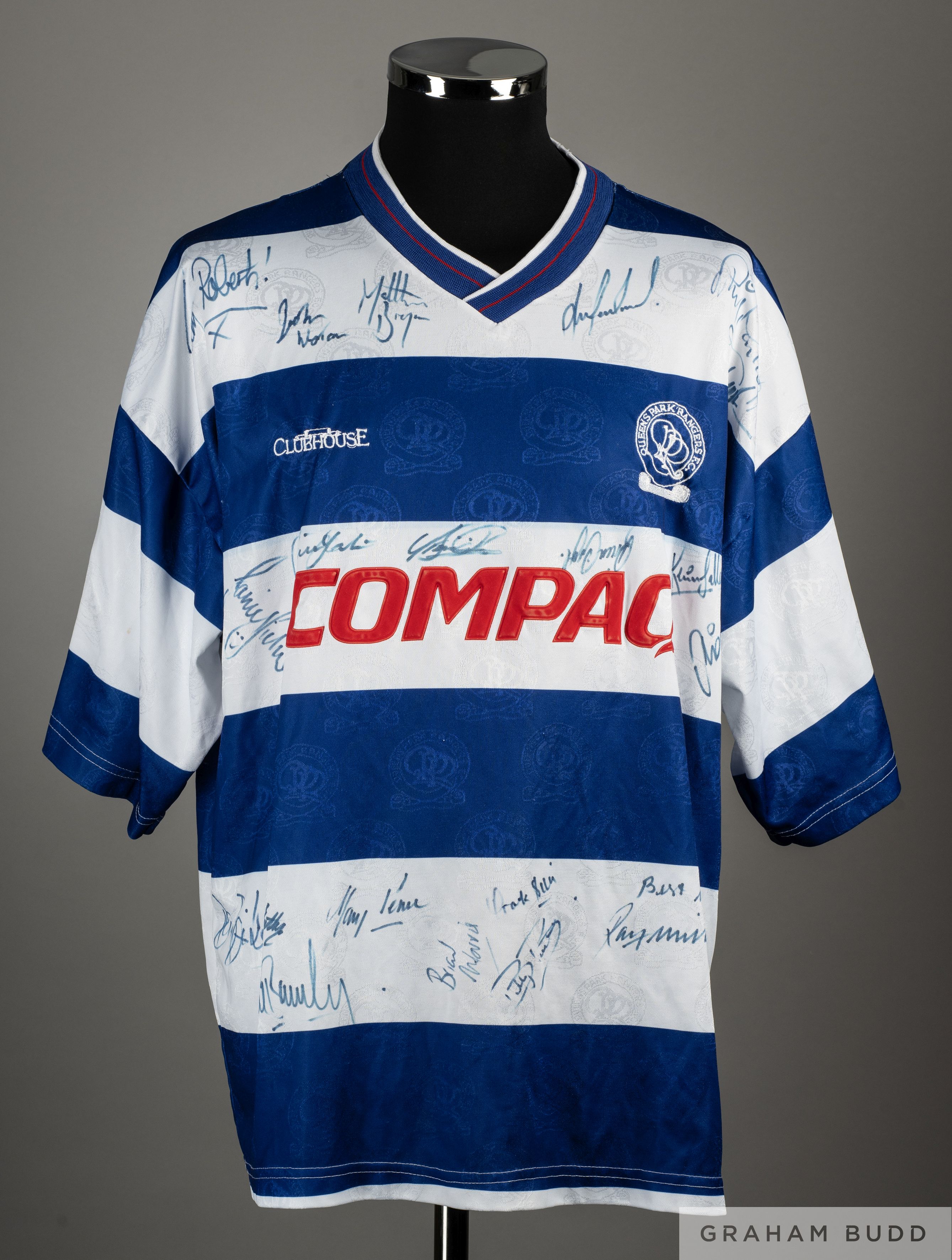 Clive Wilson blue and white No.3 Queens Park Rangers last match worn short-sleeved shirt, 1994-95, Clubhouse, with v-neck collar and embroidered badge inscribed QPR, QUEENS PARK RANGERS F.C., the front of the shirt bearing twenty-two squad player autographs, the reverse lettered WILSON, the sleeves with The F.A. Premier League flashes The above shirt was worn by Clive Wilson in his last match for QPR