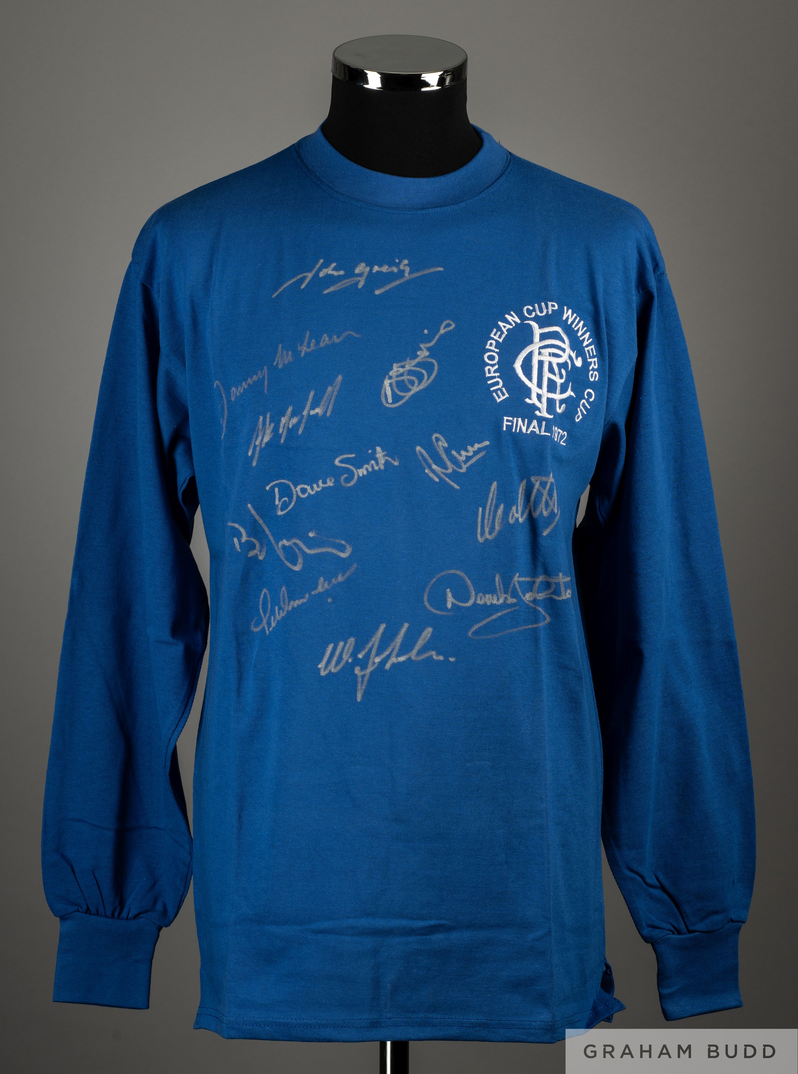 Rangers team signed blue 1972 European Cup Winners' Cup final retro shirt, Score Draw, M, long-sleeved with club crest and embroidered EUROPEAN CUP WINNERS CUP FINAL 1972, signed in silver marker pen on front by 11 players including John Greig, Colin Stein, Willie Johnston and others, with retail tag and A1 Sporting Legends COA Glasgow Rangers defeated Dynamo Moscow 3-2