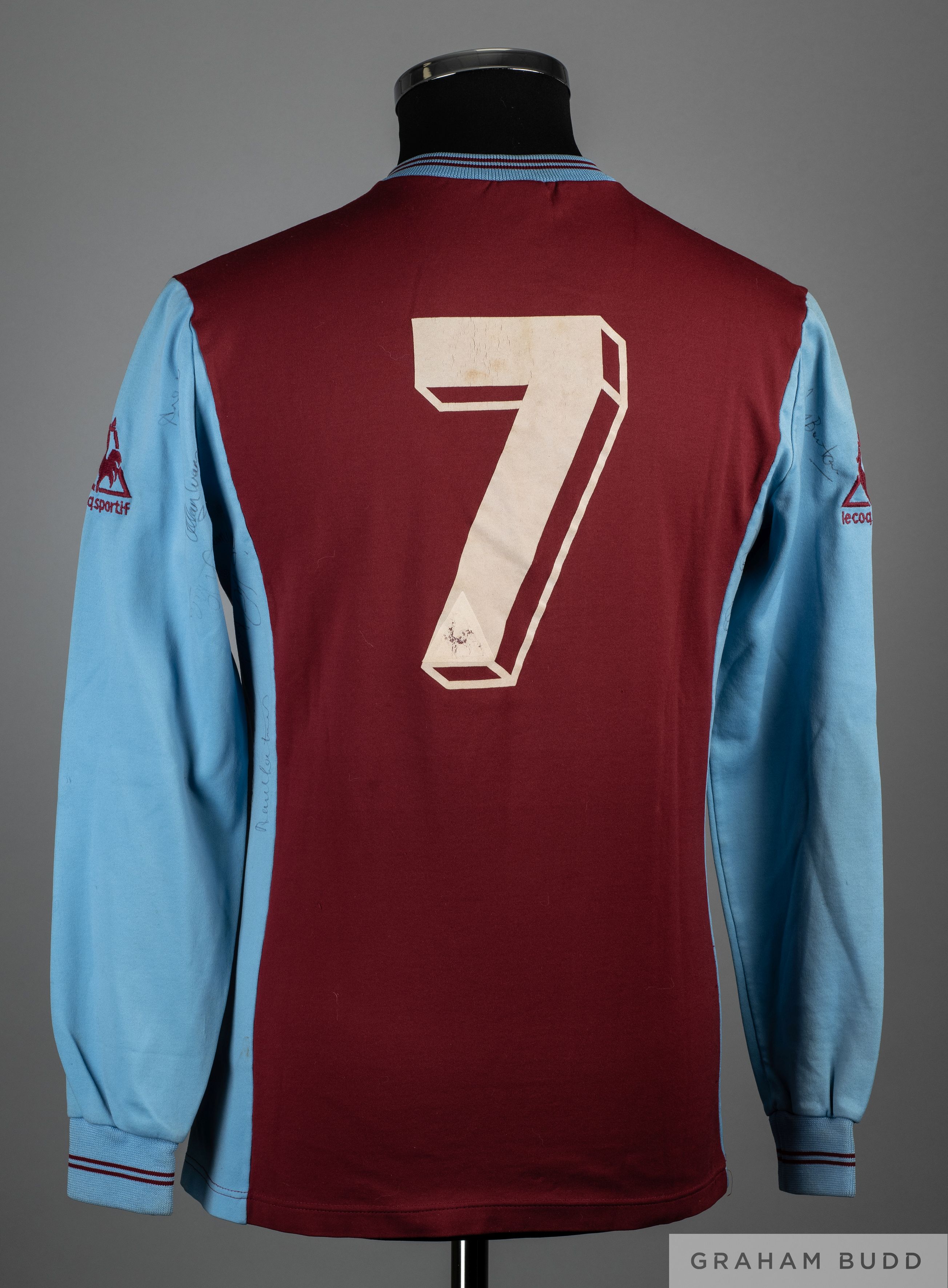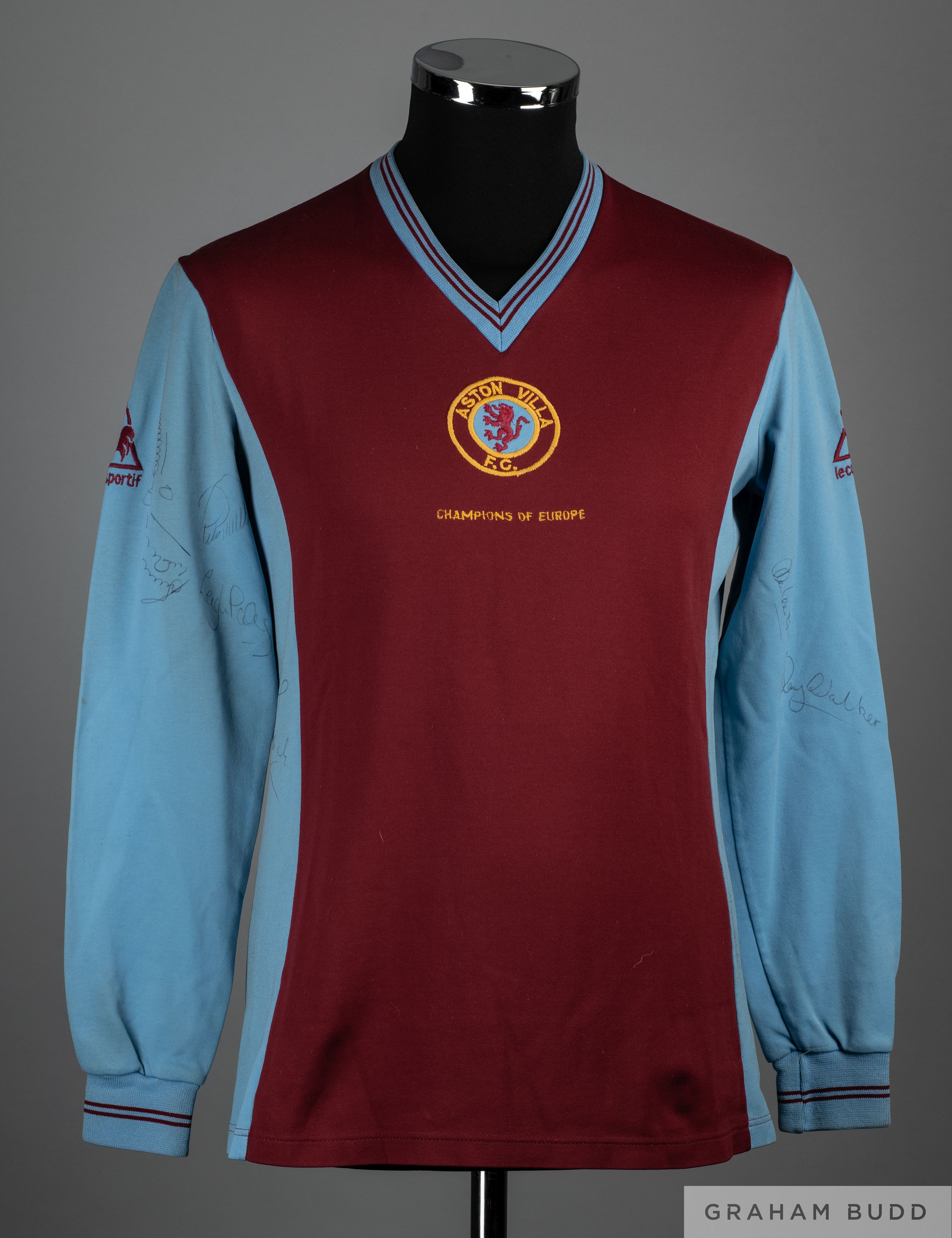 Des Bremner claret and blue No.7 Aston Villa long-sleeved shirt, 1982, Le Coq Sportif, M, with v-neck collar and embroidered badge inscribed ASTON VILLA F.C., CHAMPIONS OF EUROPE, the sleeves and side panes bearing twenty player autographs