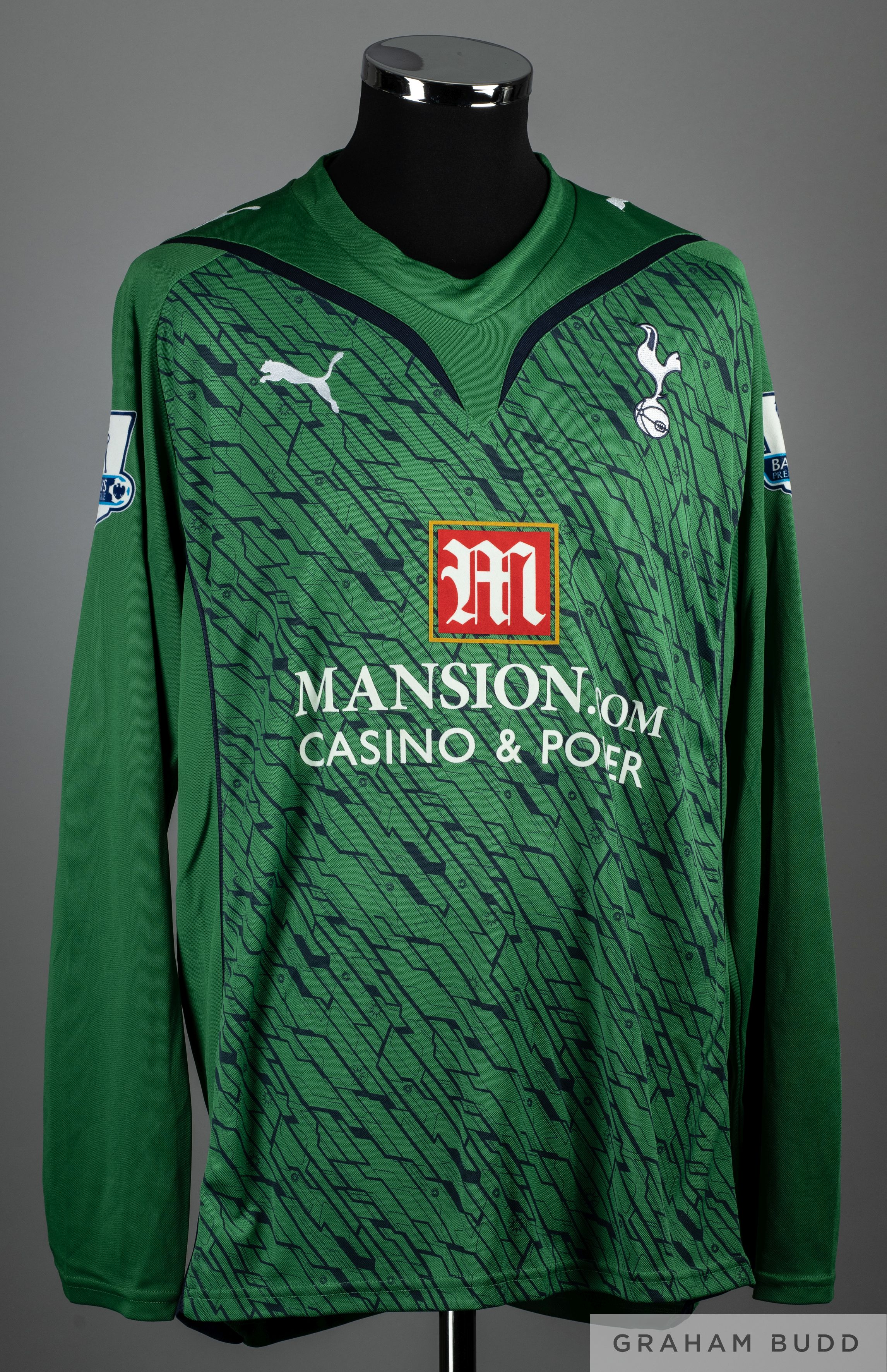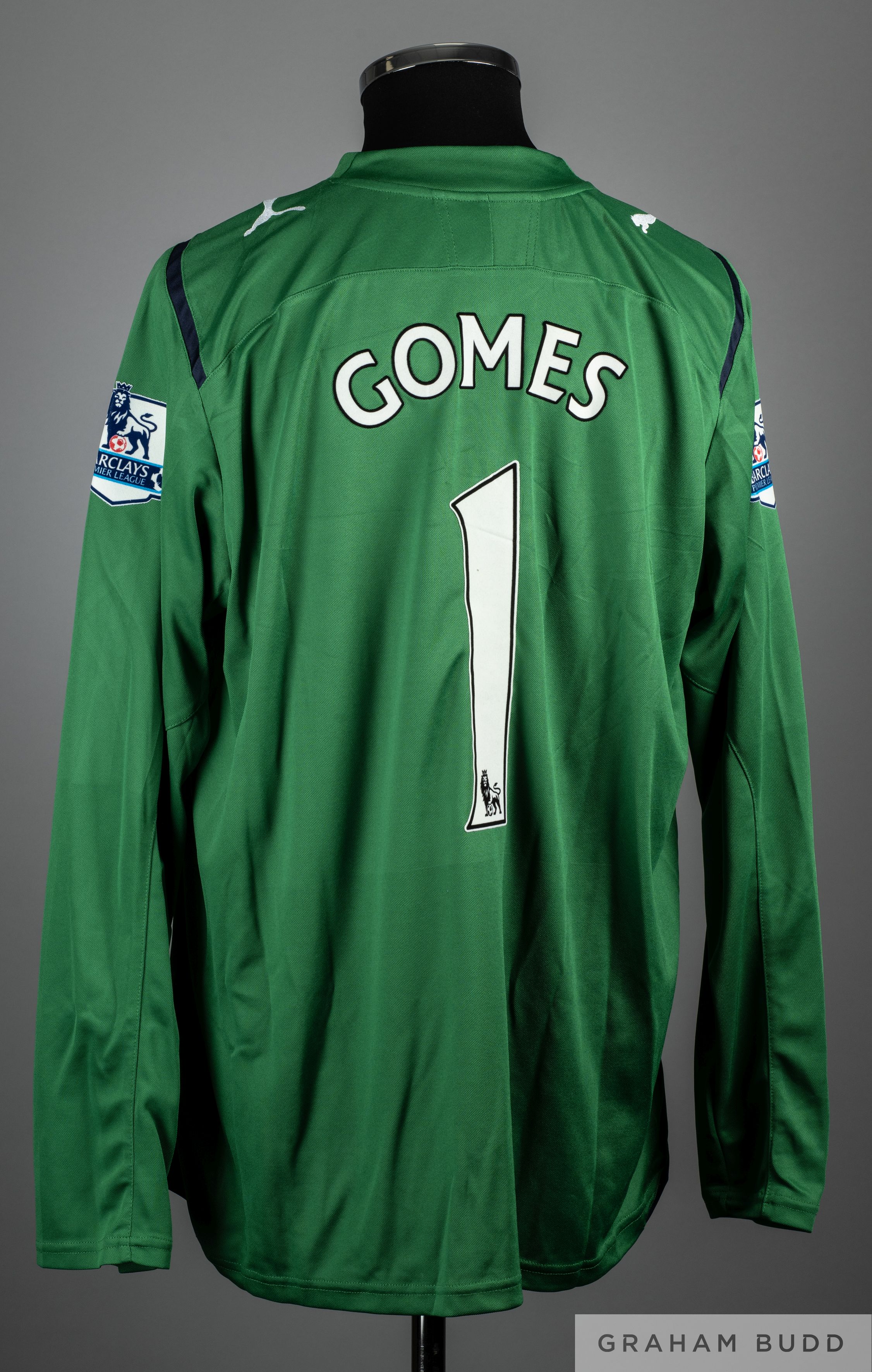 Heurelho Gomes green No.1 Tottenham Hotspur v. Chelsea match worn goalkeepers shirt, 2009-10, Puma, XL, with v-neck style collar and embroidered badge, the reverse lettered GOMEZ, the sleeves with Barclays Premier League flashes The above shirt was worn by Heurelho Gomes in the match against Chelsea played on 17th April 2010, the match ending in a 2-1 victory for Spurs
