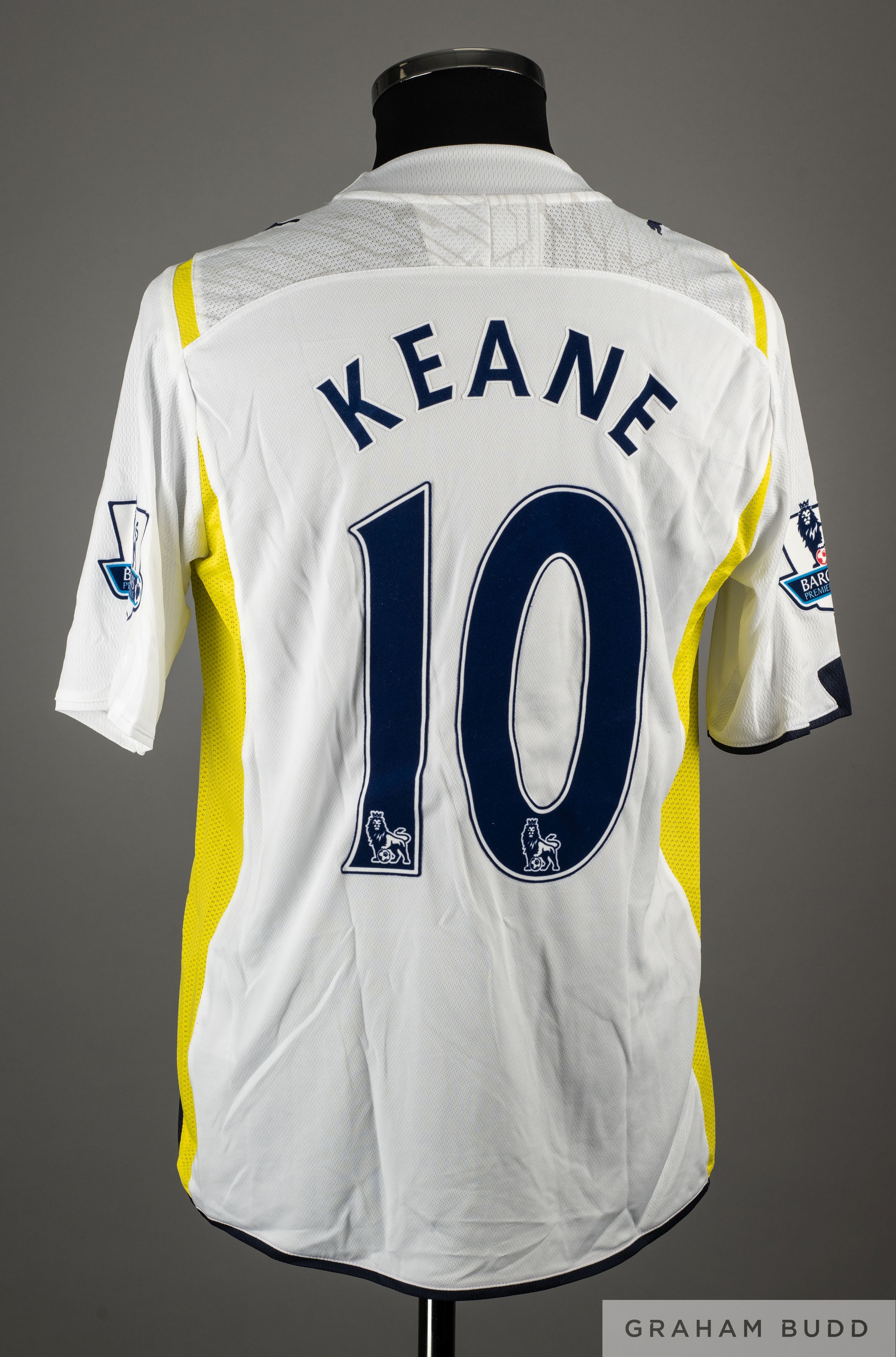 Robbie Keane white and yellow No.10 Tottenham Hotspur match worn short-sleeved shirt, 2009-10, Puma, M, with v-neck style collar and embroidered badge, the reverse lettered KEANE, the sleeves with Barclays Premier League flashes
