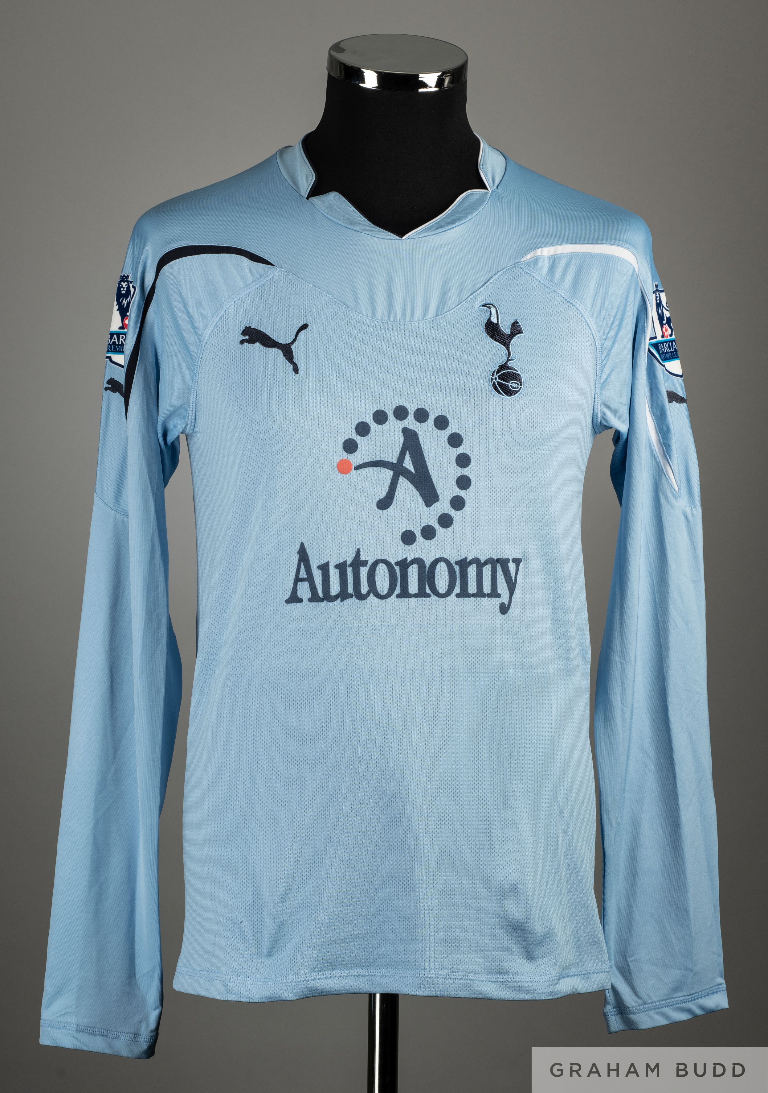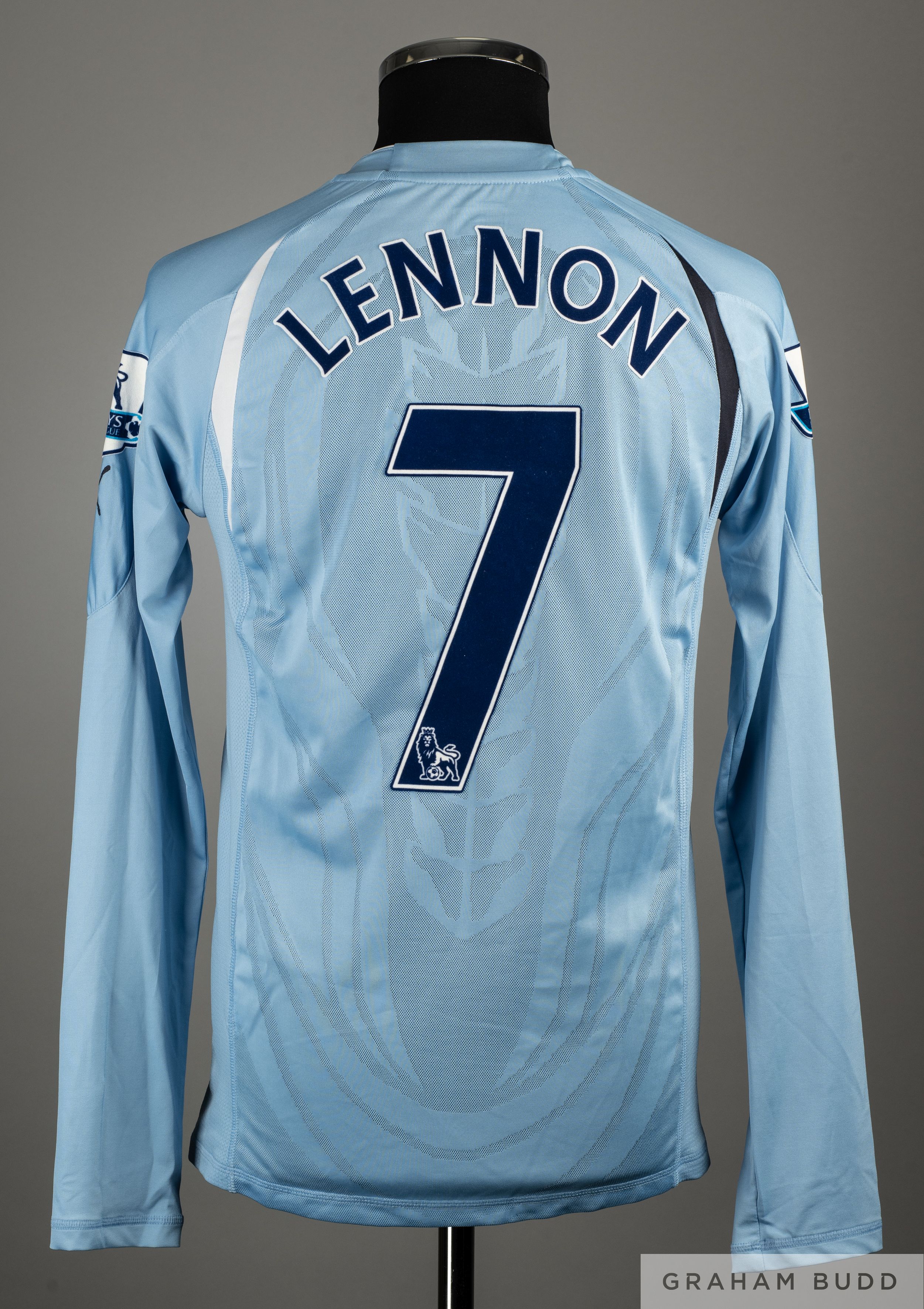 Aaron Lennon sky-blue No.7 Tottenham Hotspur match worn long-sleeved shirt, 2010-11, Puma, M, with v-neck collar and embroidered badge, the reverse lettered LENNON, the sleeves with Barclays Premier League flashes