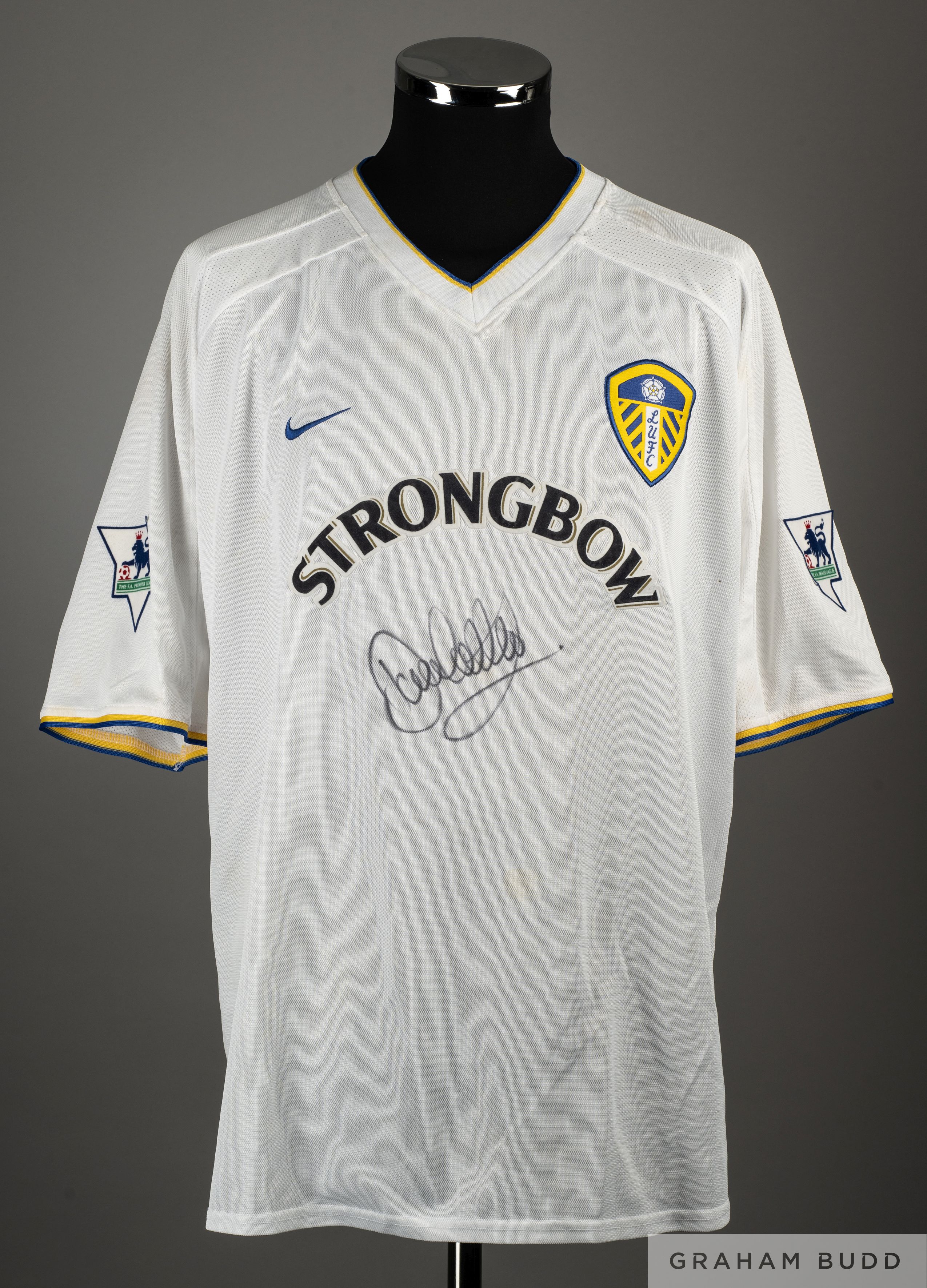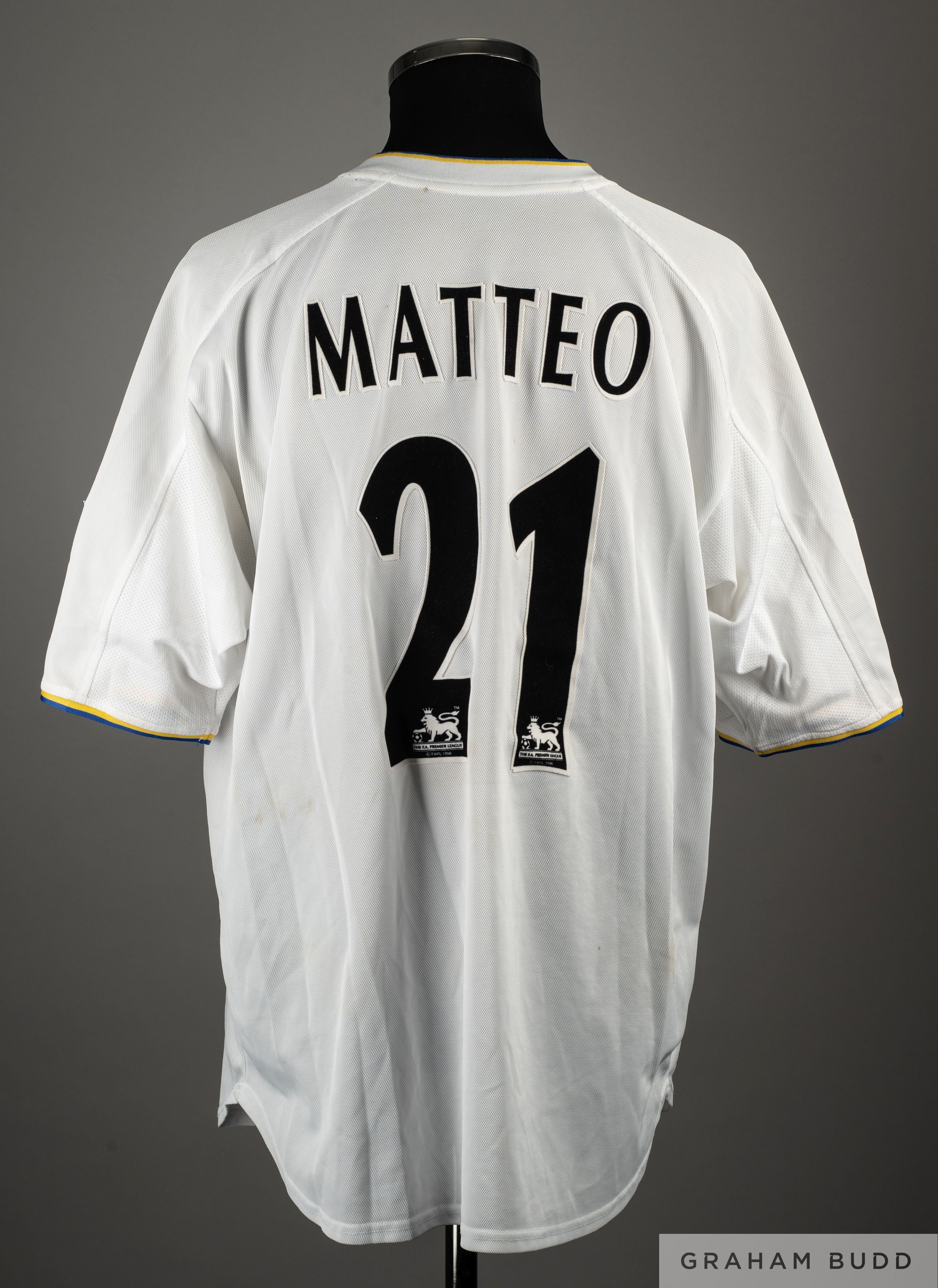 Dominic Matteo white and blue No.21 Leeds United match worn short-sleeved shirt, 2001-02, Nike, XL, with v-neck collar and embroidered cloth badge inscribed LUFC, the front of the shirt autographed by Dominic Matteo, the reverse lettered MATTEO, the sleeves with The F.A. Premier League flashes