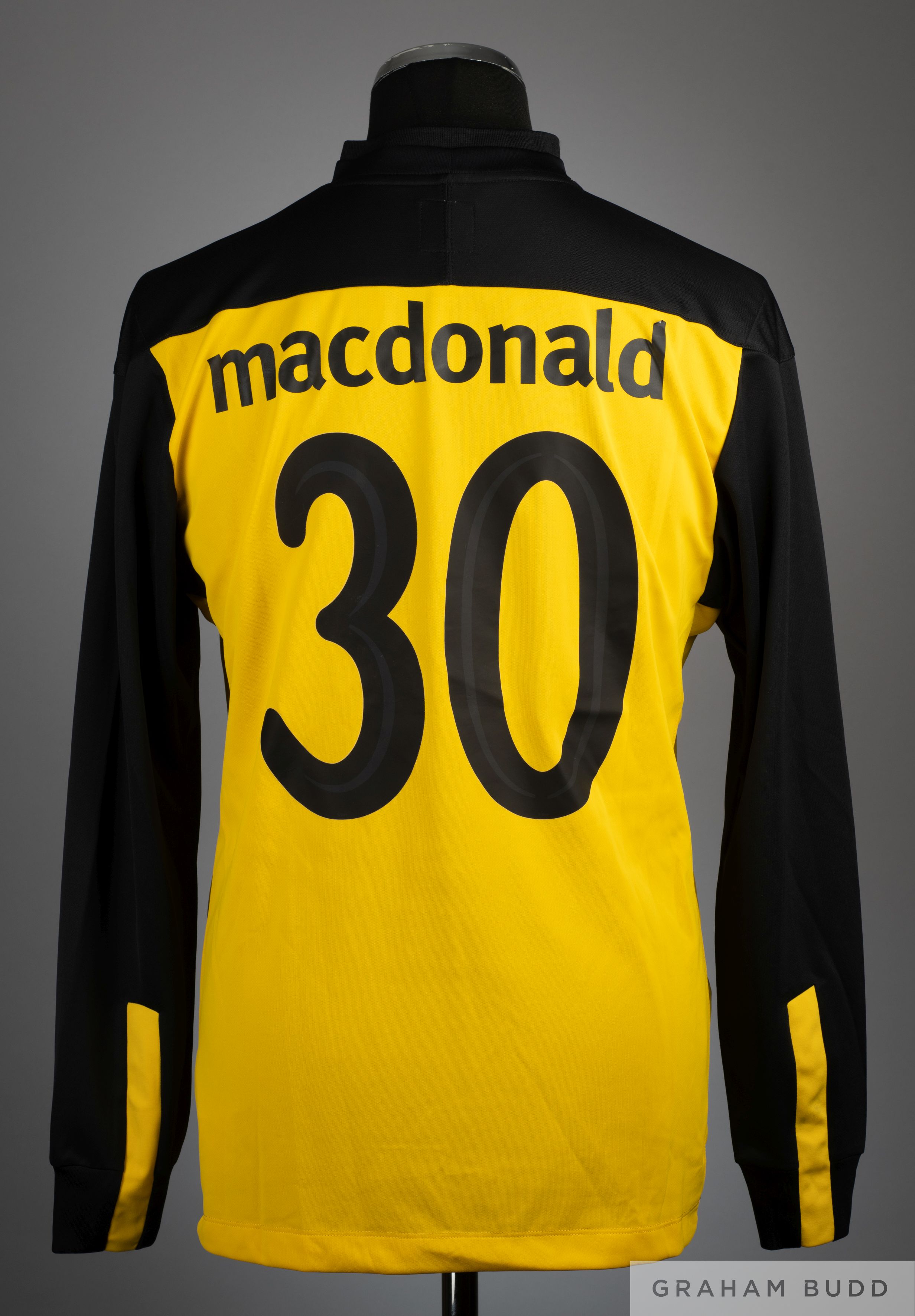 Jamie MacDonald yellow and black No.30 Hearts v. Tottenham Hotspur Europa League match worn goalkeepers shirt, 2011-12, Umbro, L, with crew-neck collar and embroidered cloth badge inscribed H.M F C 1874, the reverse lettered macdonald The above shirt was worn by Jamie MacDonald in the Europa League Playoff 2nd Leg match against Spurs played on the 25th August 2011, the match ending 0-0. However, MacDonald saving a Harry Kane taken penalty