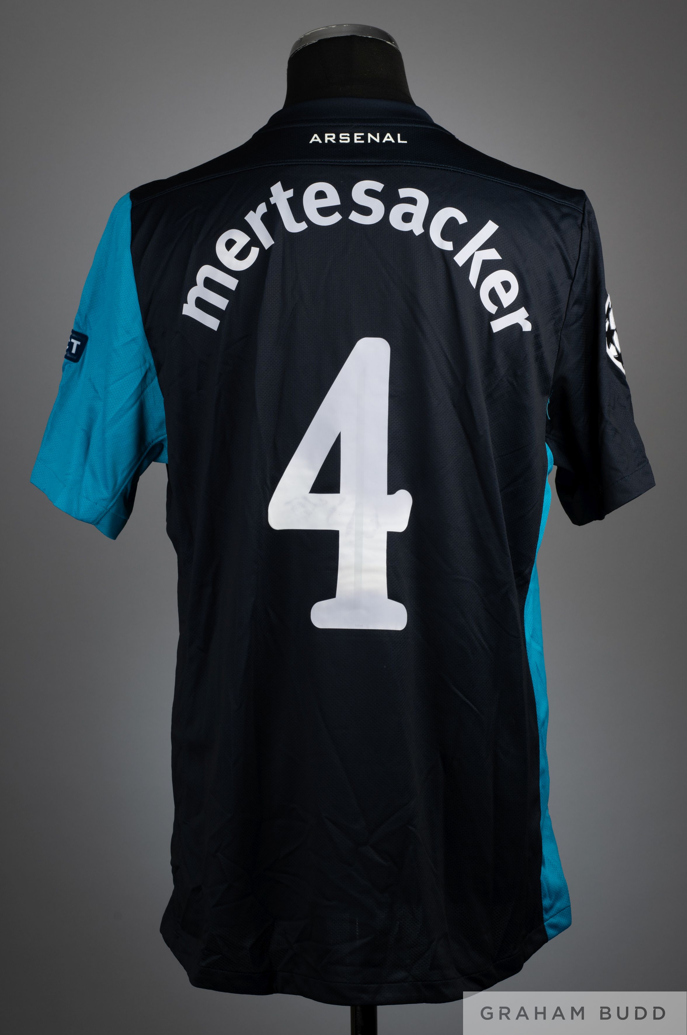 Per Mertesacker dark blue No.4 Arsenal v. Marseille Champions League match worn short-sleeved shirt, 2011-12, Nike, XL, with crew-neck collar and printed Arsenal badge, the reverse lettered mertesacker, the right sleeve with Champions League flash the left sleeve with UEFA Respect flash In the match against Marseille played on 19th October 2011, Arsenal defeated Marseille 1-0