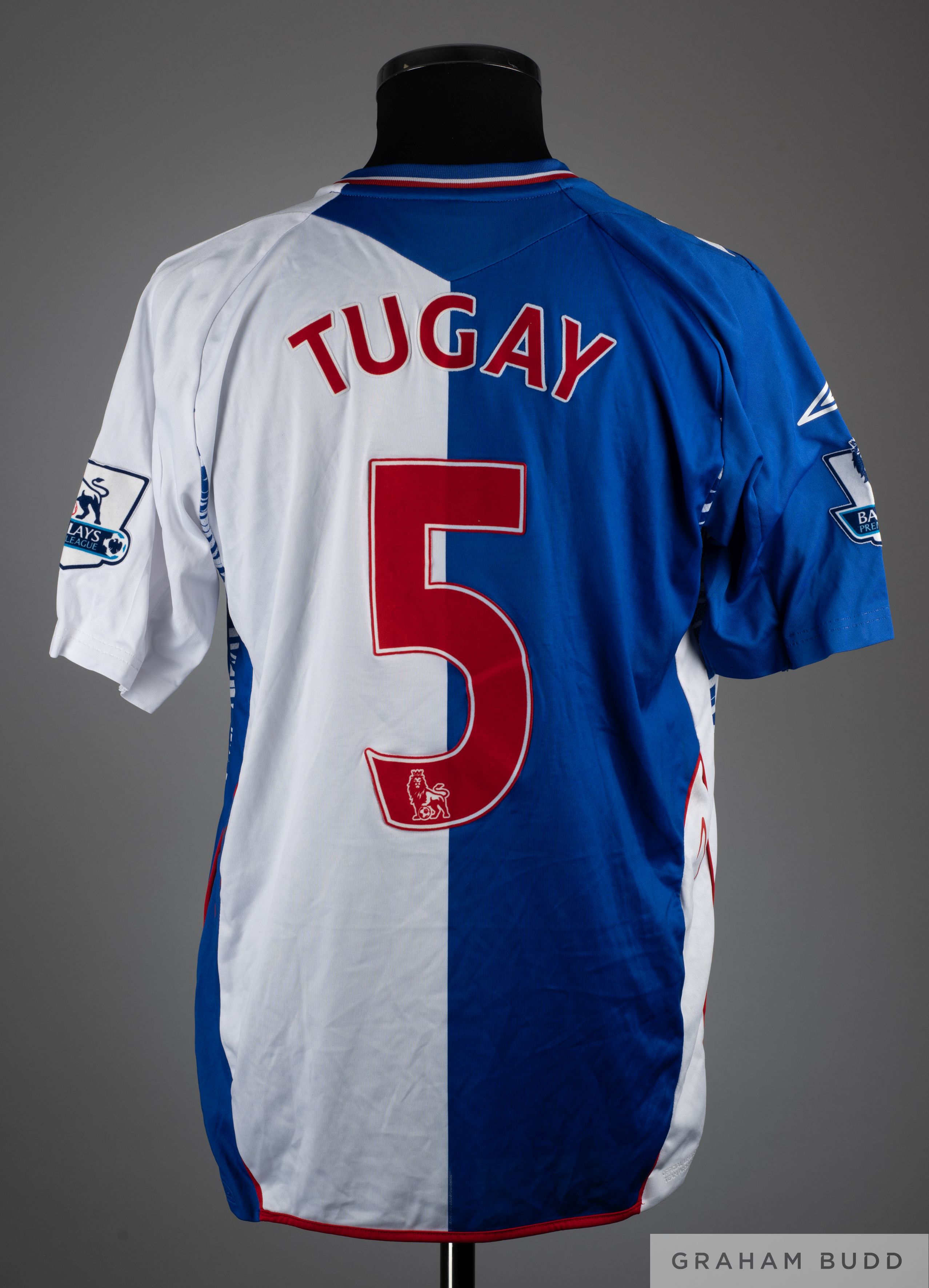 Tudgay blue and white No.5 Blackburn Rovers short sleeved shirt, 2006-7, Umbro, M, with v-neck collar and embroidered badge inscribed BLACKBURN ROVERS FC 1875 ARTE ET LABORE, the reverse lettered TUDGAY, the sleeves with Barclays Premier League flashes.
