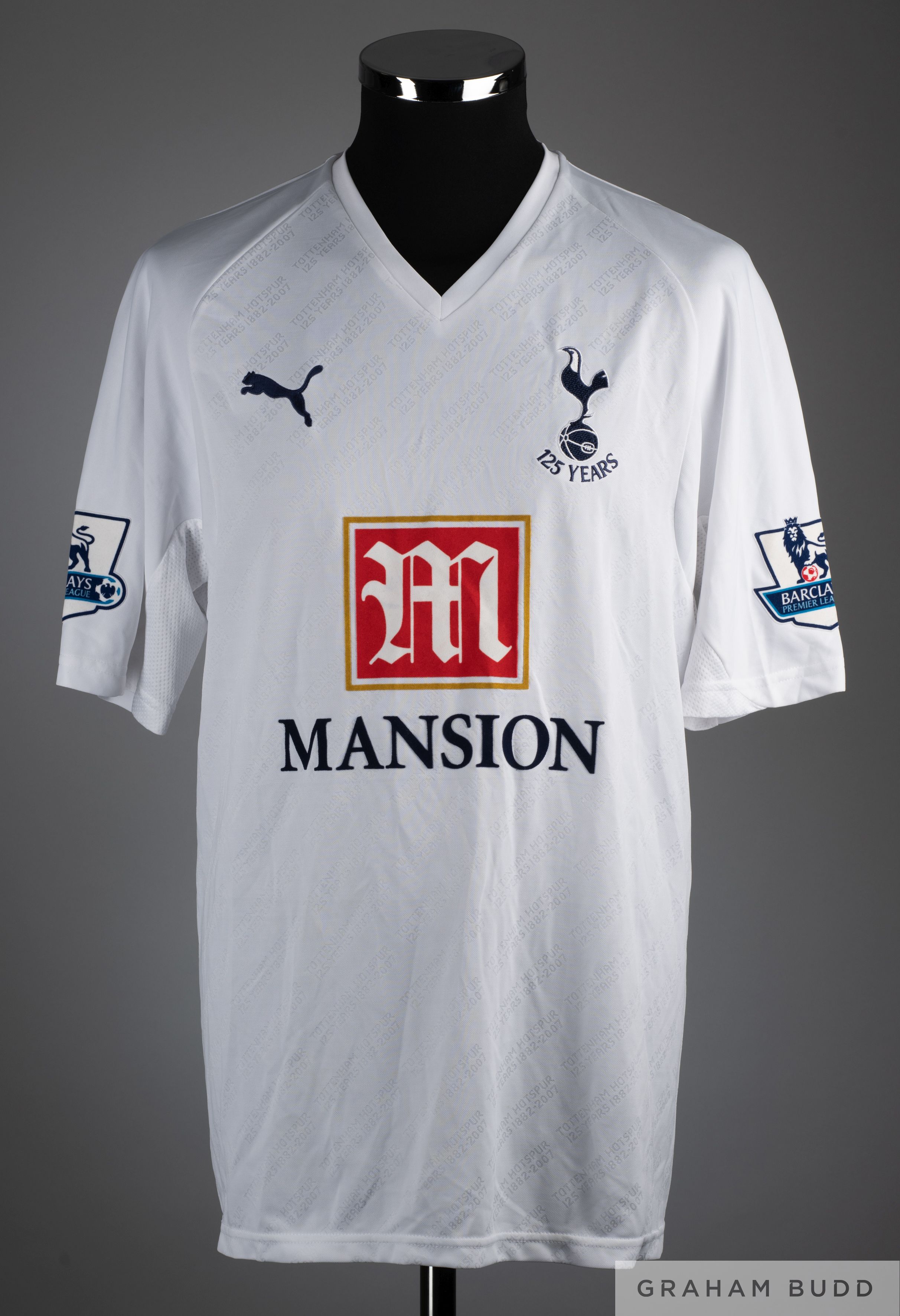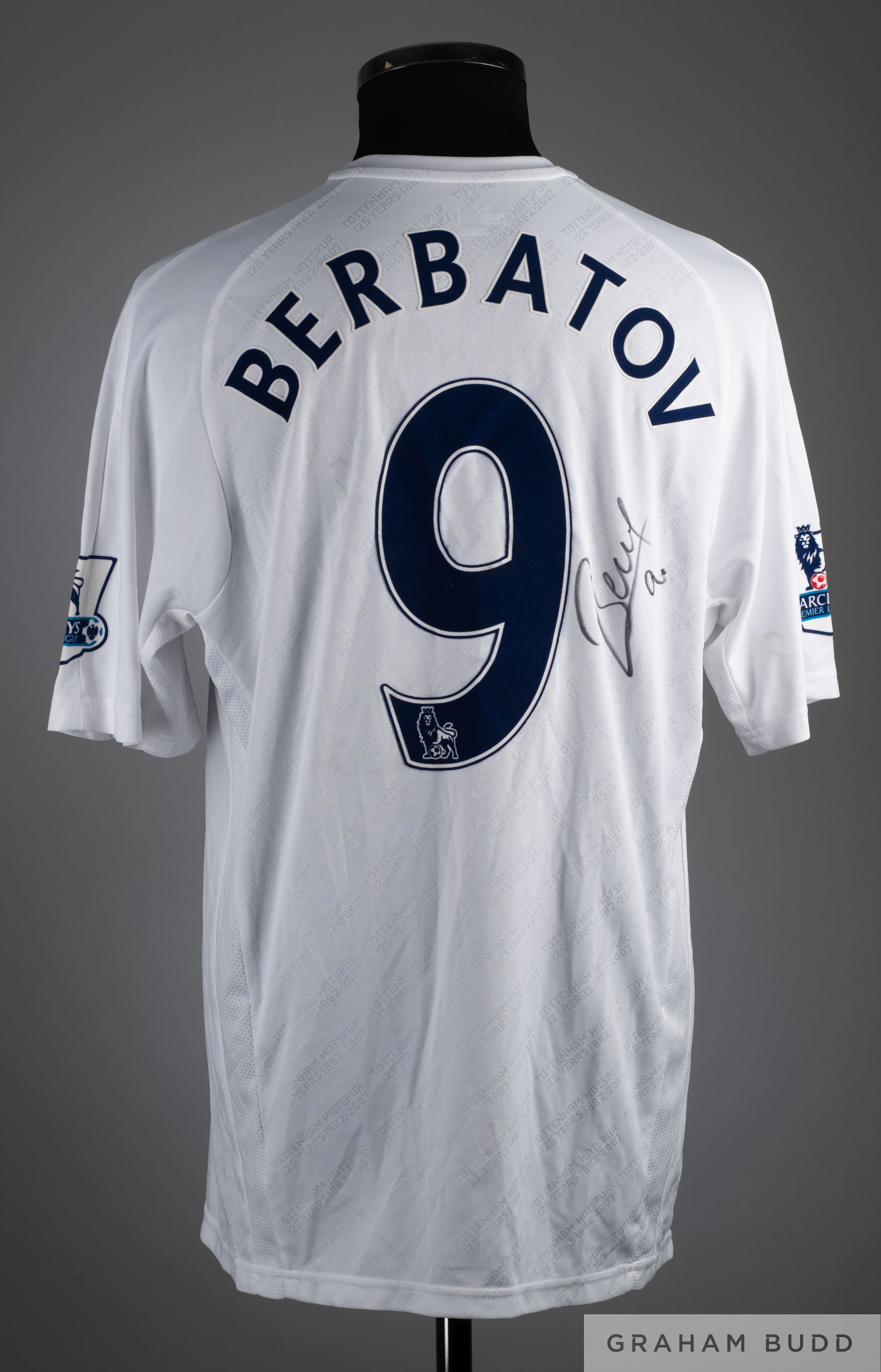 Dimitar Berbatov white No.9 Tottenham Hotspur short sleeved shirt, Puma L with V neck and embroidered badge inscribe 125 YEARS, the reverse lettered BERBATOV, the sleeves with Barclays Premier League flashes and signed on the back.