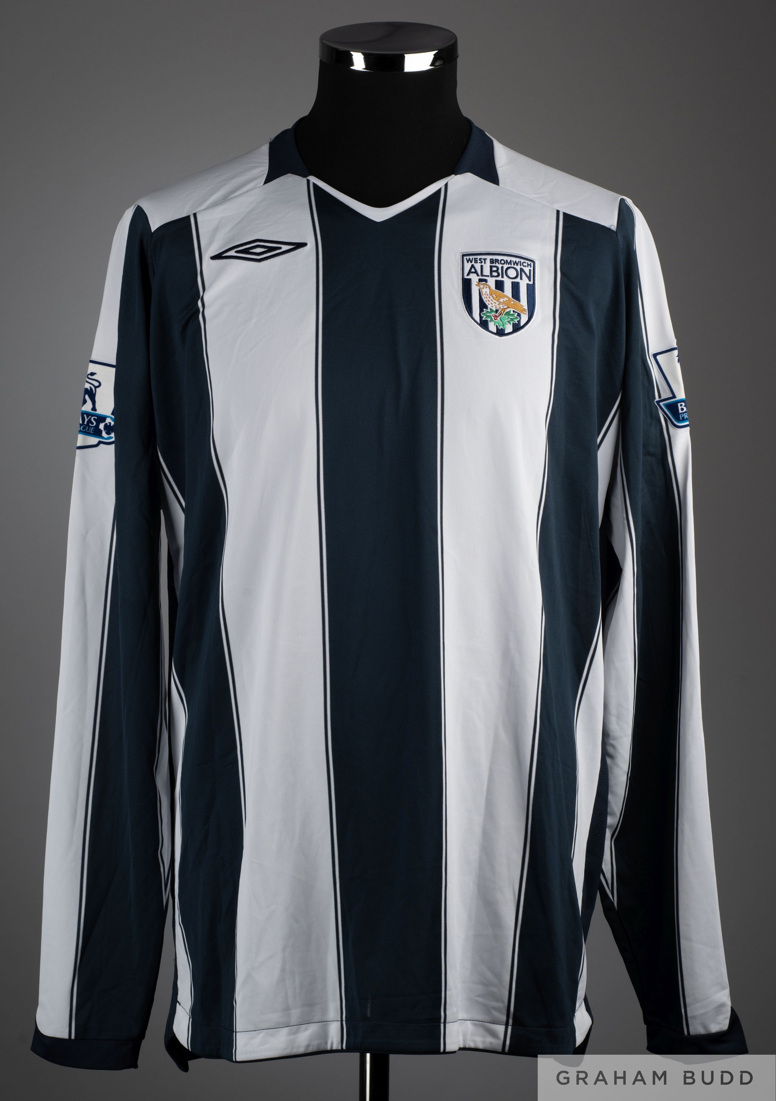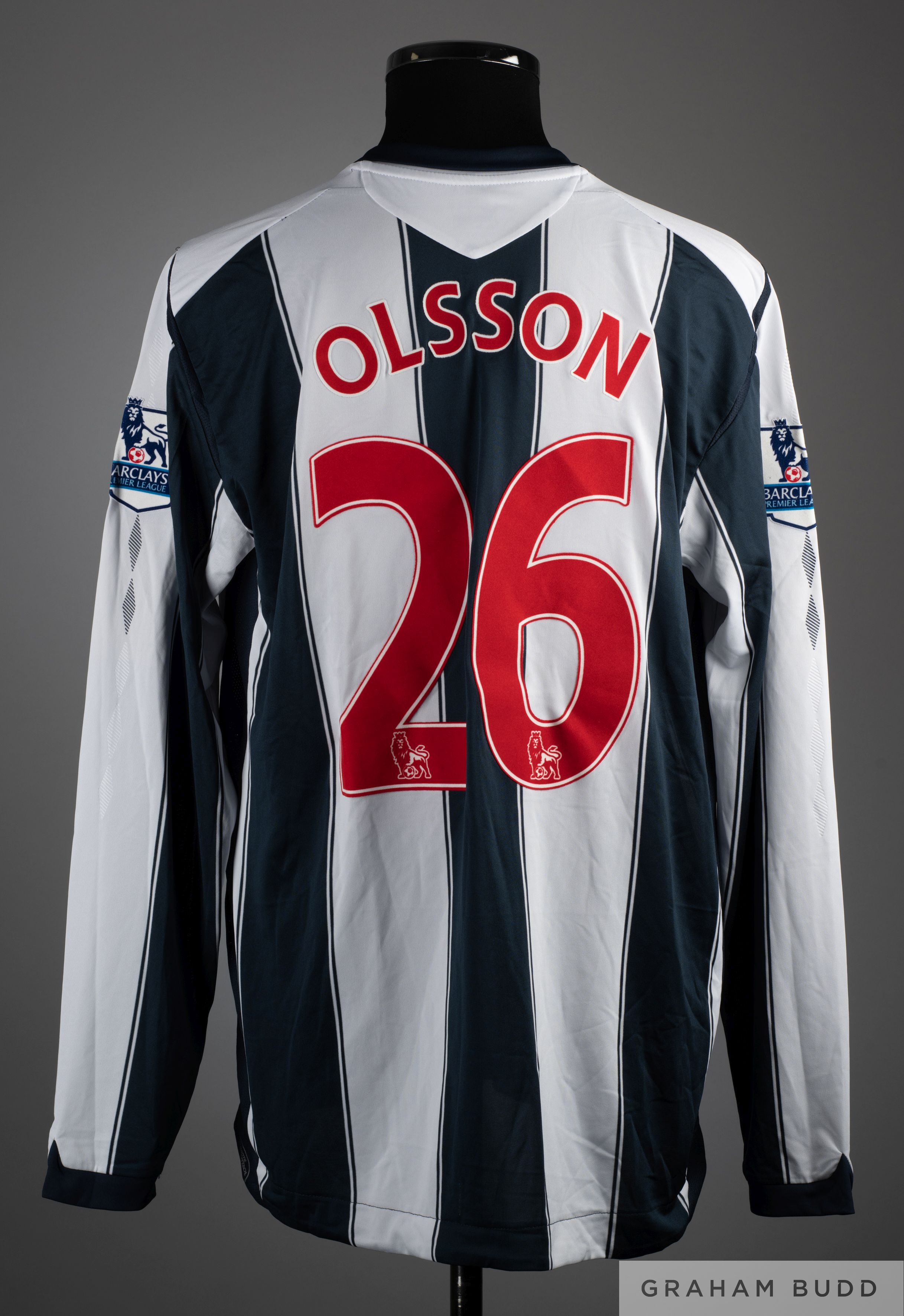 Jonas Olsson blue and white No.26 West Bromwich Albion long sleeved shirt, Umbro, XL, with v-neck collar and embroidered badge inscribed WEST BROMWICH ALBION, the reverse lettered OLSSON, the sleeves with Barclays Premier League flashes.