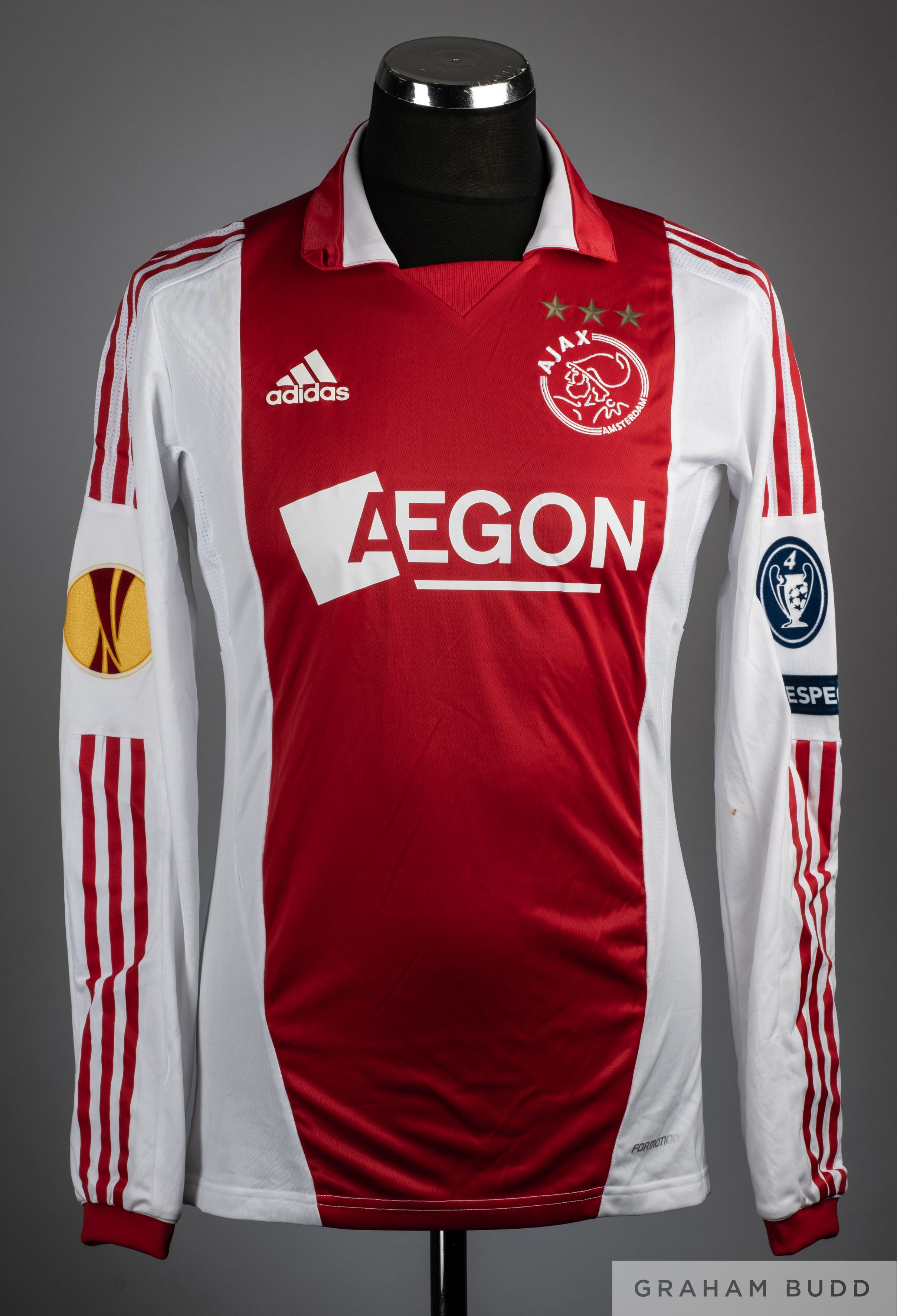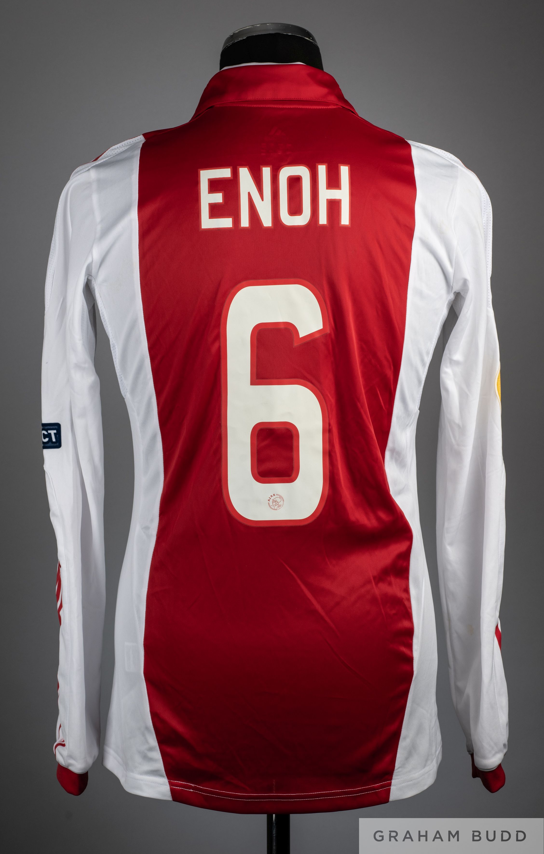 Eyong Enoh red and white No.6 Ajax long sleeve shirt 2011-12, Adidas, size M, V neck with embroidered cloth badge inscribed AJAX Amsterdam, back lettered ENOH, Champions League and Respect flashes on left sleeve, Respect flash on right.