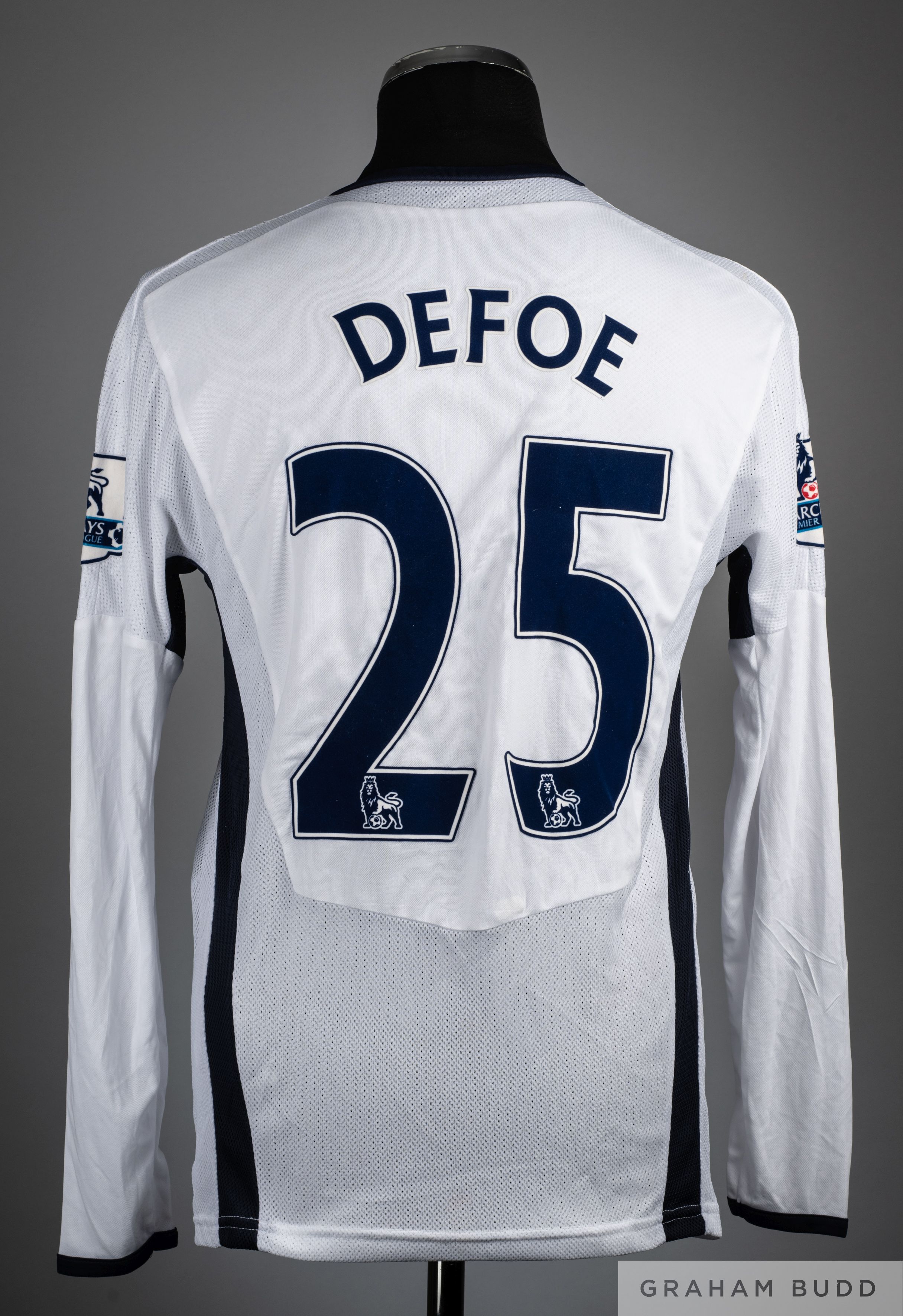 Jermaine Defoe white and blue No.25 Tottenham Hotspur long sleeved shirt 2008-09, Puma, size M, V neck with embroidered cloth badge, back lettered DEFOE, Barclays Premiership sleeve flashes.
