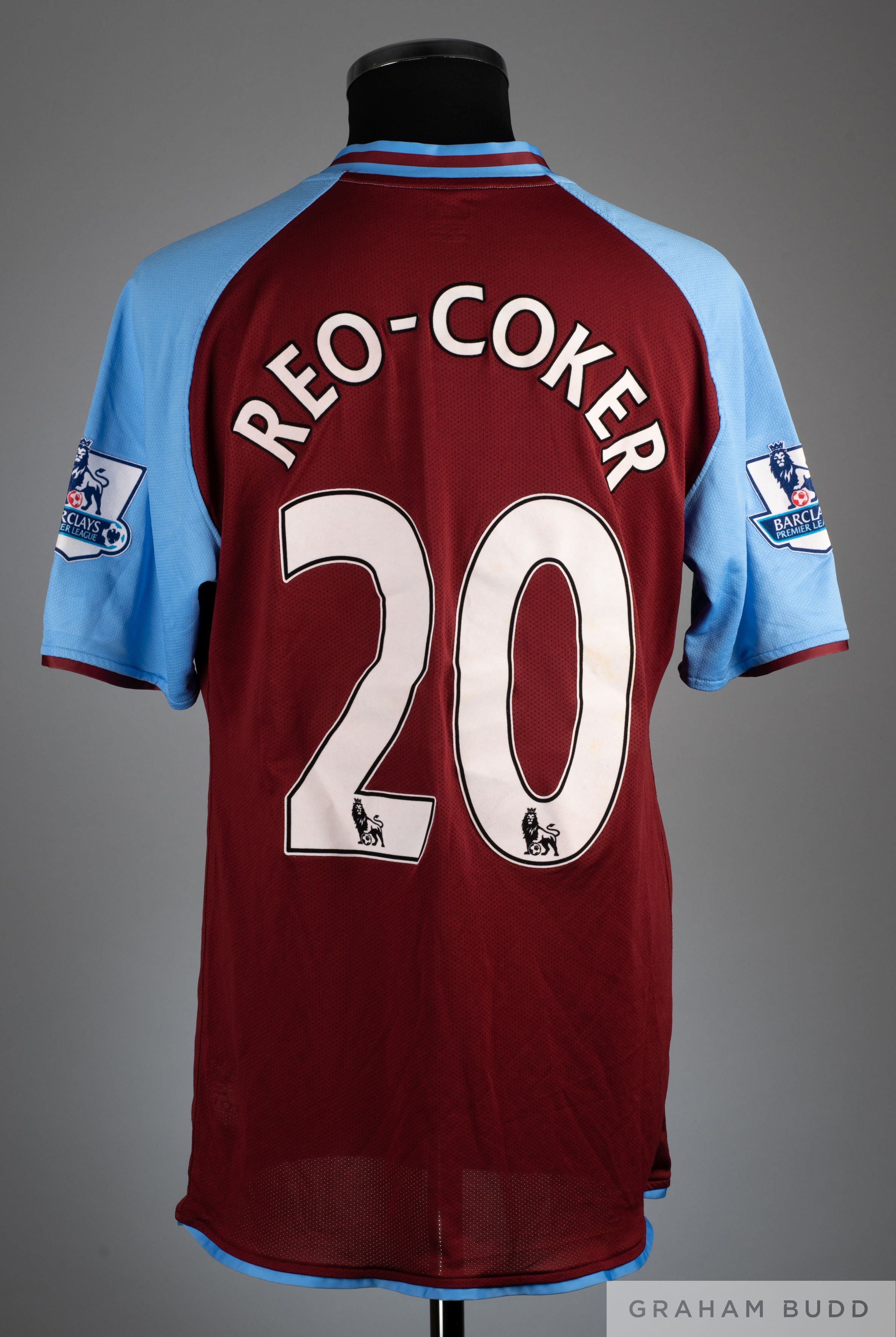 Nigel Reo-Coker claret and blue No.20 Aston Villa shirt 2008-09, Adidas, size XL, V neck with embroidered cloth badge inscribed AVFC Prepared, back lettered REO COKER, Barclays Premier League sleeve flashes.