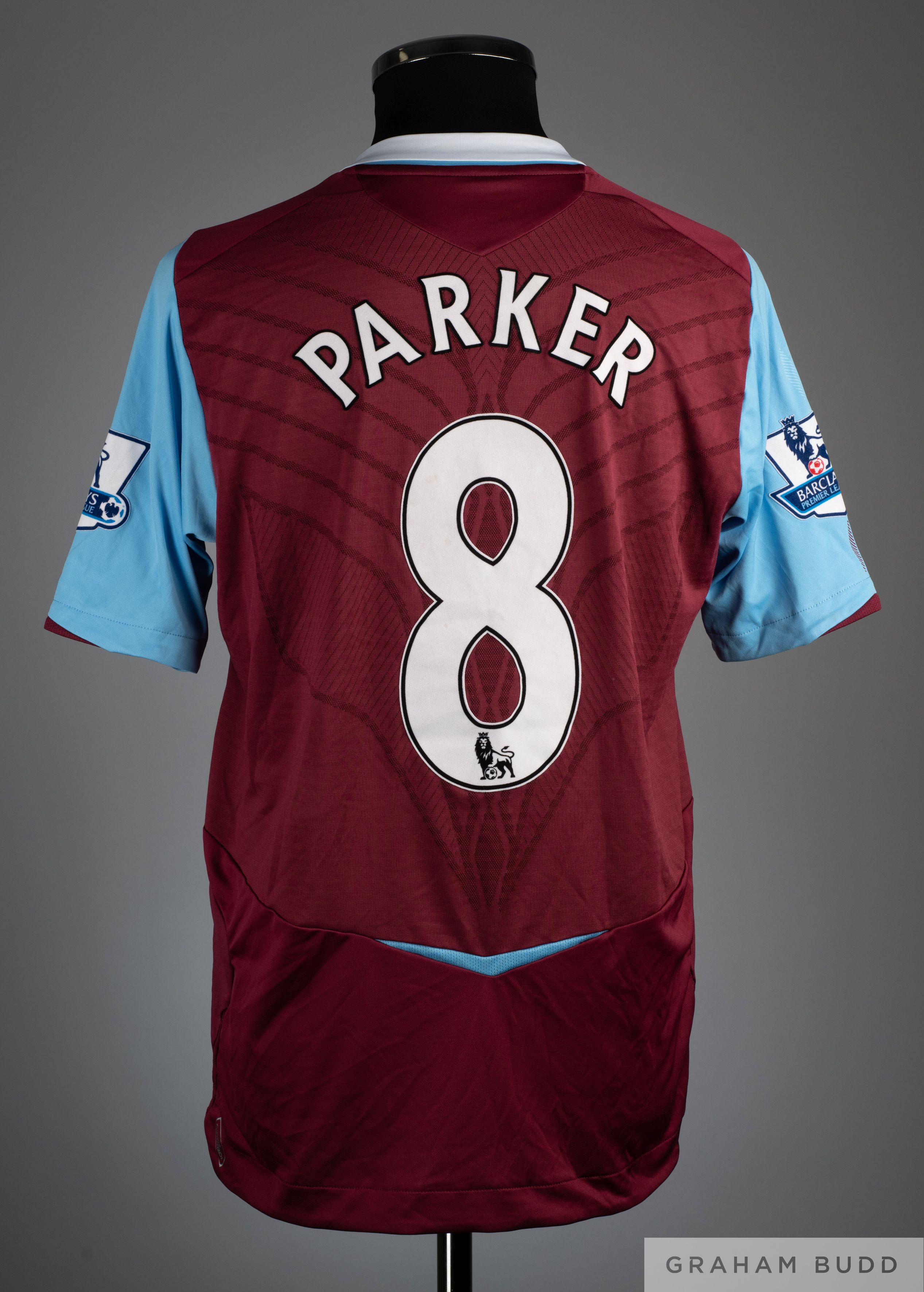 Scott Parker claret and blue No.8 West Ham United short sleeved shirt 2008, Umbro, size M, V neck with embroidered cloth badge inscribed West Ham United , back lettered PARKER, Barclays Premier League sleeve flashes.