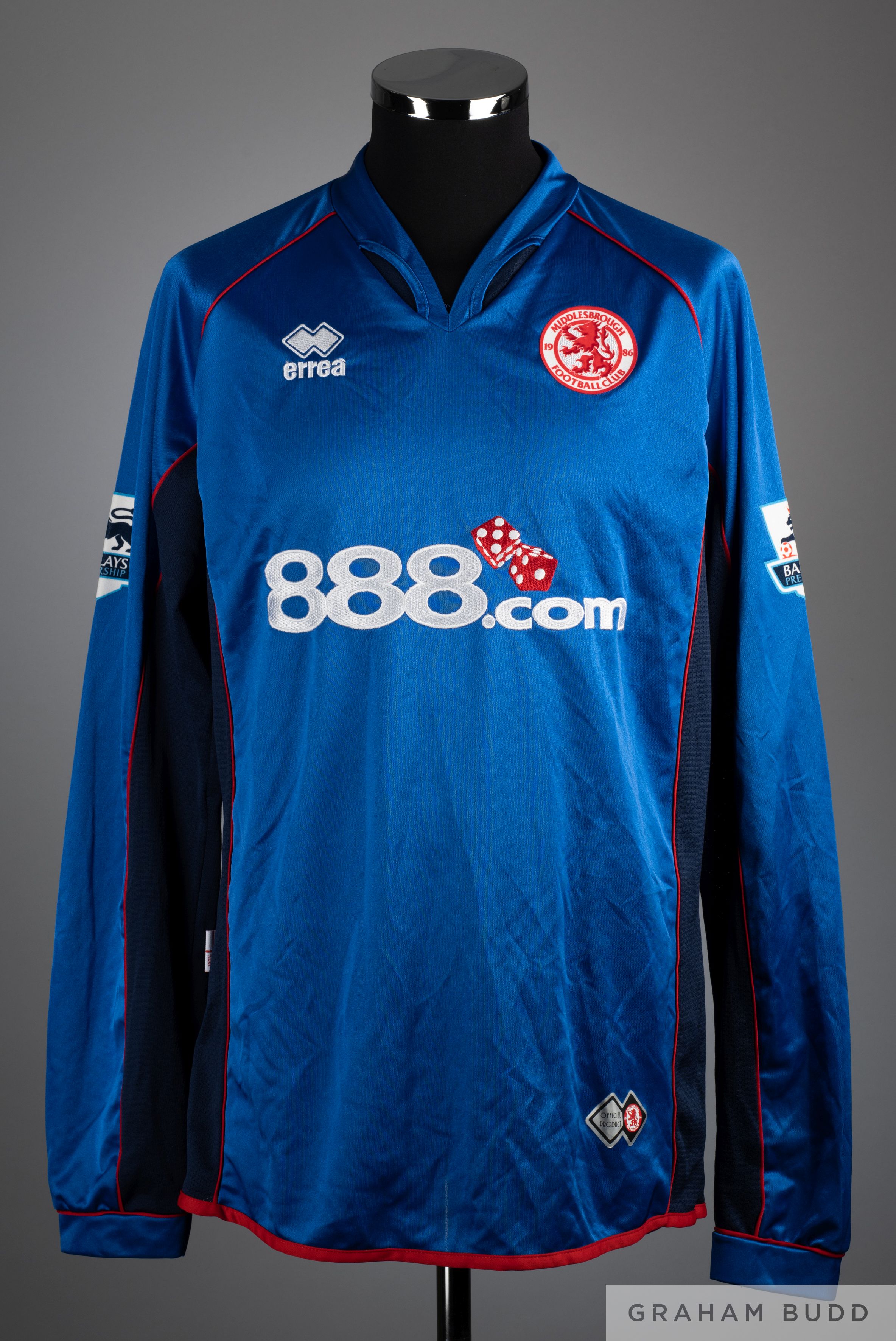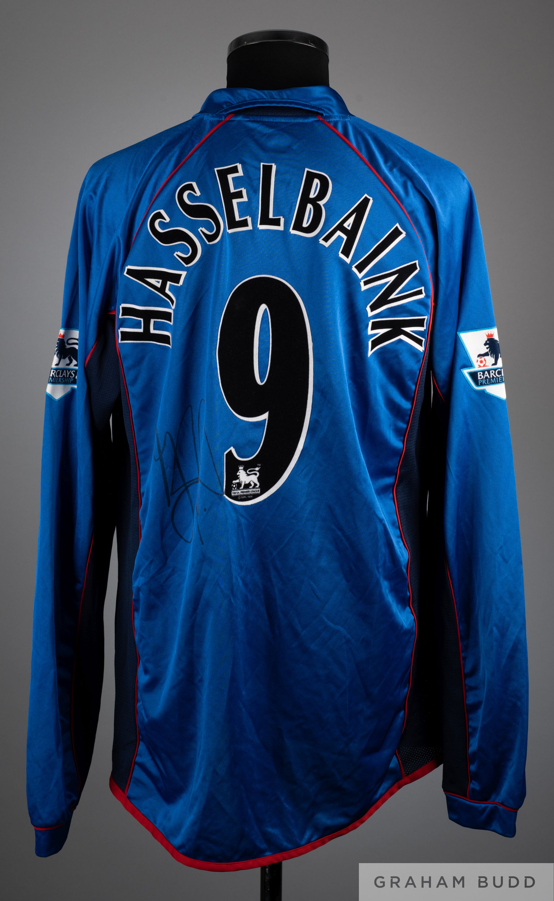 Jimmy Floyd Hasselbaink signed blue No.9 Middlesbrough long sleeved shirt 2005-06, Errea, size XL, V neck with embroidered cloth badge inscribed MIDDLESBOROUGH FOOTBALL CLUB 1986, reverse lettered HASSELBAINK and signed in black marker pen, Barclays Premiership sleeve flashes.
