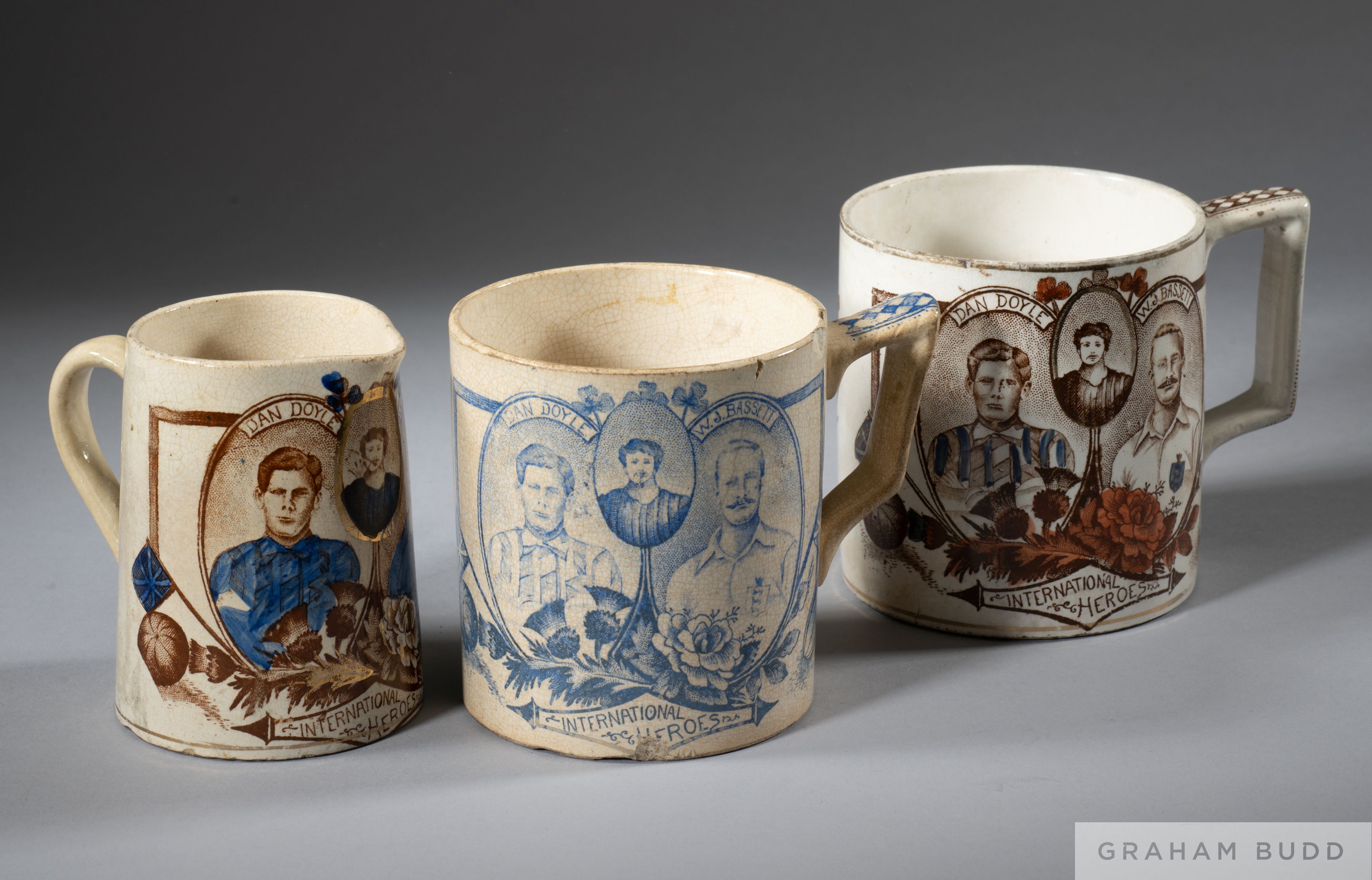 A trio of rare Scottish Victorian pottery each commemorating the Scotland and England football heroes Dan Doyle and W J Bassett, 1890s, by Clyde Pottery Company, Glasgow, all with similar decoration, the first the mug printed in blue glazes with THE NAMED portraits of the two players inscribed INTERNATIONAL HEROES, and to the reverse with a depiction of a football match, various chips; the second mug very similarly designed but in various colours, minor chips; the cream jug with similar portraits in painted coloured glazes with gilt detailing, but with no match depiction, chips to base, all 10cm. height, (3) Scottish international Dan Doyle played for Celtic and England international Bill Bassett played for West Bromwich Albion.