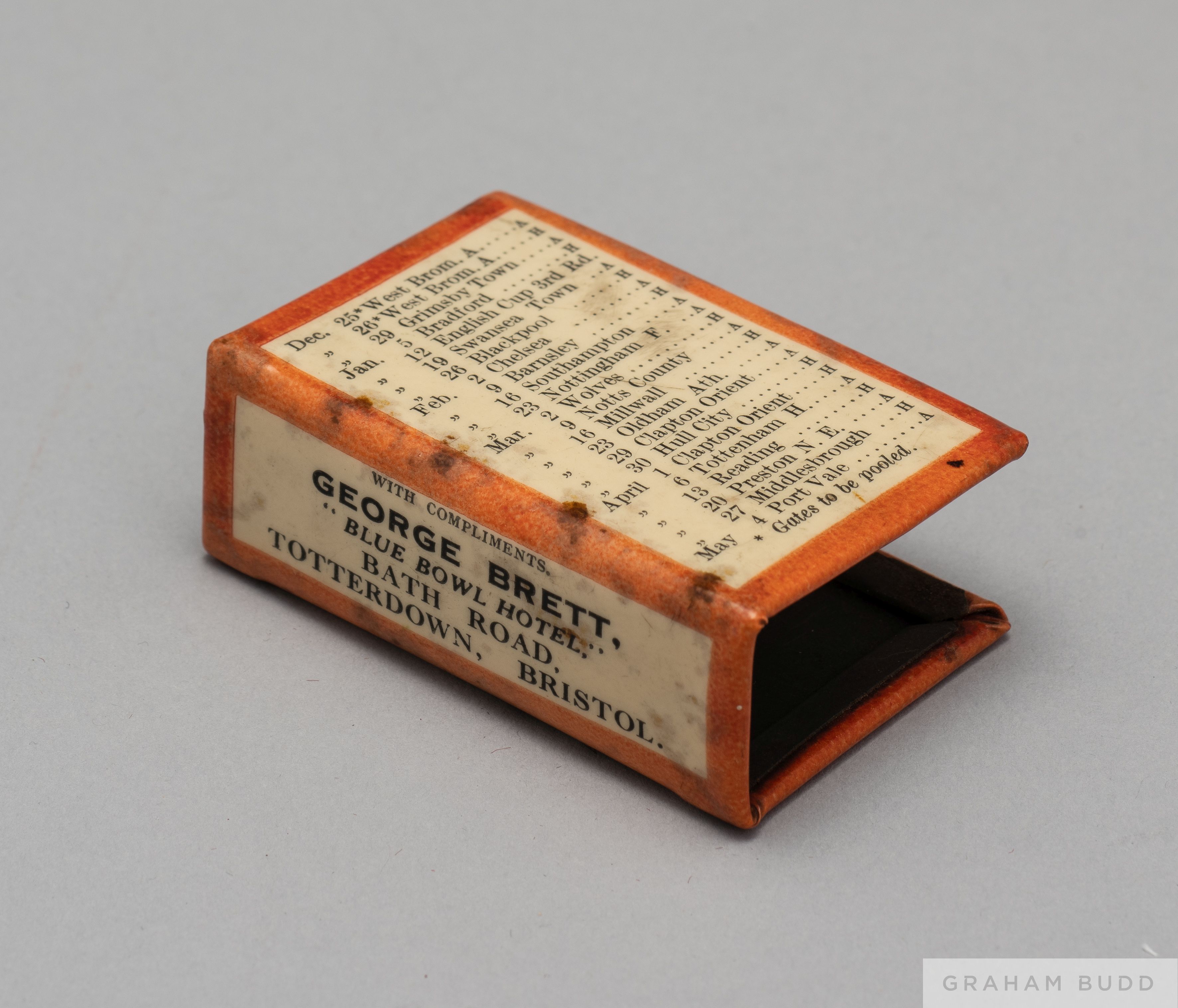 1928/29 Bristol City Fixtures Match Box holder, with fixtures up to December on the front and December to May on the reverse. The spine is lettered GEORGE BRETT, "Blue Ball Hotel", Bath Road, Totterdown, Bristol.