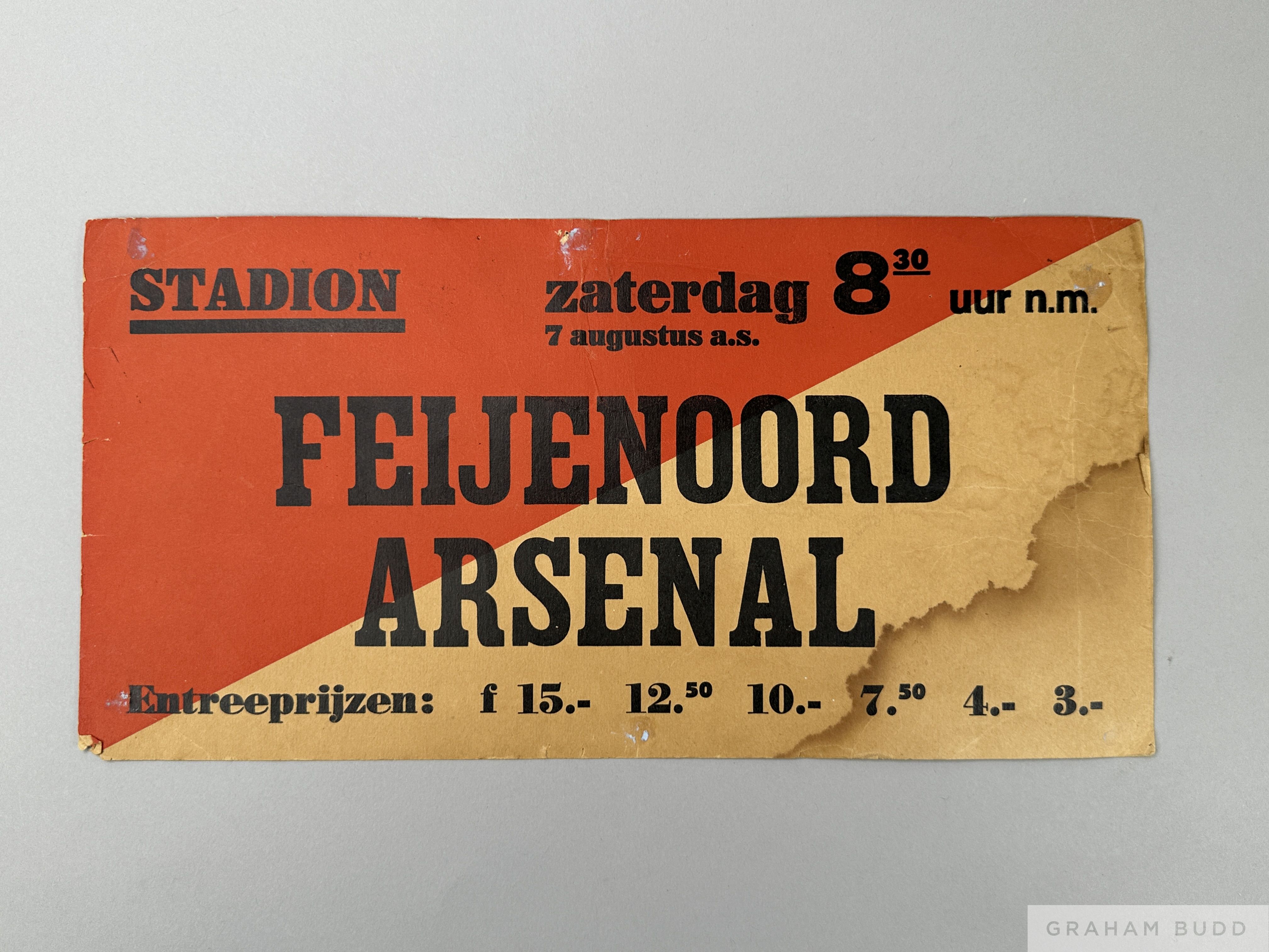 Rare Feyenoord v. Arsenal, Rotterdam tram sign relating to a friendly match, 18 by 34cm Water damage