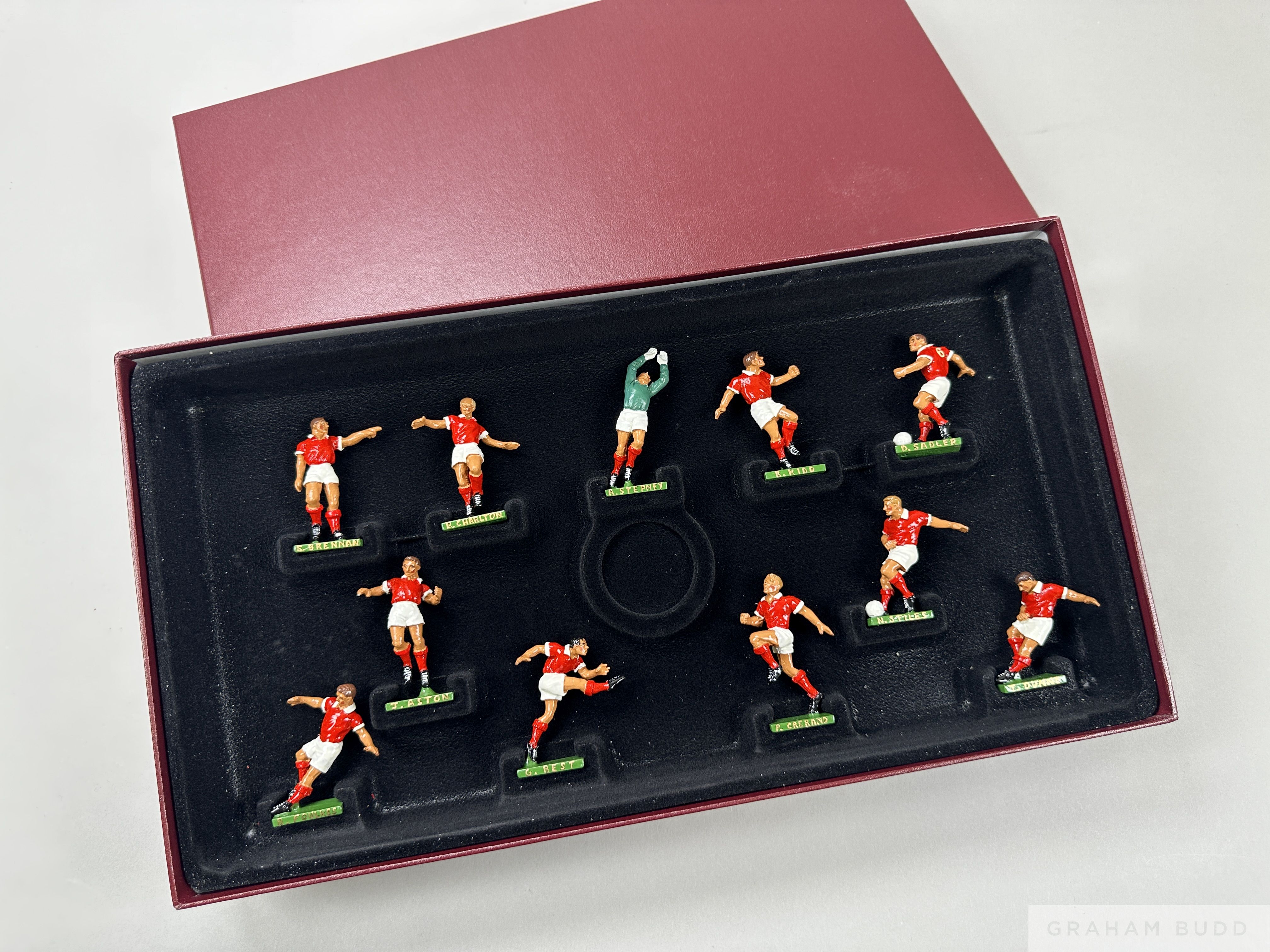 Football Action Series Manchester United 1968 European Cup Winners by RP World Models Limited, wearing the red and white home kit, each painted played standing upon a plinth with painted name, bearing makers stamp to each base, in a fitted box with original cardboard cover, in excellent condition.