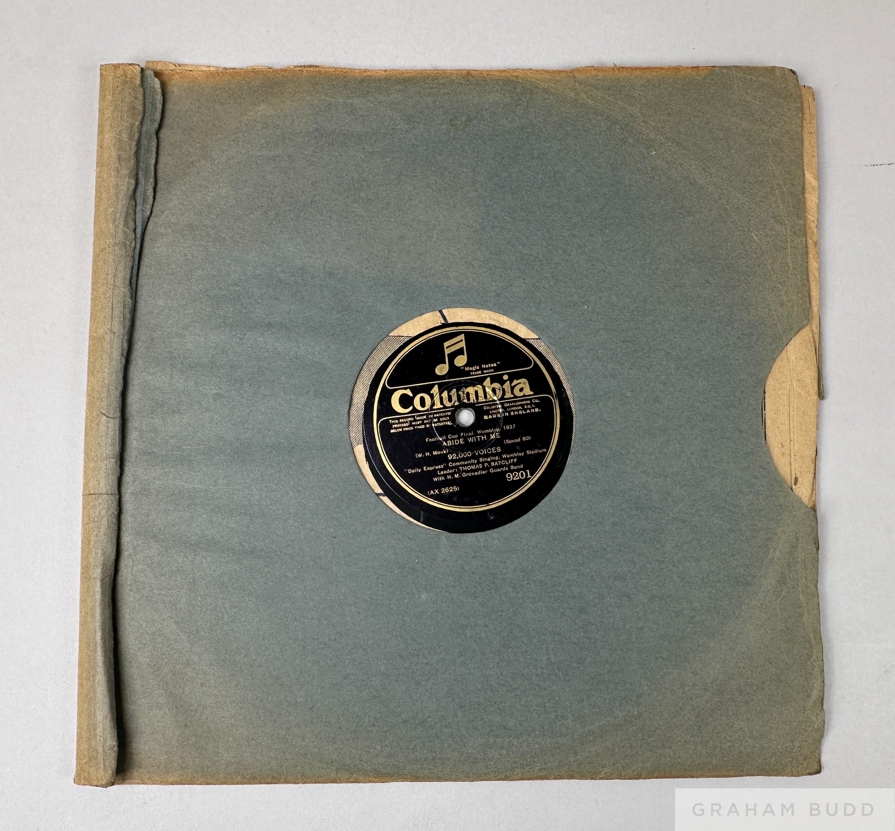 A shellac Columbia records 78 rpm disc of the crowd signing at the 1927 FA Cup Final between Cardiff City and Arsenal The record is in its original sleeve and shows signs of wear and handling along with scratches.