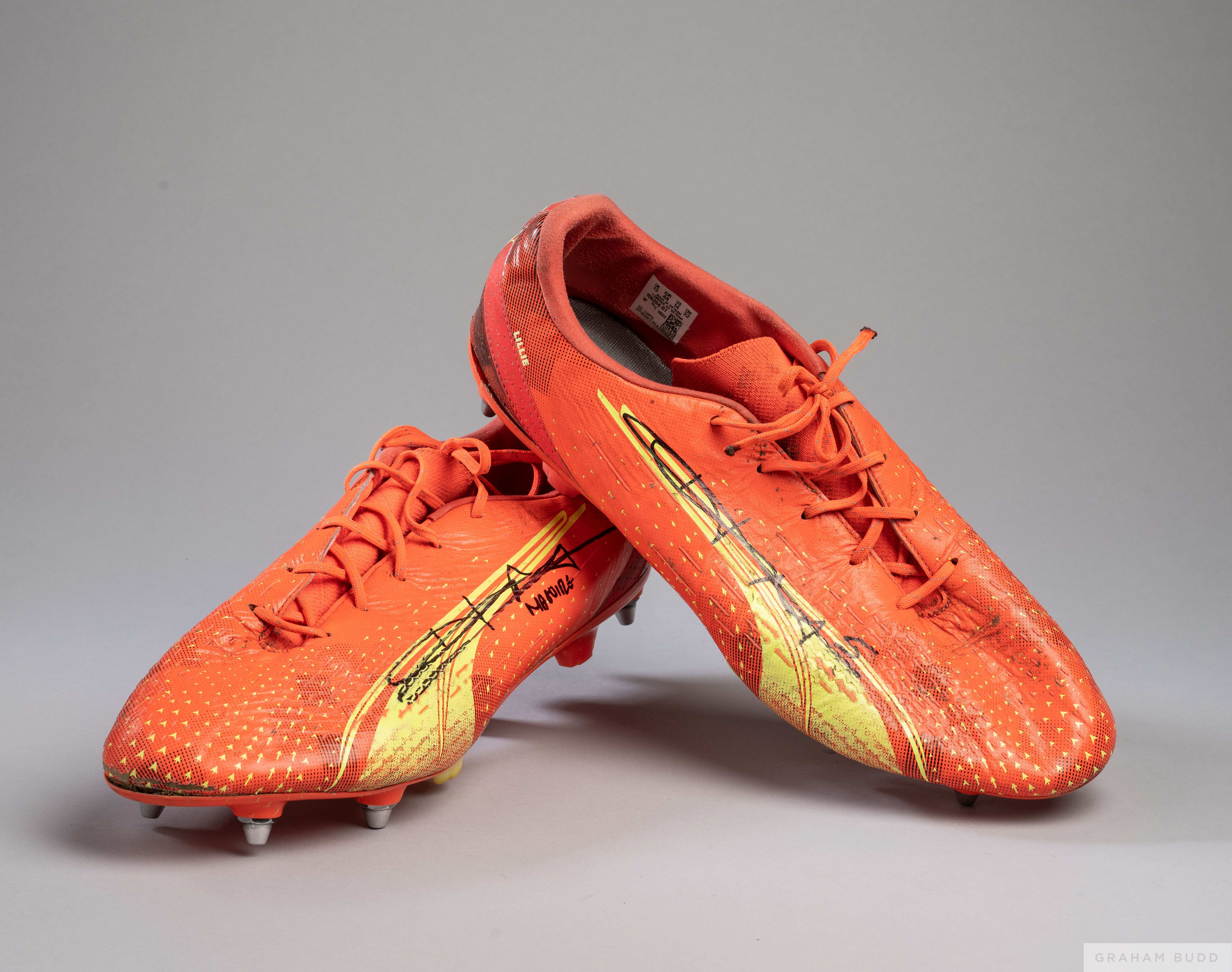 Harry Maguire orange Puma football boots, size 13, match worn with England badge on the back, PIPER printed on the left boot and LILLIE printed on the right. The left is also signed MAGUIRE and the right his signature and the squad No.5. The boots are in a match worn condition. The boots were donated by Harry Maguire to the Mosborough bowling club of Sheffield as part of their fund raising to install floodlights.
