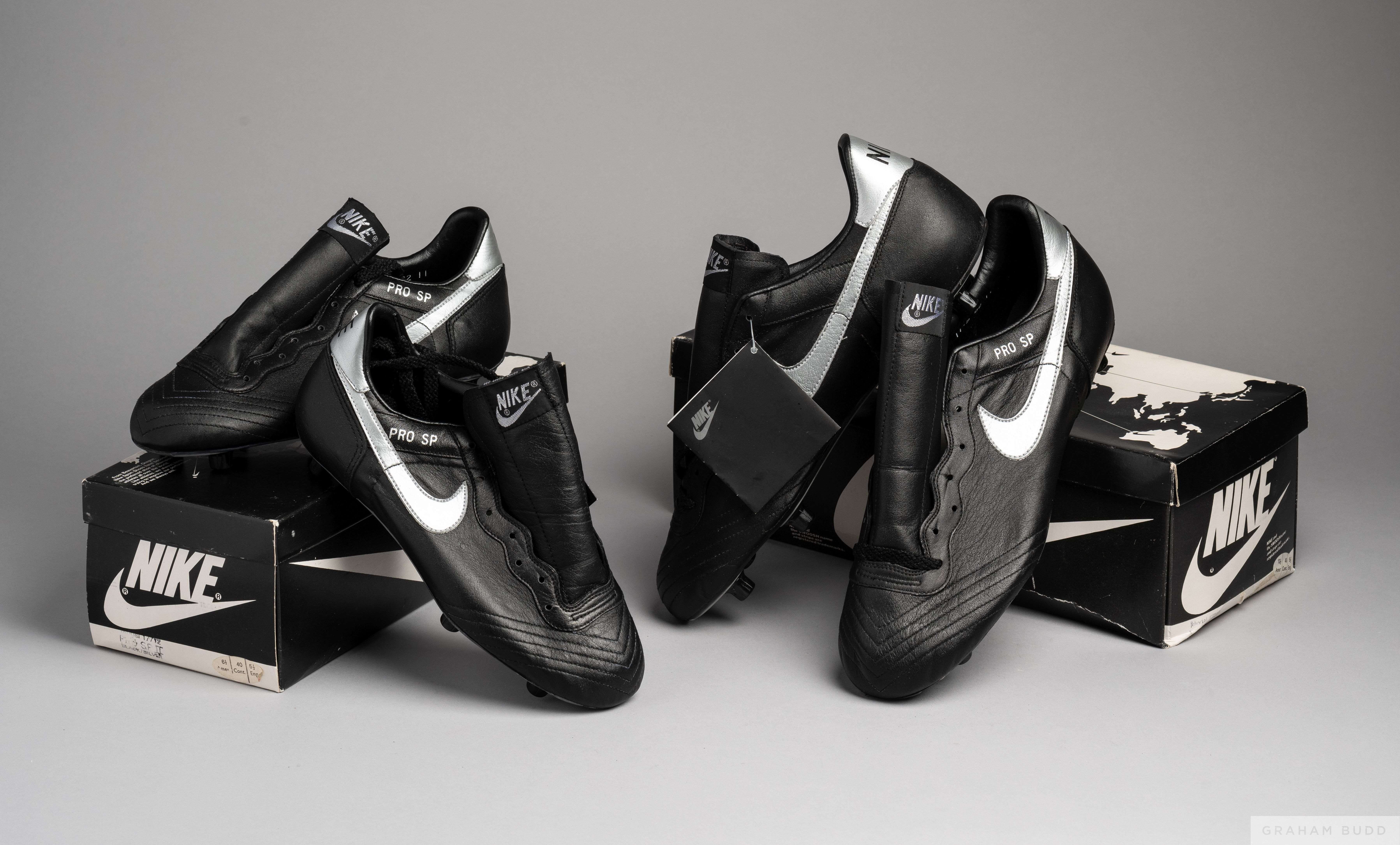 Two pairs of vintage Nike PRO III football boots, size 39 and 45, black and silver, model 17712, in original boxes, one box marked with incorrect size information, unworn condition (2)