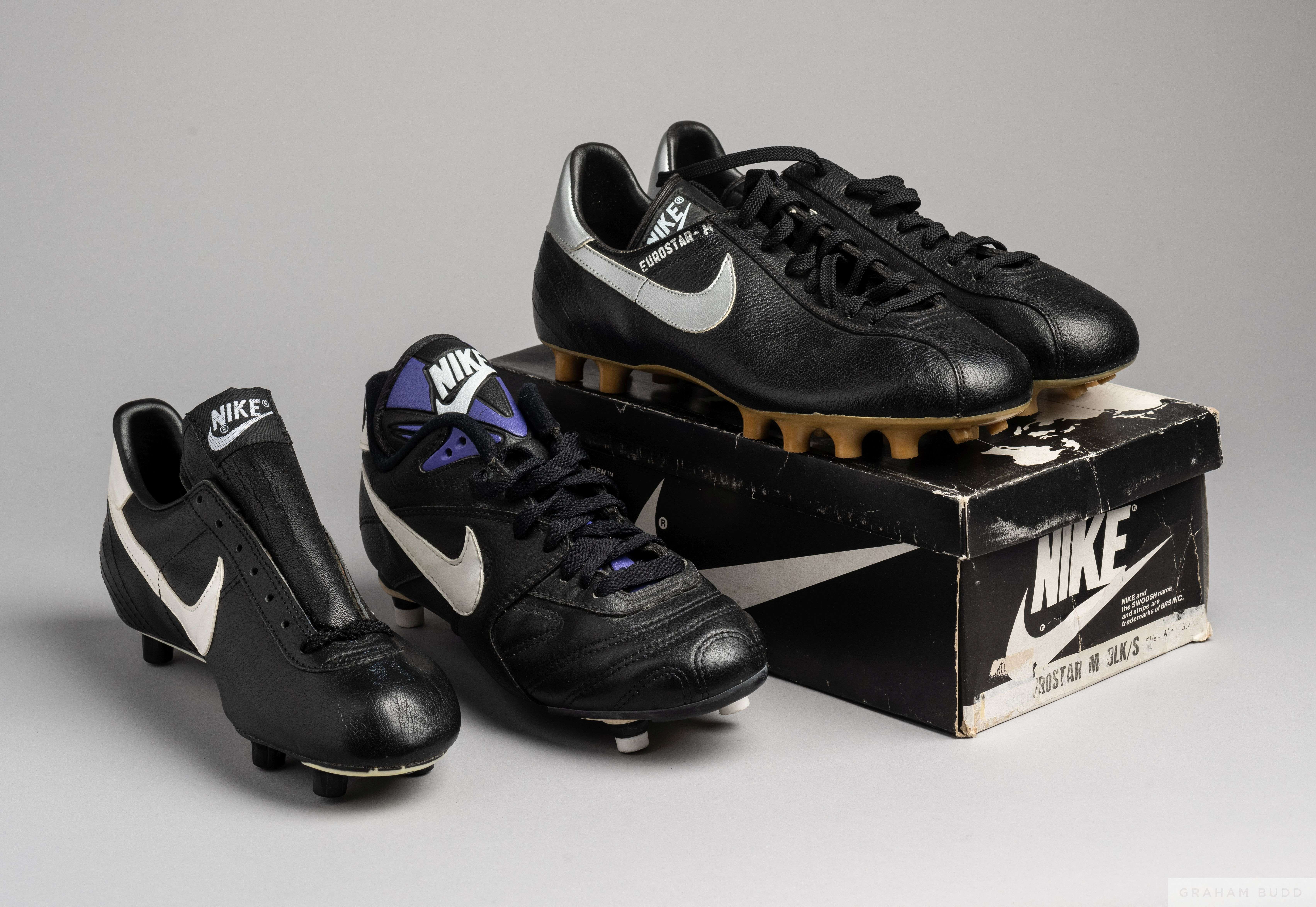 Pairs of vintage Nike Eurostar football boots, size 5 1/2, black and silver, model 17712, in original box, unworn condition and two single Nike foot