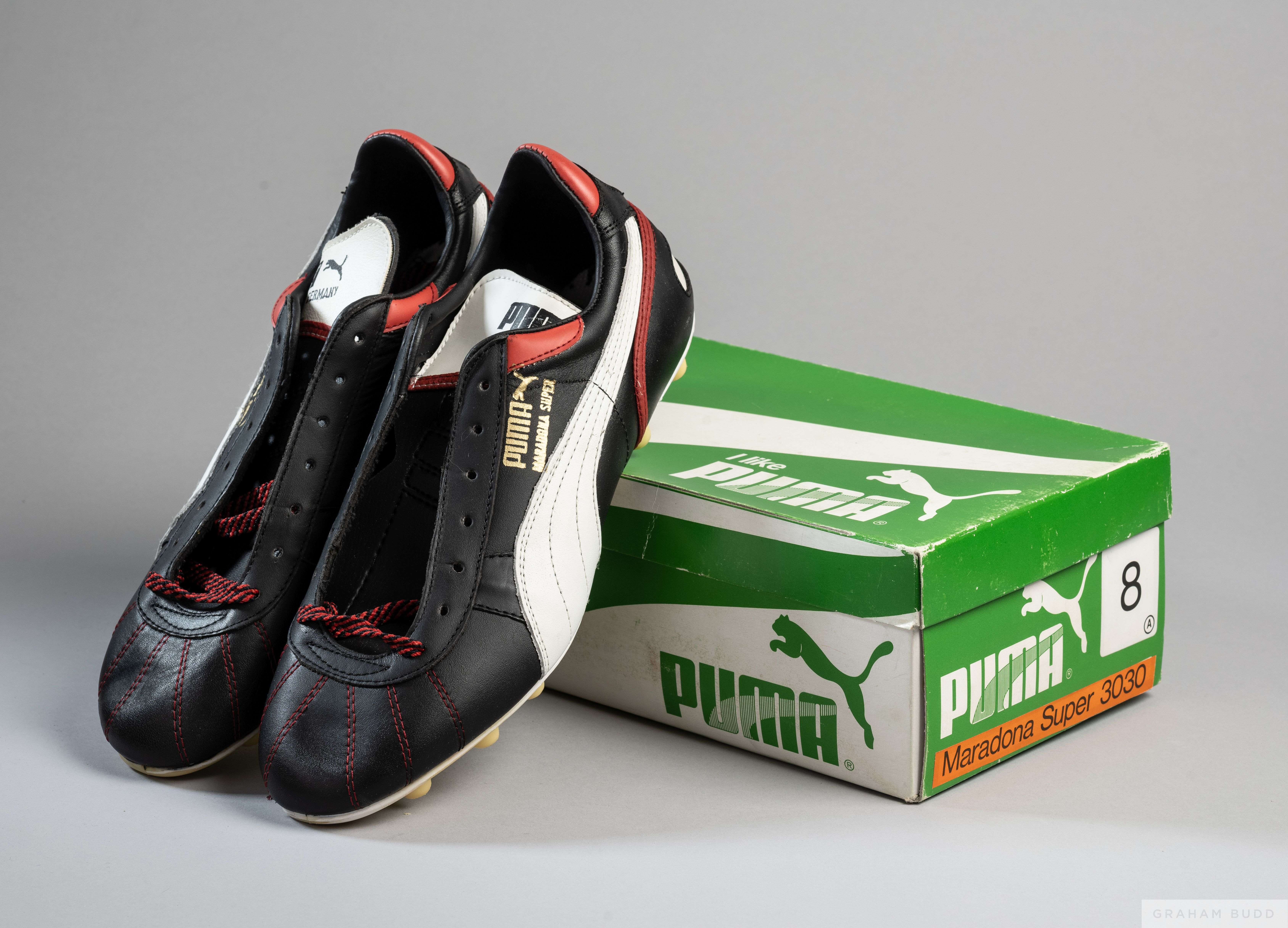 Pair of vintage Puma Maradona Super football boots, size 8, black, white and red in unworn condition, in original box