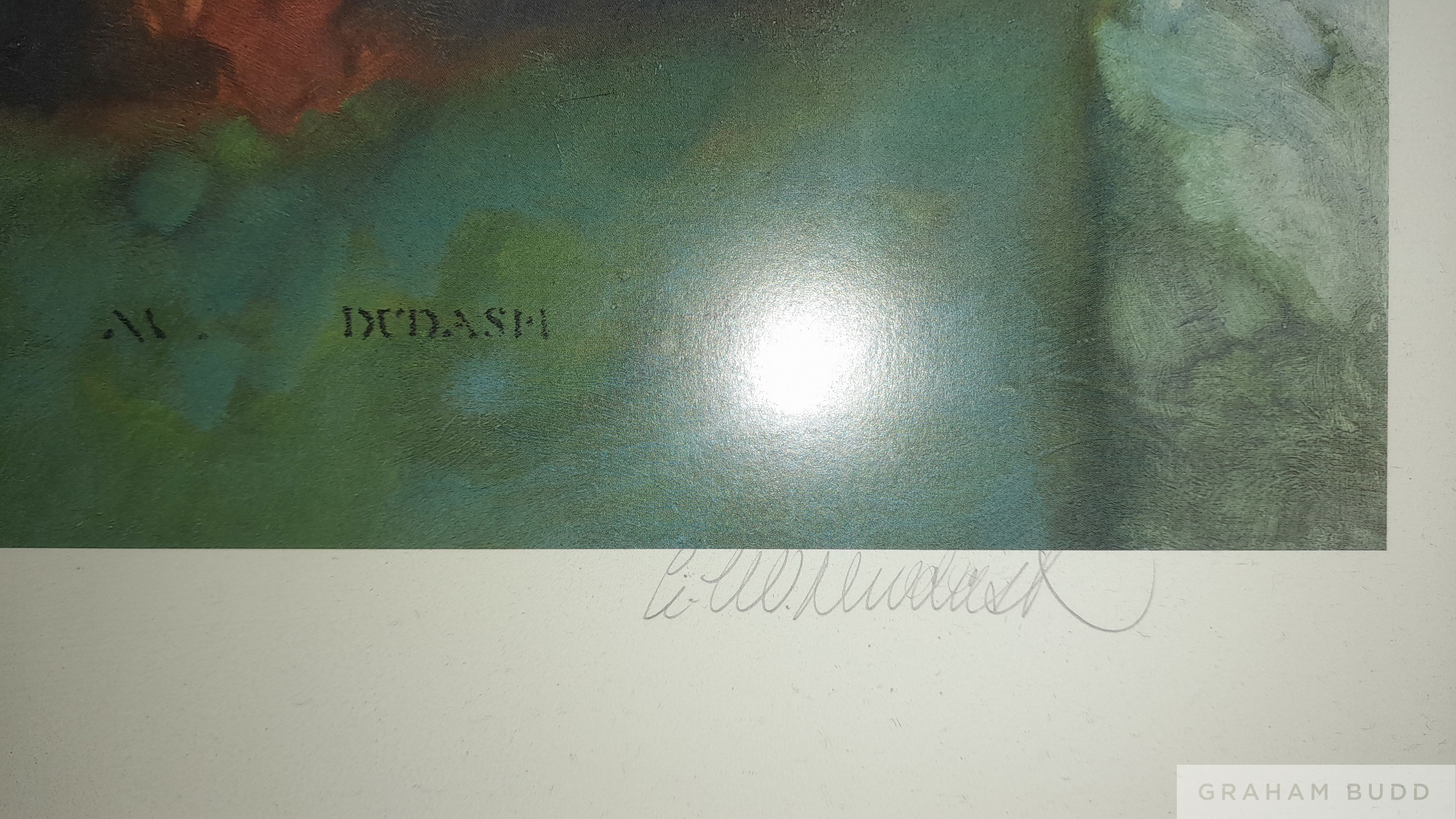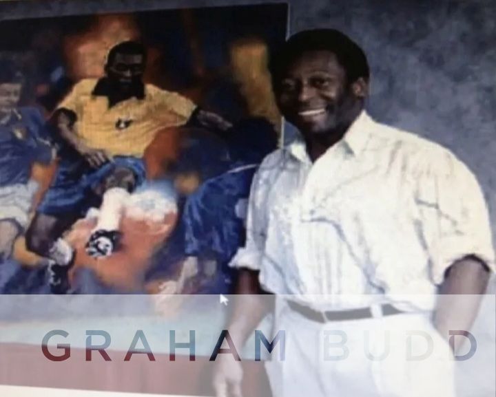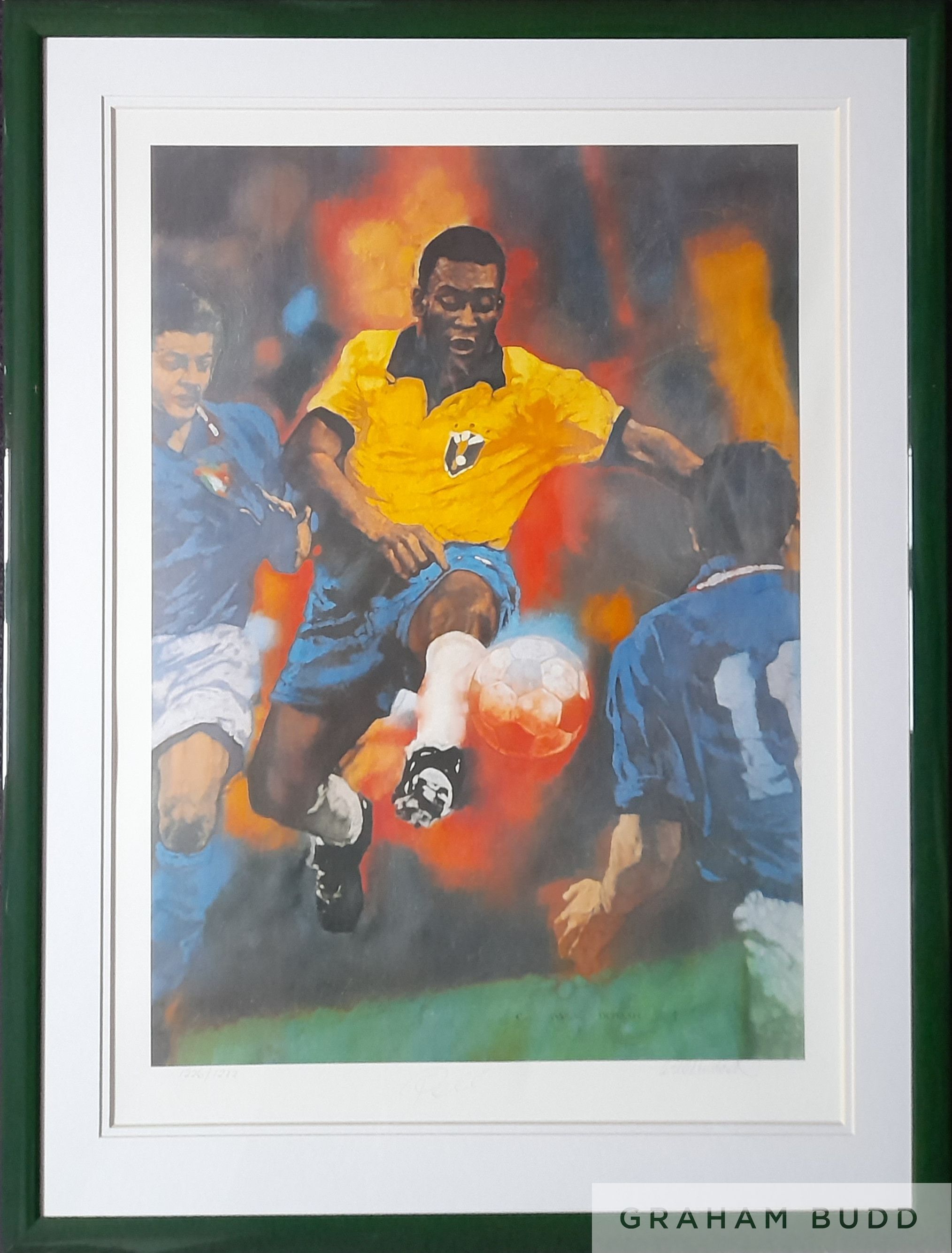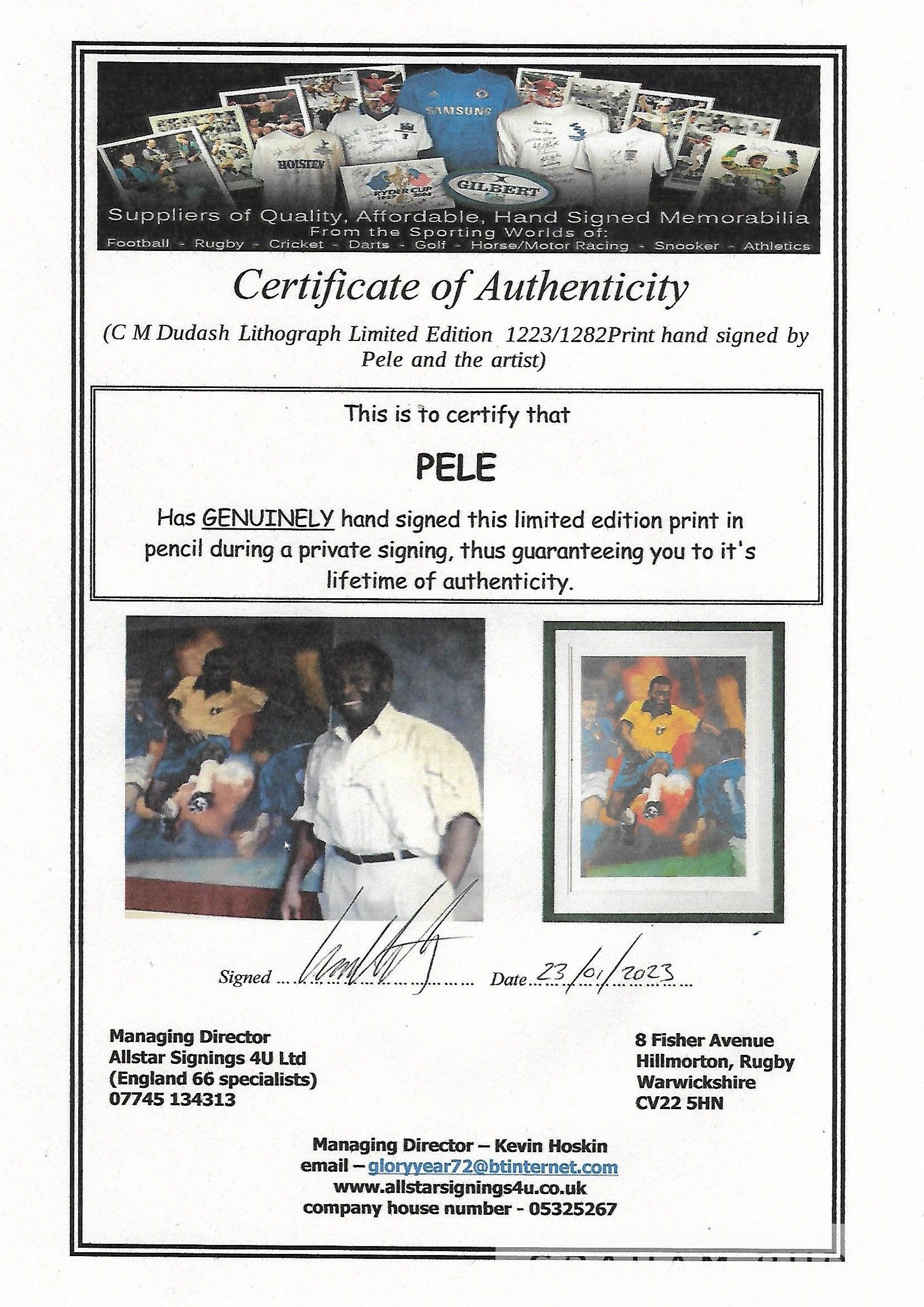 Limited edition signed Pele print, original by C M Dudash a named American artist, print 1223 out of 1282 world wide, representing the number of goals Pele scored. Print depicts action during the 1970 World Cup Final Brazil v Italy. These prints were sold internationally signed by Pele and artist in pencil with each individually numbered. Framed and glazed to measure 34 by 25.5in., comes with COA along with image of Pele standing by the original painting All glass will be removed from framed and glazed items prior to posting and may result in delays to shipping your items. (This service is included in the cost of postage and packing). We can also totally remove all framing and mounts upon request to reduce shipping costs. Alternatively, lots can be collected in person by prior appointment from NN8 1RT.